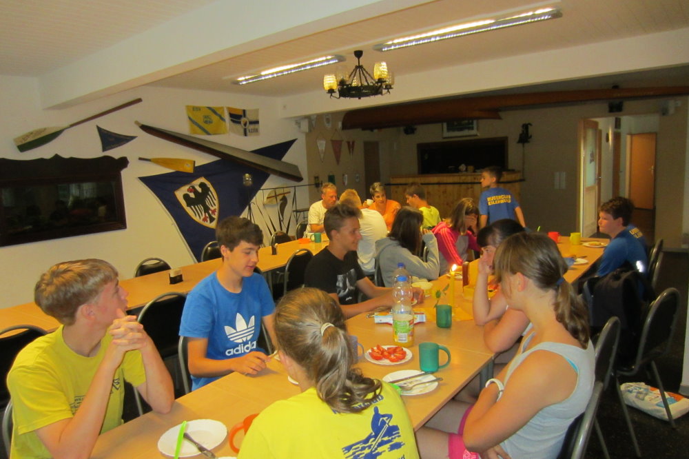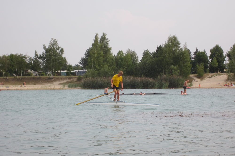 Traditionell in der 5. Ferienwoche trafen sich 13 Sportler unterschiedlichen Alters und ruderischer Fähigkeiten auf heimischem Gewässer zu ihrem Trainingslager. In diesen 5 Tagen verbesserten die Junioren vor allem ihre Kraft- und Ausdauerfähigkeiten und stabilisierten ihr technisches Können. Durch die anhaltende Hitze war nur ein morgendliches Wassertraining von 8.00 Uhr – 10:30 Uhr auf der Kiesgrube möglich. Anschließendes Schwimmen und Baden sorgten für Abkühlung und Spaß.Nach dem Mittagessen im Strandimbiss ging es per Fahrrad wieder ins Bootshaus, wo wir unsere Zelte aufgeschlagen hatten. Die Kellerräume des Bootshauses ermöglichten einen Aufenthalt bei gemäßigten Temperaturen. Mittagsruhe für die Jüngsten und Spaß bei Poker und Roulette für die älteren Sportler waren eine Voraussetzung für eine zweite Krafttrainingseinheit am Nachmittag. Gegen Abend fuhren wir nochmals zum Baden an die Kiesgrube.
