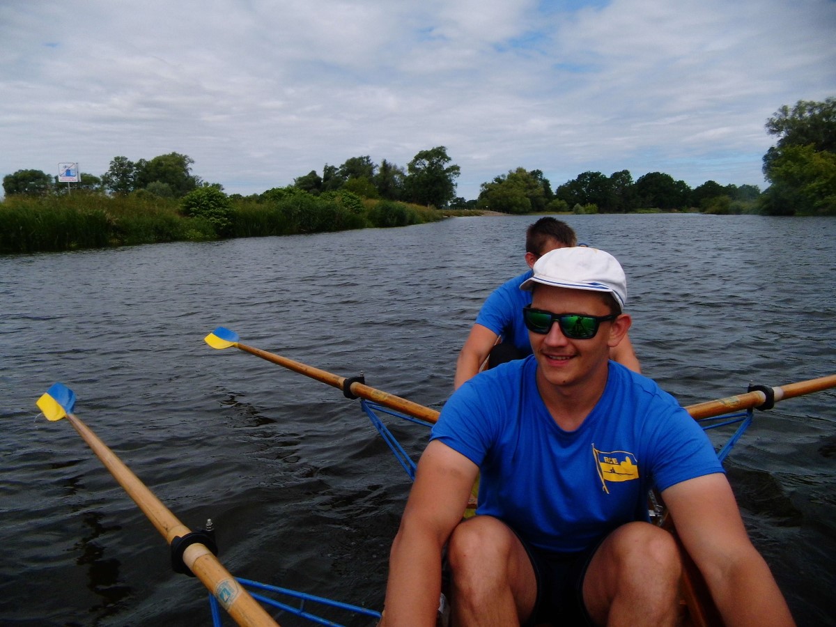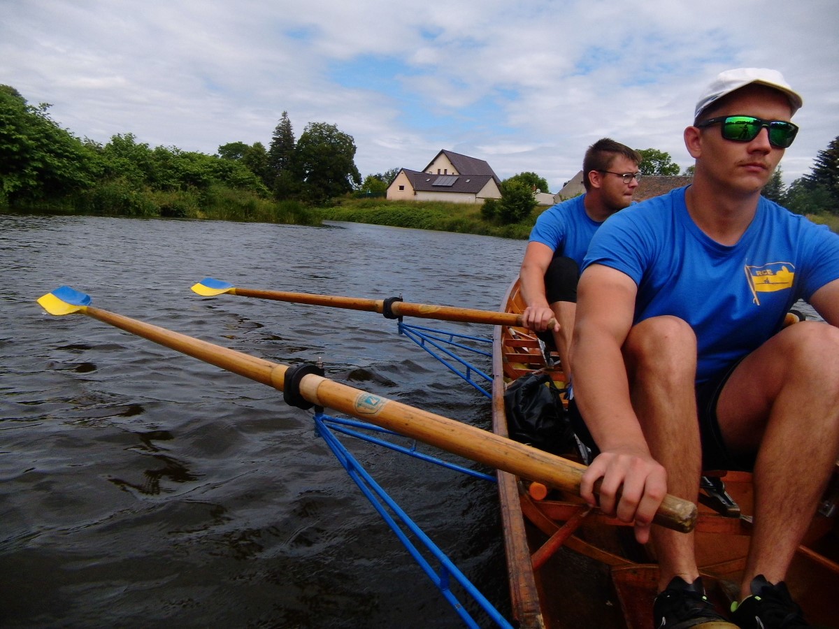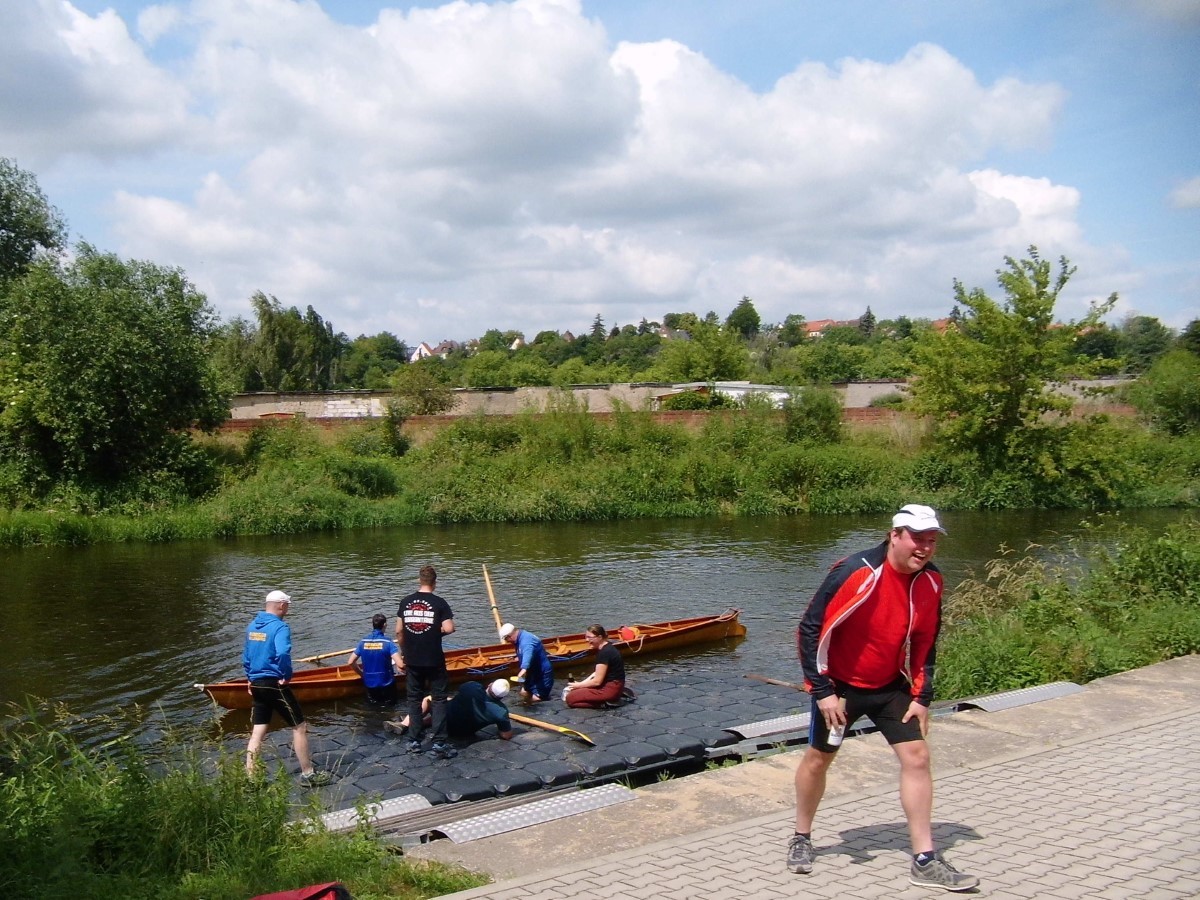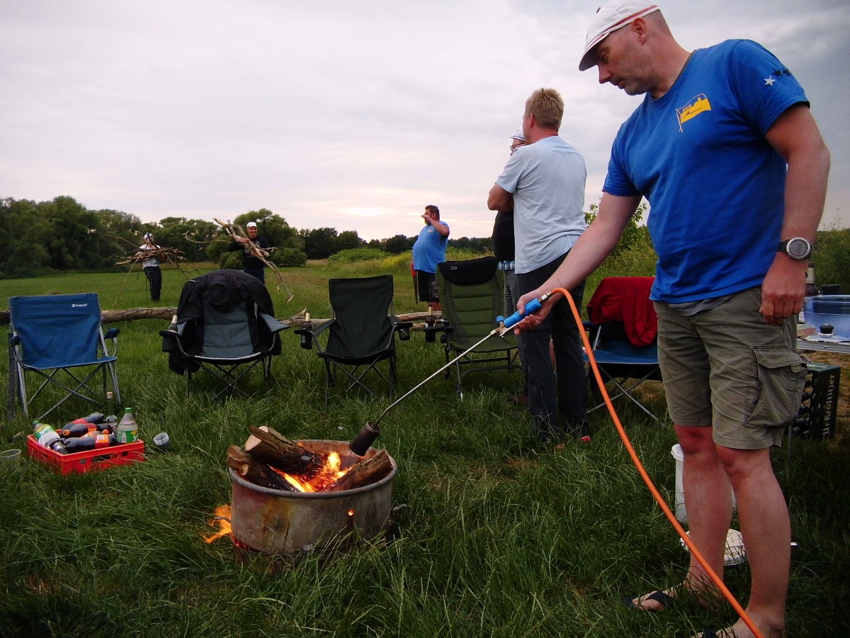 Zum Warmup wurde am Freitagabend am Bootshaus gegrillt und entsprechende Geselligkeit bis zur Morgendämmerung gepflegt. Am späten Samstagvormittag kamen dann endlich die Boote aufs Wasser. Ohne Eile und mit den gebotenen Boxenstops erreichte man komplikationslos den Bobritzer Damm, wo nochmals ausgedehnt pausiert wurde. Die Mannschaft der „Schwalbe" hatte geplant, den vorgesehenen Landeplatz zwischen Groitzsch und Püchau vorerst zu passieren und zumindest bis zur Brücke in Canitz zu fahren. Dieses wurde dank kräftigem Schiebewind gegen die mitunter ordentliche Strömung ohne weiteres umgesetzt. Man erreichte nach der Umkehr dennoch als erstes Boot das Lager. Hier duftete es schon lecker aus zweierlei Dutch-Ofen-Kesseln nach "Johnnys Kanada-Töpfchen" und Käsekuchen. Veikko und Peter hatten ganze Arbeit geleistet, um die entbehrungsreiche Anfahrt zu kompensieren. Nach und nach trudelten alle Besatzungen mehr oder weniger versehrt am Zielpunkt ein. Das gute alte Panzertape... Aus traditioneller Verbundenheit stießen noch einige Landratten mit unterschiedlicher Motorisierung zur Truppe hinzu. Bei Lagerfeuer und Mucke wurde eine der kürzesten Nächte des Jahres angemessen verbracht.