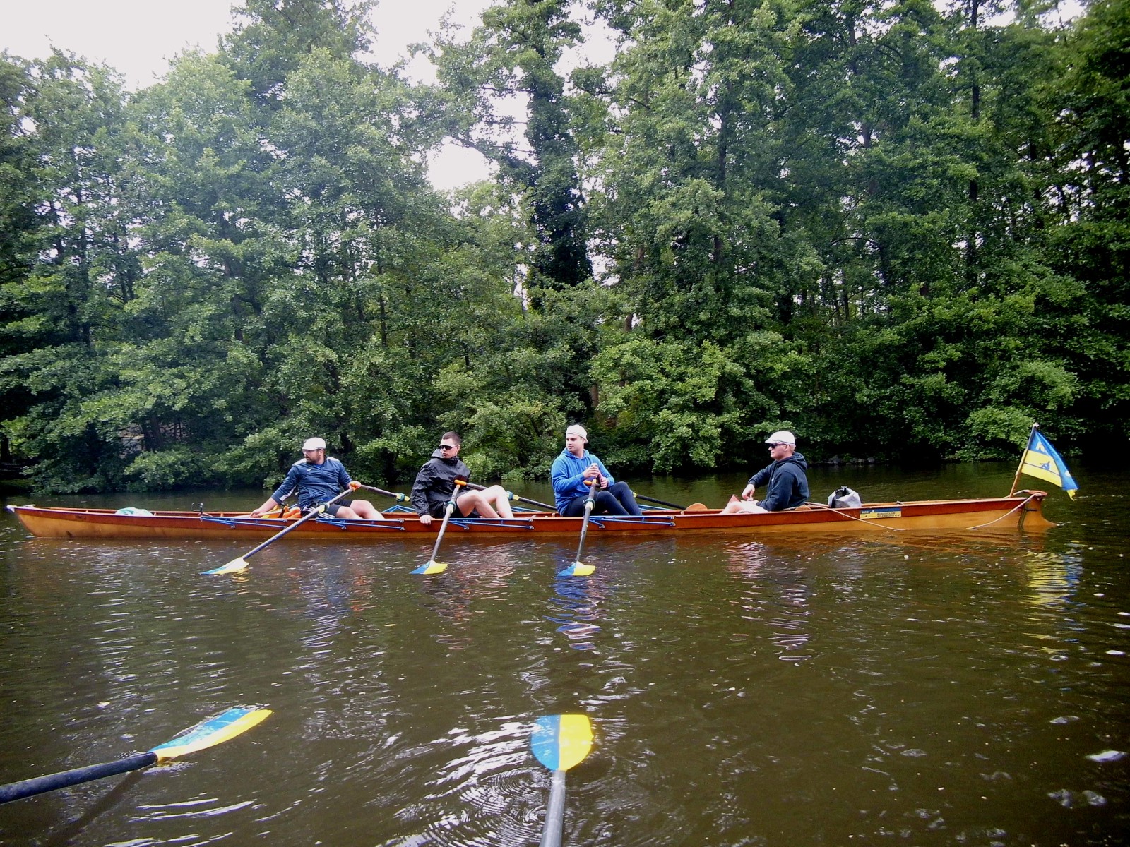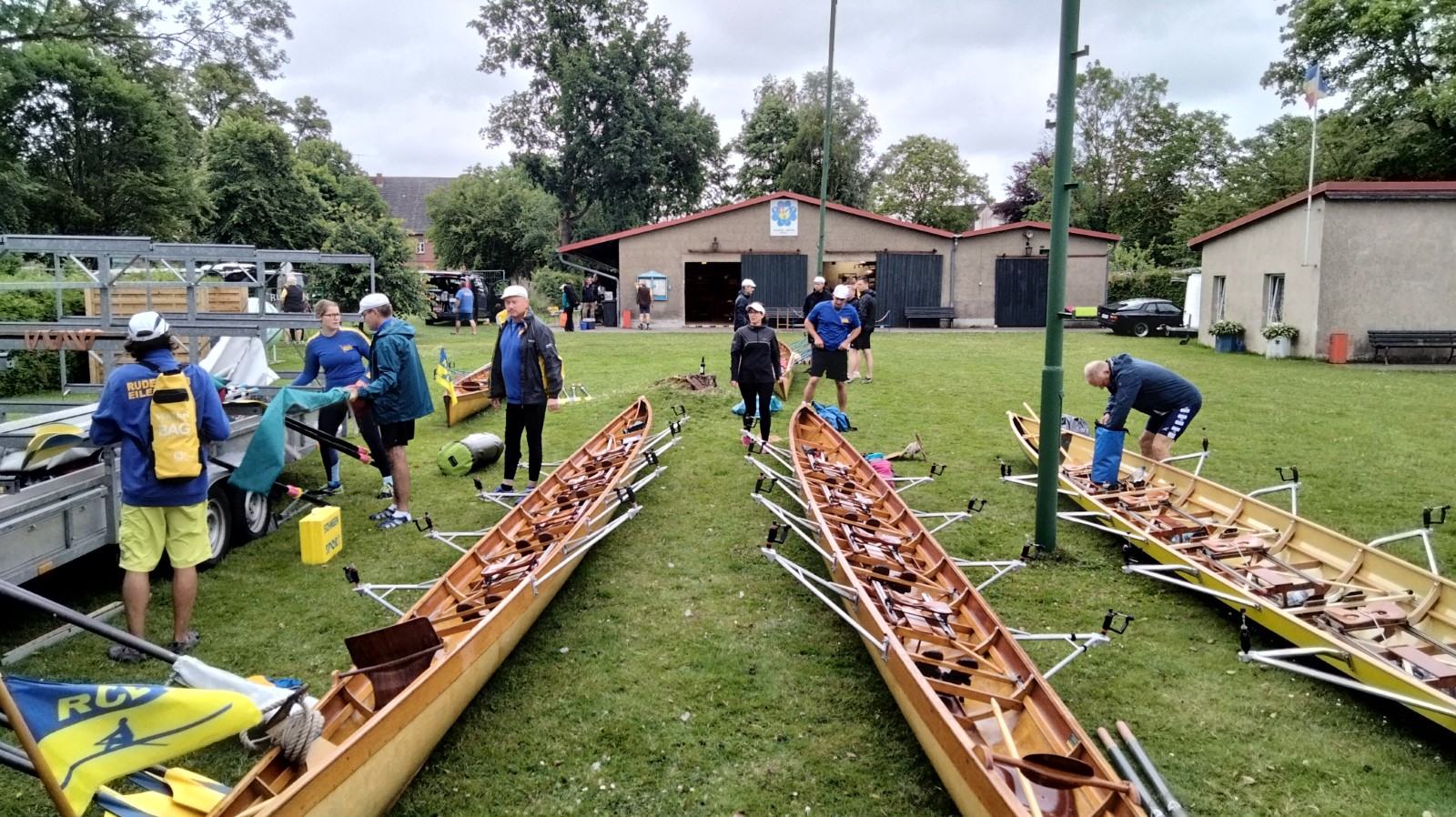 Zwischen 13 und 15 Uhr fanden sich die meisten auf der Piste ein. Aufgrund hoher Bustransfer-Kosten wurde im Vorfeld die individuelle Variante favorisert. Teilweise waren heftige Unwetter zu durchfahren. Stau auf der A10-Dauerbaustelle bei Werder, Umfahrungen genauso dicht. Einige meldeten sich vorsichtshalber von der reservierten Abendgastronomie ab und landeten in Neuruppin beim Griechen. Zufällig nebenan der aus alten Zeiten bekannte Ruderclub. Quartier dann bei den Mirower Ruderkameraden. Erstmal Hänger abladen, die einen bauten Zelte auf, andere nahmen mit der Gemeinschaftsbutze Vorlieb. Themen der ersten Lagebesprechung: wetterbedingte Routenänderung und Zeitdruck wegen hohem erwartetem Andrang bei einziger Schleuse. Im letzten Mittsommerlicht hatte man die meisten Boote noch fix angeriggert. Nächtliches Finale in gemeinsamer Runde am Steg.