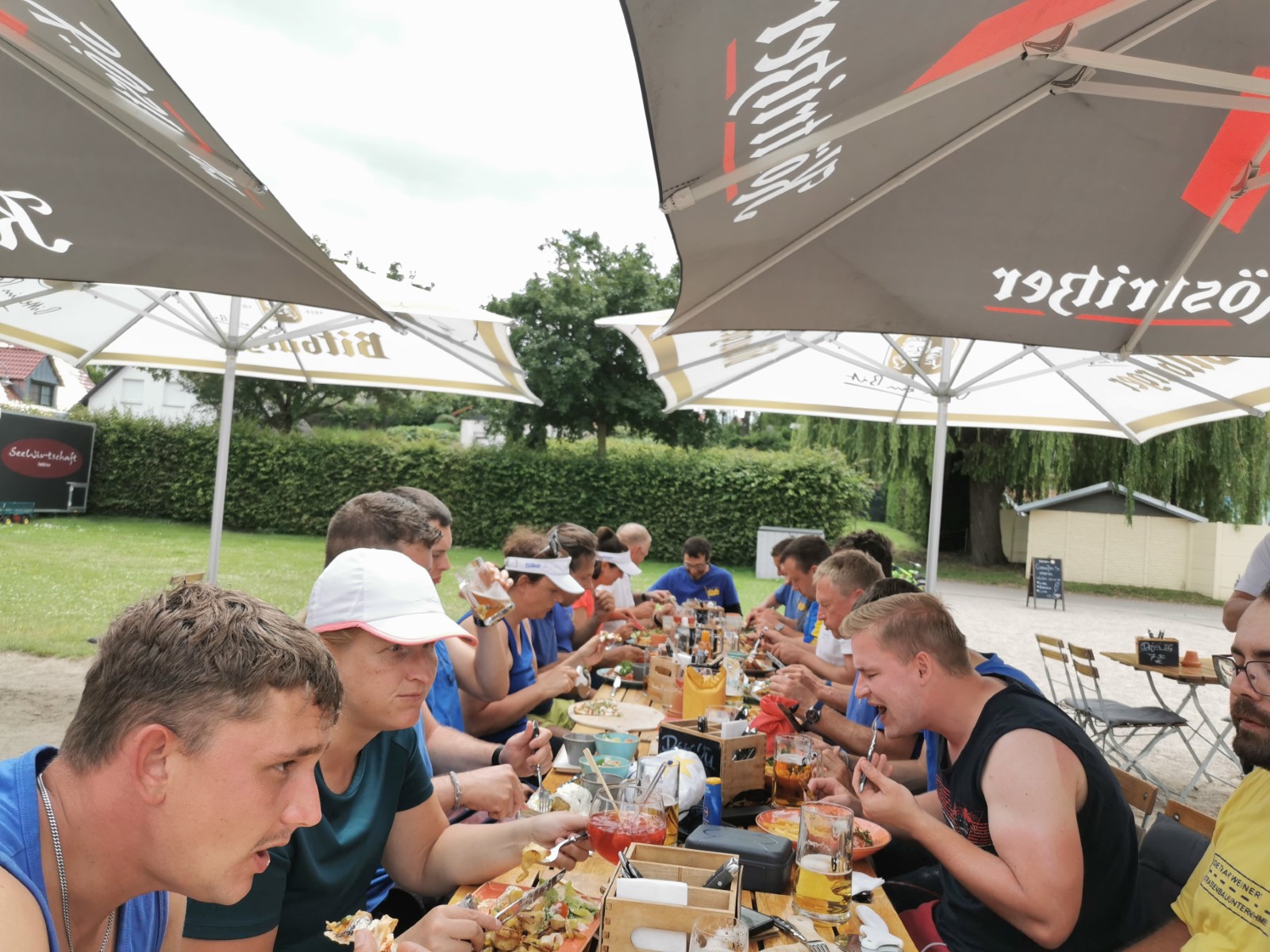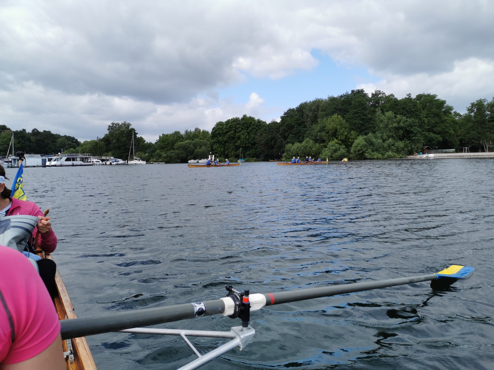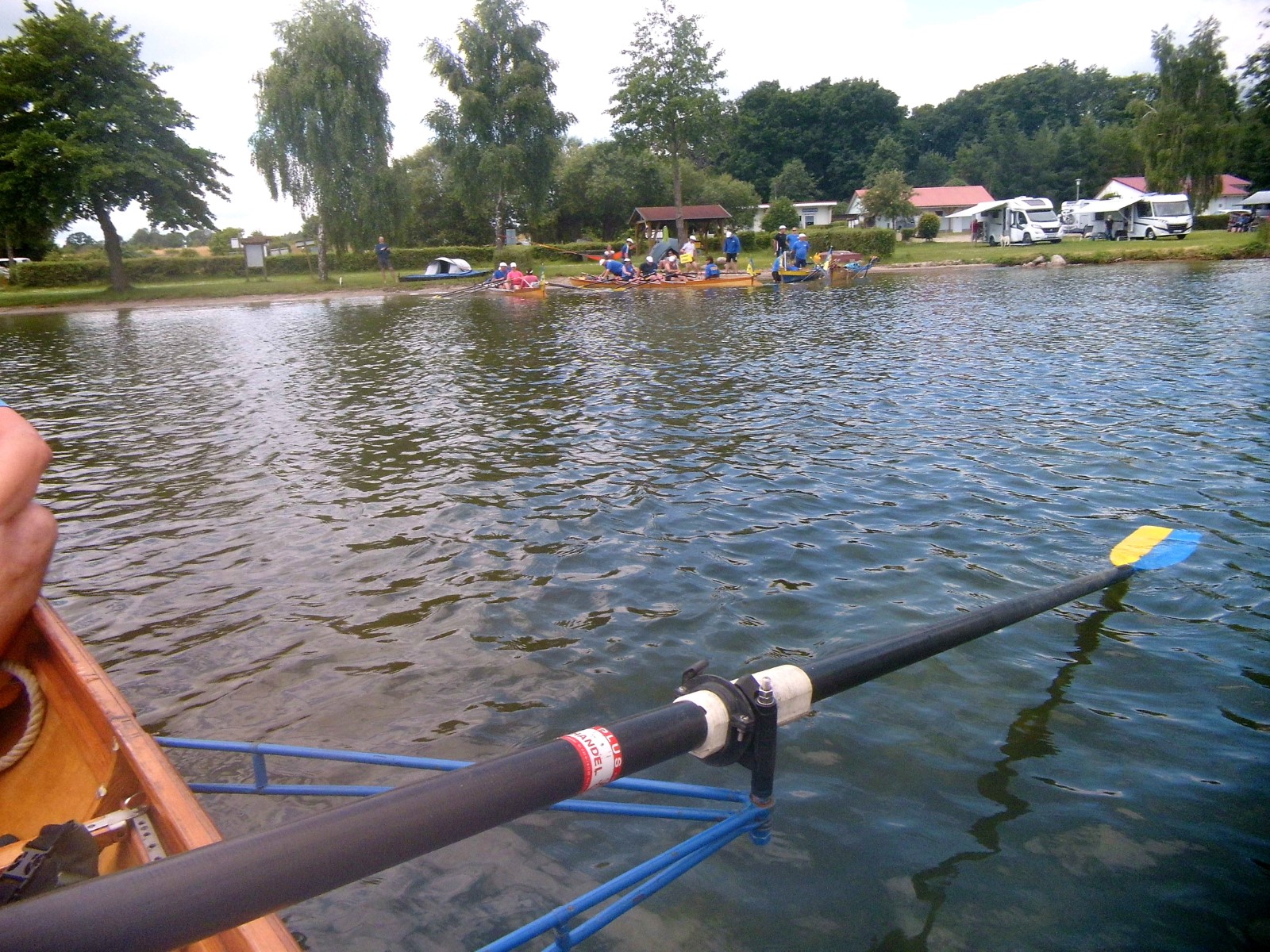 Die besuchten Zeltplätze waren einer schöner als der andere, mit ansprechenden sanitären Anlagen, Strom und Wasser an jedem Platz verfügbar. Für die letzten paar Kilometer war wieder ein strahlender Morgen im Angebot. Ein spiegelglatter See und sommerliche Temperaturen luden zum Bade. Dementsprechend verabredete man sich zur Badepause am Plauer Werder. Seit der Einfahrt in die Müritz war die Wasserqualität der Seen erstaunlich gut, meistens konnte man bis auf den Grund sehen. Einigen Wellen musste man dank ignoranter PS-Helden noch ausweichen, dann war das letzte Etappenziel in Sicht. Die Badewiese des Campingplatzes war zum Glück nicht übermäßig belegt. Im Schatten fanden die Boote genügend Platz zum Abriggern, während die Fahrzeuge aus Mirow geholt wurden. Der Bootshänger musste noch fix bis zur 13-Uhr-Mittagsruhe in Position gebracht werden, was nicht ganz einfach war. Nun hatte man 2 Stunden Zeit für das Beladen und das (erstaunlich leckere) Mittagessen in der nächstbesten Pizza- und Burgerbar. Schnell noch das obligatorische Gruppenfoto vor dem Hänger und ab auf die Piste. Gnädigerweise hielt sich die Verzögerung bei Werder in Grenzen, so dass alle einigermaßen pünktlich und wohlbehalten zu Hause ankamen. Ein großes Lob und Dankeschön geht raus an den Wanderruderwart und Fahrtenleiter Niclas, die Landdienstler und Hängerfahrer Veikko, Matthias und Jürgen, die PKW-Fahrer und alle, die ihren Teil zum Gelingen beigetragen haben.