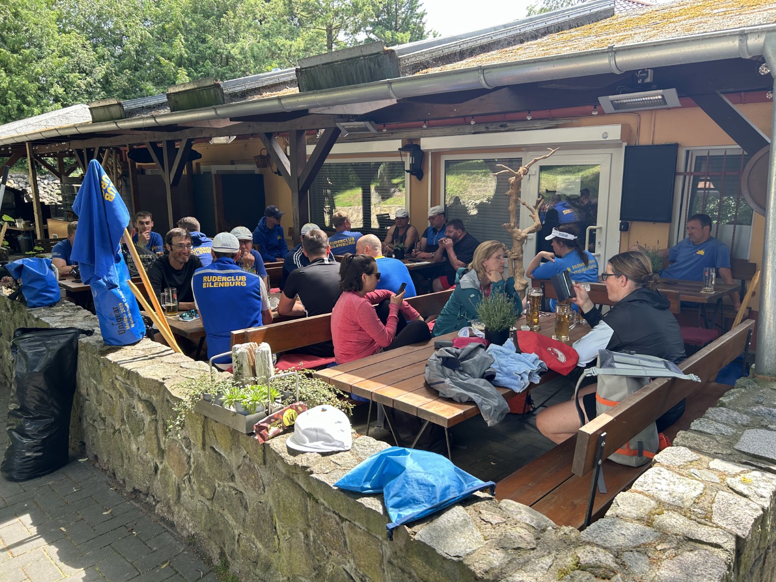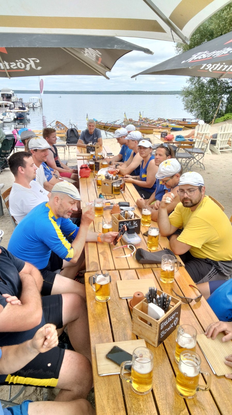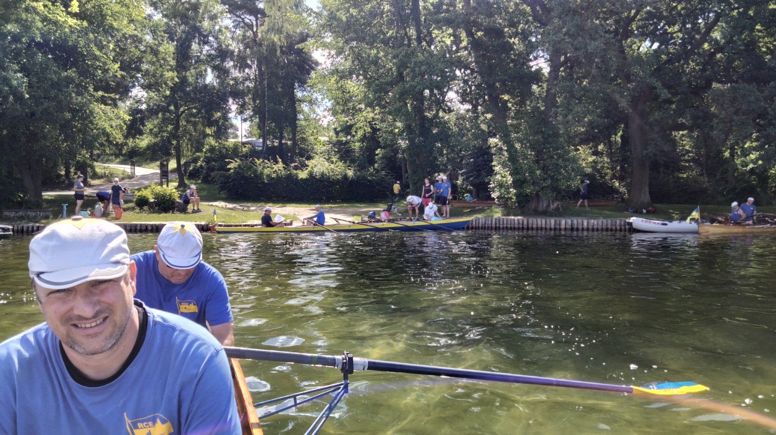 Nach der Einfahrt in die kleine Müritz machten wir schon mal eine erste Bekanntschaft mit dem strammen Westwind, vor allem bei der Anfahrt an das östlich gelegene Rechliner Mittagsziel. Die meisten bogen in den Yachtbereich ein, wofür der Hafenmeister eine saftige Liegegebühr kassierte. Sowas war neu und sollte uns noch einige Male auf der Fahrt passieren. Der gute Mann prophezeite aktuell und bis in den Abend hinein 1,5 Meter hohe Wellen auf der Müritz und hoffte wohl auch auf weitere Einnahmen. Vorerst sprach man dem gepflegten gastronomischen Angebot der Hafengaststätte zu und diskutierte das Für und Wider der weiteren Tagesplanung. Diese hatte eine überwiegend windgeschützte Route unter Land vorgesehen. Dennoch entschied sich eine Mannschaft für den sicheren Transfer mit dem Bootshänger. Drei Vierer und ein Zweier nahmen den Wasserweg und sollten es trotz zweier Passagen mit Anspruch nicht bereuen. Tolles Gefühl, kurz vor der Ausfahrt die ostseeartige Weite der Müritz in ihrer ganzen Länge wahrzunehmen. Auf dem Weg nahm man eine angenehme Baderast am Campingplatz Ludorf mit, bevor es etwas spezieller wurde. Am Ende gab es verschiedene Taktiken gegen die Wellen. Die einen versuchten es im 90°-Winkel und mussten hin und wieder schöpfen, waren aber die schnellsten. Andere kreuzten mehr oder weniger leicht gegen den Wind und kamen so zurecht. Die ‚Marienburg' war mit rudern, steuern und pausieren komplett ausgelastet und gelangte daher etwas abgeschlagen und wasserlastig ans sichere Röbeler Ufer. Kaum waren die Boote an Land, wartete die nächste Erfrischung an „Marie‘s Strandbar“. Bald standen auch die Zelte am Campingplatz „Pappelbucht“. Frisch geduscht machte man sich auf den Weg in die Gaststätte „Regattahaus“, wo in fröhlicher Runde angemessen gespeist und getrunken wurde. Danach ließen sich einige von herüber schallender Musik zur Hafenparty locken. Der Rest machte es sich im Zeltlager bequem, wo zu später Stunde noch die Welturaufführung von Franks beeindruckenden Dokumentarfilm zur 2022er Unstrut-Saale-Wanderfahrt des RCE auf Leinwand gebeamt wurde.
