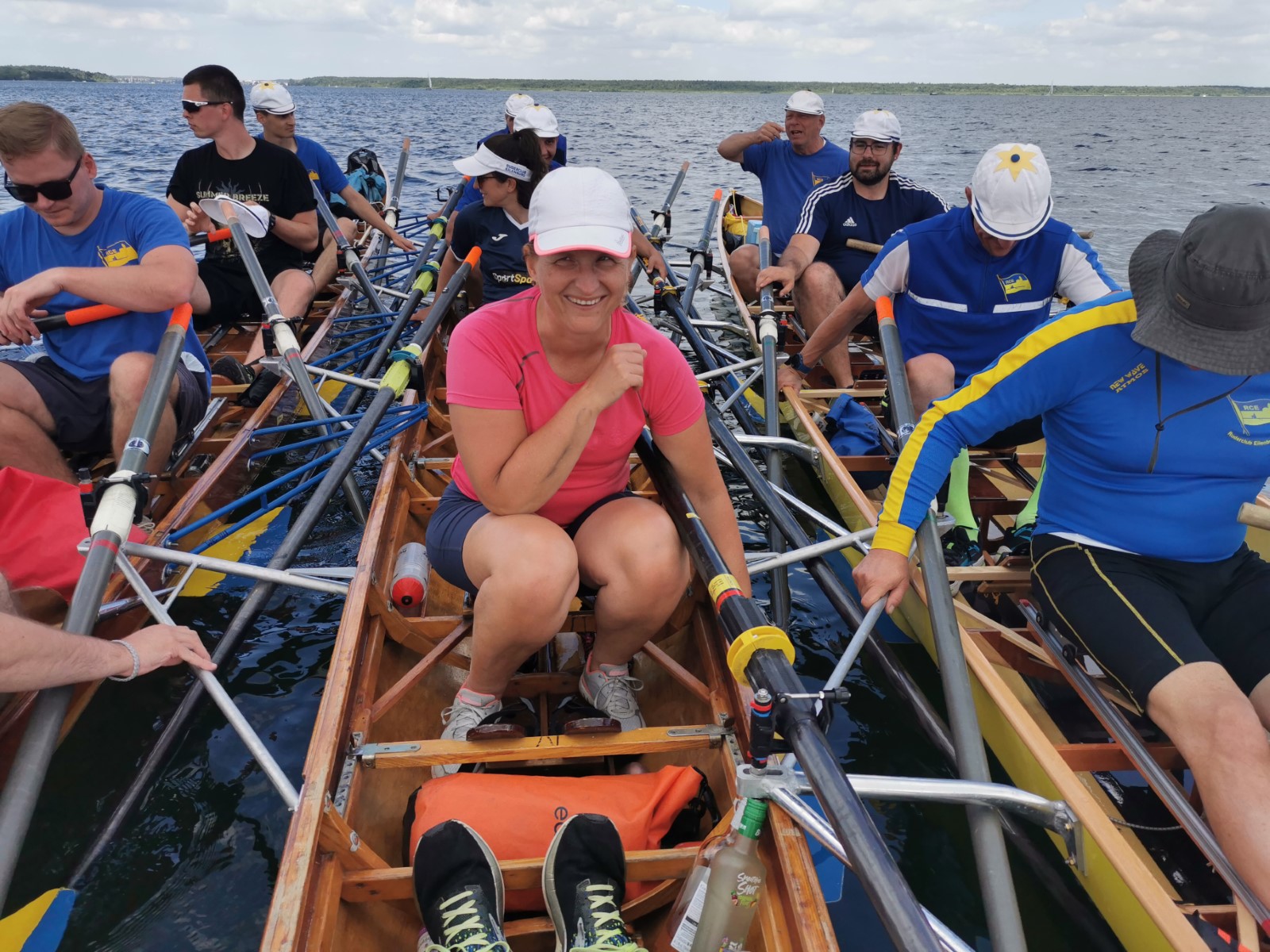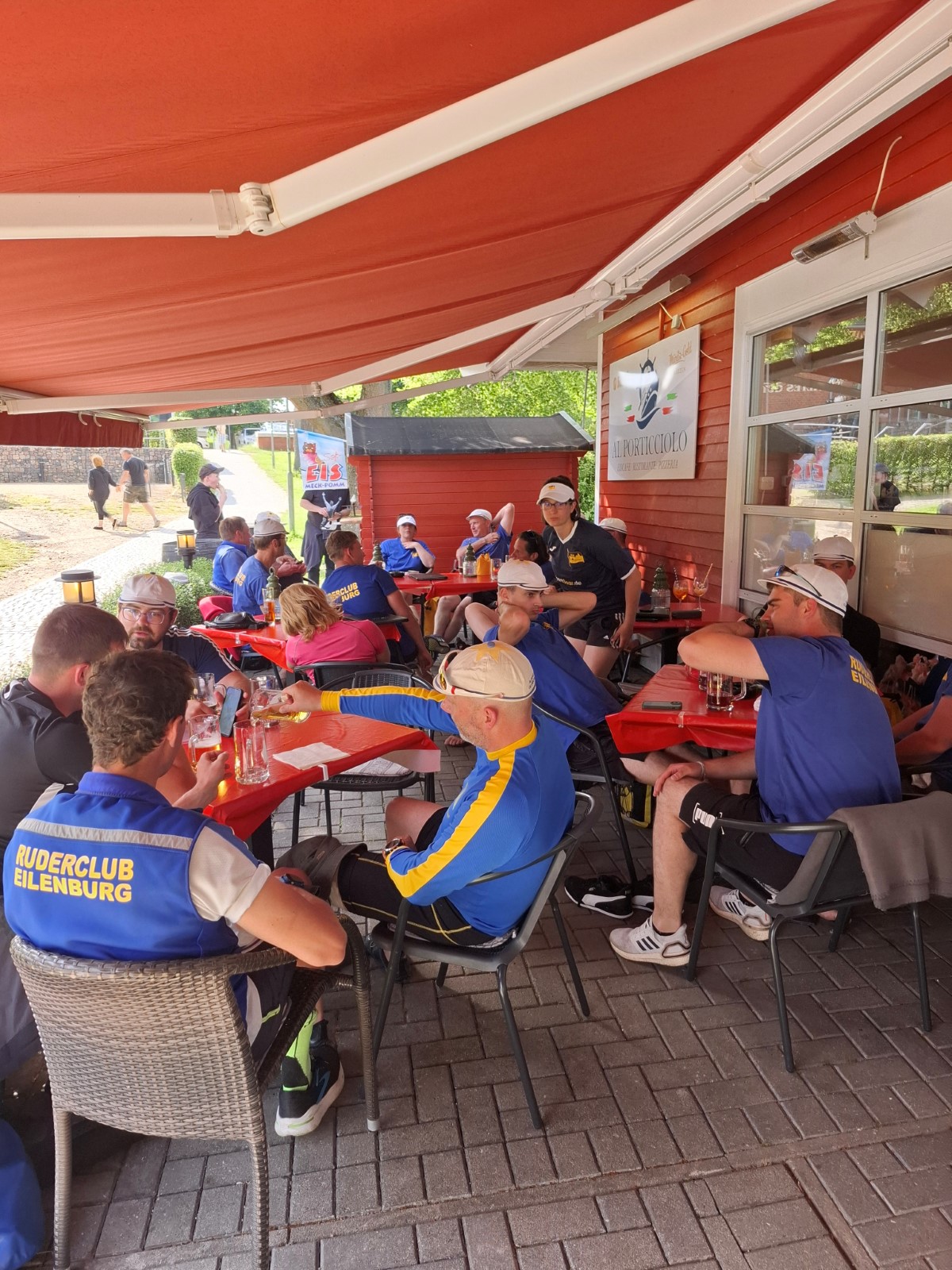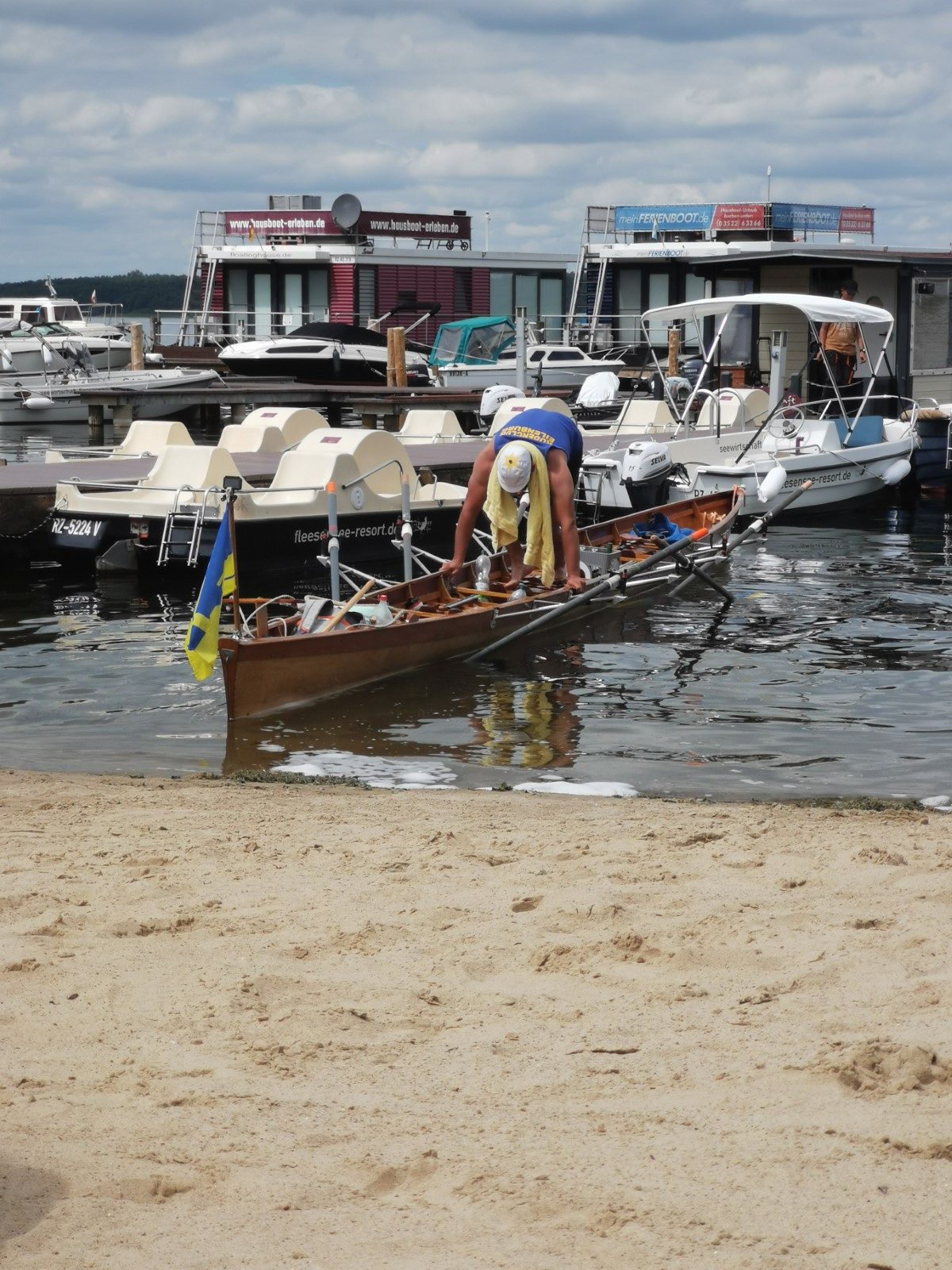 Nach der Einfahrt in die kleine Müritz machten wir schon mal eine erste Bekanntschaft mit dem strammen Westwind, vor allem bei der Anfahrt an das östlich gelegene Rechliner Mittagsziel. Die meisten bogen in den Yachtbereich ein, wofür der Hafenmeister eine saftige Liegegebühr kassierte. Sowas war neu und sollte uns noch einige Male auf der Fahrt passieren. Der gute Mann prophezeite aktuell und bis in den Abend hinein 1,5 Meter hohe Wellen auf der Müritz und hoffte wohl auch auf weitere Einnahmen. Vorerst sprach man dem gepflegten gastronomischen Angebot der Hafengaststätte zu und diskutierte das Für und Wider der weiteren Tagesplanung. Diese hatte eine überwiegend windgeschützte Route unter Land vorgesehen. Dennoch entschied sich eine Mannschaft für den sicheren Transfer mit dem Bootshänger. Drei Vierer und ein Zweier nahmen den Wasserweg und sollten es trotz zweier Passagen mit Anspruch nicht bereuen. Tolles Gefühl, kurz vor der Ausfahrt die ostseeartige Weite der Müritz in ihrer ganzen Länge wahrzunehmen. Auf dem Weg nahm man eine angenehme Baderast am Campingplatz Ludorf mit, bevor es etwas spezieller wurde. Am Ende gab es verschiedene Taktiken gegen die Wellen. Die einen versuchten es im 90°-Winkel und mussten hin und wieder schöpfen, waren aber die schnellsten. Andere kreuzten mehr oder weniger leicht gegen den Wind und kamen so zurecht. Die ‚Marienburg' war mit rudern, steuern und pausieren komplett ausgelastet und gelangte daher etwas abgeschlagen und wasserlastig ans sichere Röbeler Ufer. Kaum waren die Boote an Land, wartete die nächste Erfrischung an „Marie‘s Strandbar“. Bald standen auch die Zelte am Campingplatz „Pappelbucht“. Frisch geduscht machte man sich auf den Weg in die Gaststätte „Regattahaus“, wo in fröhlicher Runde angemessen gespeist und getrunken wurde. Danach ließen sich einige von herüber schallender Musik zur Hafenparty locken. Der Rest machte es sich im Zeltlager bequem, wo zu später Stunde noch die Welturaufführung von Franks beeindruckenden Dokumentarfilm zur 2022er Unstrut-Saale-Wanderfahrt des RCE auf Leinwand gebeamt wurde.