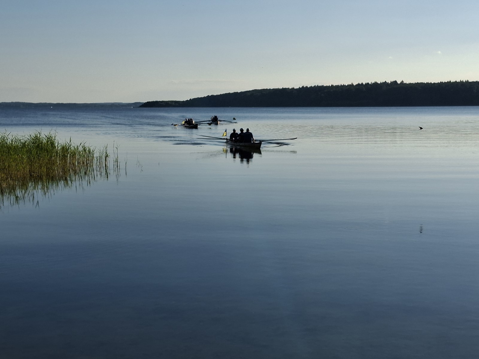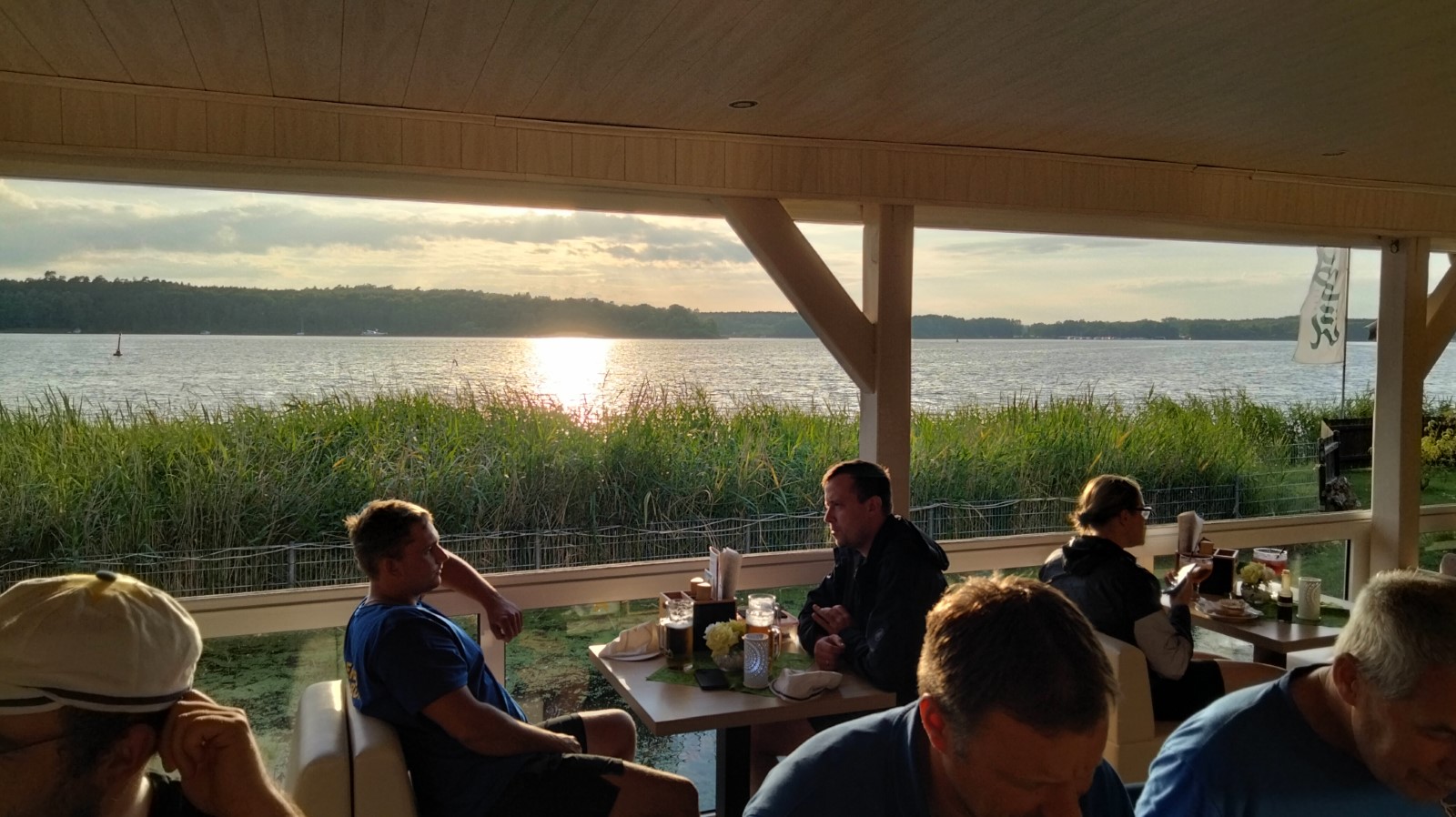Bei strahlender Morgensonne und angenehmen Temperaturen kam ein Boot nach dem anderen über die schmale Einsatzstelle unter hohen Bäumen aufs Wasser. Es standen nur etwa 12 Kilometer auf dem Plan, deshalb wollte man den Tag ruhig angehen. Schon am Campingplatz Nitschow deshalb die erste Rast, wo der Wirt seine Imbissbude uns zu Liebe vorzeitig öffnete. Nach der nächsten Landspitze schob der mäßige Wind wieder etwas mehr Wellen zusammen, die man jedoch routiniert zu nehmen wusste. Schließlich lockte Sietow-Dorf zum Mittagstisch mit Fischbrötchen und Flammkuchen in einem neu eröffneten Lokal. Der Bäcker und seine Frau hatten ihre liebe Not mit unserem Ansturm auf Ofen und Ausschank, verabschiedeten uns am Ende aber glücklich und zufrieden. Danach ging es unter Land weiter bis nach Klink mit beeindruckendem Neorenaissance-Schloss und vor allem einem Ristorante mit rotblondem Müritz-Gold vom Fass, wahlweise auch Aperol oder Limoncello -Sprizz. Im schattigen Freisitz verging die Zeit schneller als gedacht. Nun noch die letzten beiden Kilometer auf dem größten deutschen Binnensee... und die Reservierungszeit im Lokal "Seebad" war gerissen. Wir kamen aus unserer Sicht 30 Minuten zu spät, das Personal ging von einer Stunde aus. Und machte an diesem Sonntagabend aus ihrem Mangel an Begeisterung keinen Hehl. Zumindest die Bedienung nahm es sportlich. Das wunderschöne Panorama mit Abendsonne machte auch einiges wett, es reichte jedoch nicht zur vollen kulinarischen Zufriedenheit. Zur Rückkehr lief schon die heftig umstrittene Fußball-EM-Partie Deutschland gegen Schweiz. Das Campingplatz-Bistro hatte mehrere große Bildschirme im Freisitz verteilt, hier und da fand sich noch ein Plätzchen für den geneigten Wanderruderer. Alle anderen klönten noch geraume Zeit im Stuhlkreis zwischen Fahrzeug und Bootshänger bei den Zelten. Nach dem 1:1 kehrte auch hier irgendwann Ruhe ein.