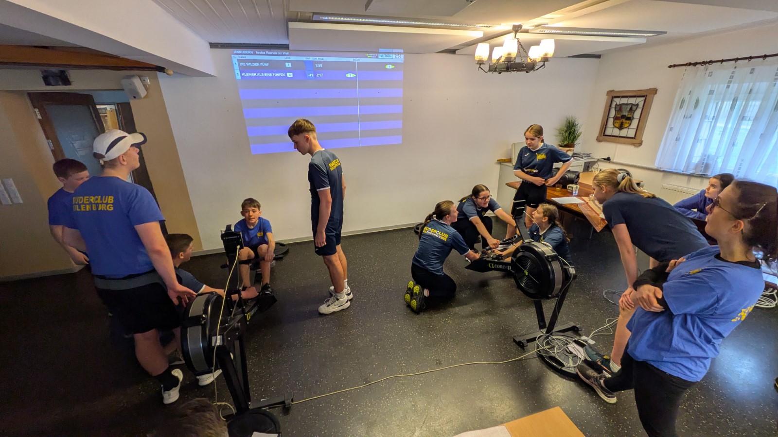 Der Vormittag ist traditionell der Ergometer-Vereinsmeisterschaft vorbehalten. Das war auch diesmal der Fall. Kinder, Jugendliche und auch einige Erwachsene stellten sich dem Wettkampf. Maximal drei Sportler konnten im Einer-Rennen direkt gegeneinander antreten, je nach Alter über die 500-, 750- oder 1000- Meter- Distanz. Zum Schluss gab es noch einen Vergleich zwischen Mädeln und Jungen. Jeweils fünf davon gingen in fliegendem Wechsel über 1500m an den Start. Im Eifer des Gefechts mangelte es kurzzeitig an Kabelkontakt. Der elektronische Vorsprung war leider nicht mehr einzuholen, Sieg für die Mädels! Das Rennen wurde nicht wiederholt, die Batterien jedoch zu Mittag mit Nudeln und Wurstgulasch aus der Vereinsküche wieder aufgeladen. Danach starteten die Vorbereitungen für Kaffee und Kuchen. Das Team hat zusammen mit den Bootshausfrauen wieder großartiges geleistet.