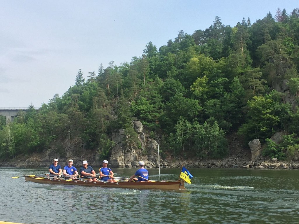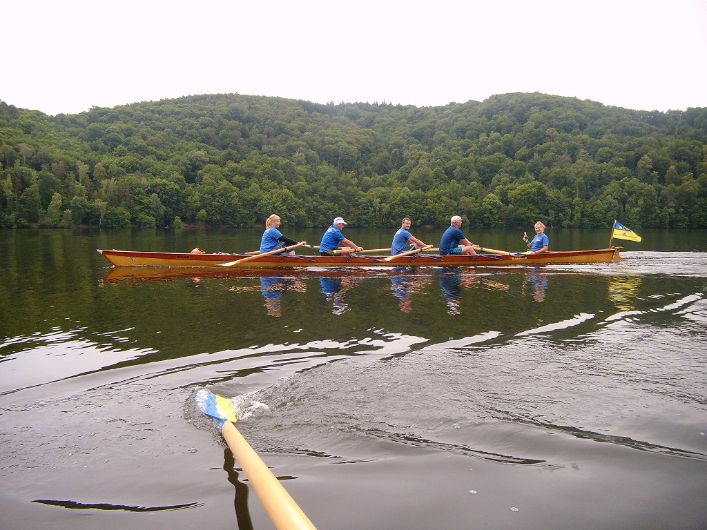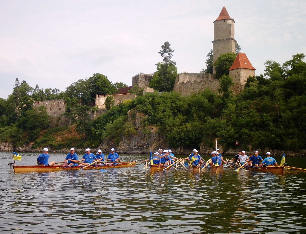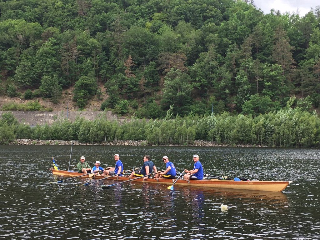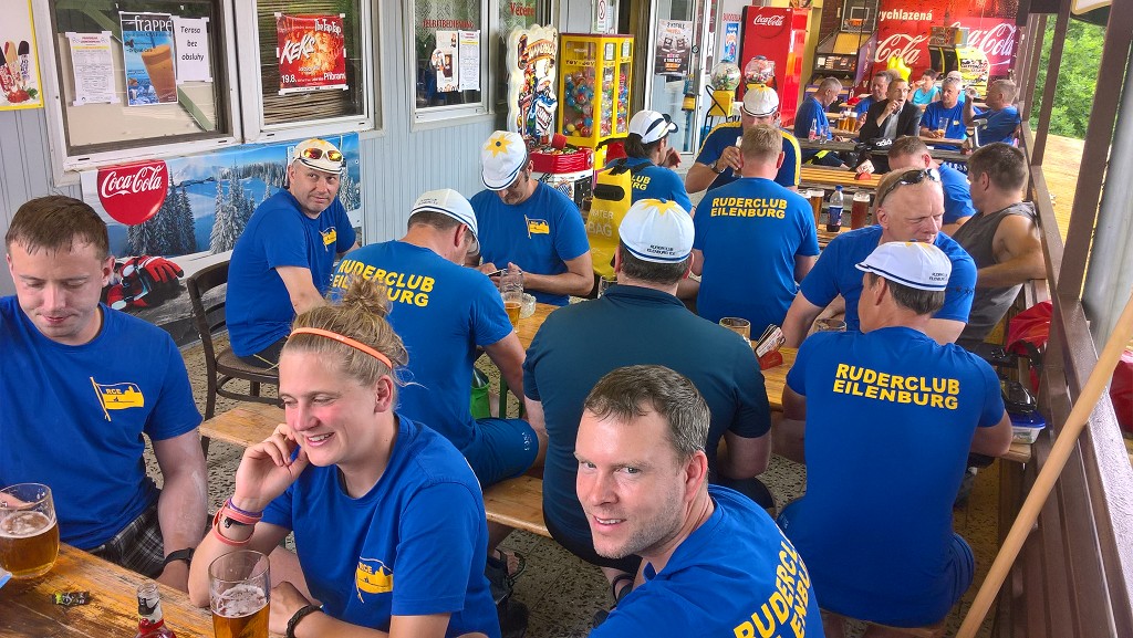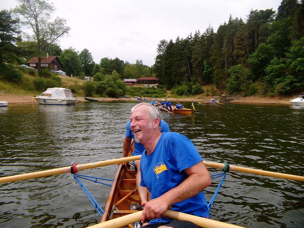 In diesem Sommer nahmen die Eilenburger Ruderer sogenanntes "Neuwasser" unter ihren Kiel. Zum ersten Mal konnten sie die herrliche Landschaft und Gastfreundlichkeit entlang des vielgerühmten Moldauflusses in Tschechien geniessen. Die etwa 30 Teilnehmer im Alter von 15 bis 65 Jahren reisten per Bus mit 6 Booten an. Über 4 Tage hinweg wurde flußabwärts eine Strecke von 105 Kilometern absolviert. Nennenswerte Strömung gab es wegen der regelmäßig vorhandenen Staustufen nicht. So hatte die Tour von Tyn nad Vltavou bis Chotilsko auch sportliche Aspekte, es mußte jeder Meter errudert werden. Übernachtet wurde in Zelten und Gästezimmern. Die Wanderfahrer bedanken sich herzlich beim begleitenden "Landdienst" und beim Busverkehr Geißler für die geduldige und professionelle Unterstützung.