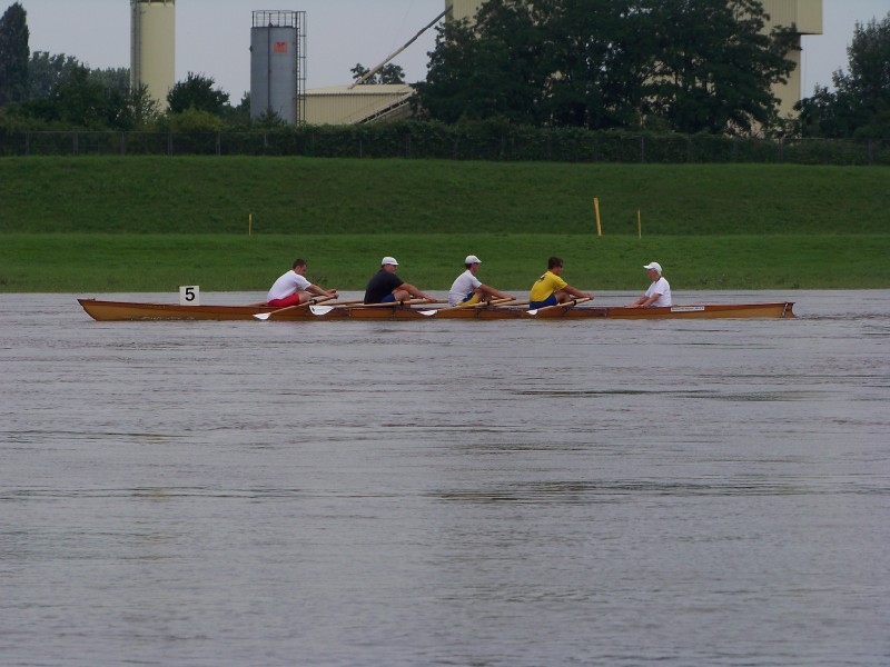 Beim Dresdner Ruderverein angekommen fand dann die erste Kontaktaufnahme mit unserer Mannschaft statt. Nach dem Umziehen fand die Einweisung und Auslosung der Startnummern statt. Von den 6 Nummern ergatterten wir uns die 5. Dann konnte es schon losgehen und da im 2 Minuten Abstand gestartet wurde, brauchten wir auch nicht lange warten. Die Bedingungen waren sehr gegensätzlich. Durch den vielen Regen im Vorfeld, überzeugte die Elbe mit einem ansehnlichen Wasserstand und der dementsprechenden Fließgeschwindigkeit. Auf der anderen Seiten blies ein heftiger Rückenwind, der uns nicht nur bremste, sondern auch gemeine Wellen produzierte. Dazu kamen die Dampfer und ihre Heckwellen. Glücklicherweise war es leicht bewölkt und die Sonne machte uns nicht ganz so sehr zu schaffen. Dennoch kamen wir ordentlich ins schwitzen.