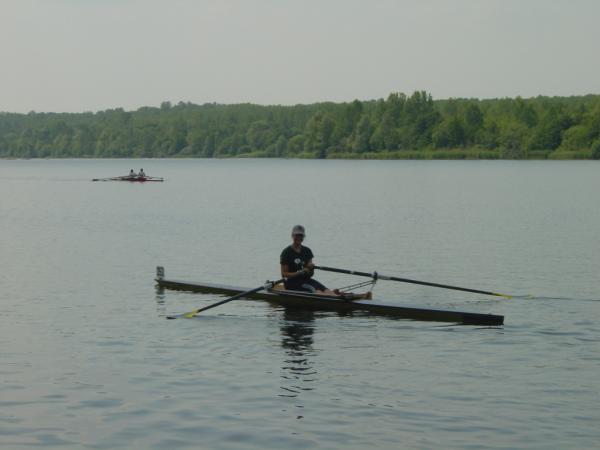 Nach der mehr als achtstündigen Anreise am Donnerstag wurde das Ruderrevier beim ersten Training erkundet – flaches Wasser mit starken Pflanzenbewuchs, jeweils zwei Starter für eine markierte Startbahn (in Eilenburg hat jeder Starter eine eigene Bahn) und sengende Hitze waren nicht gerade ideale Regattabedingungen.