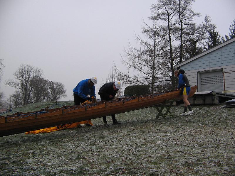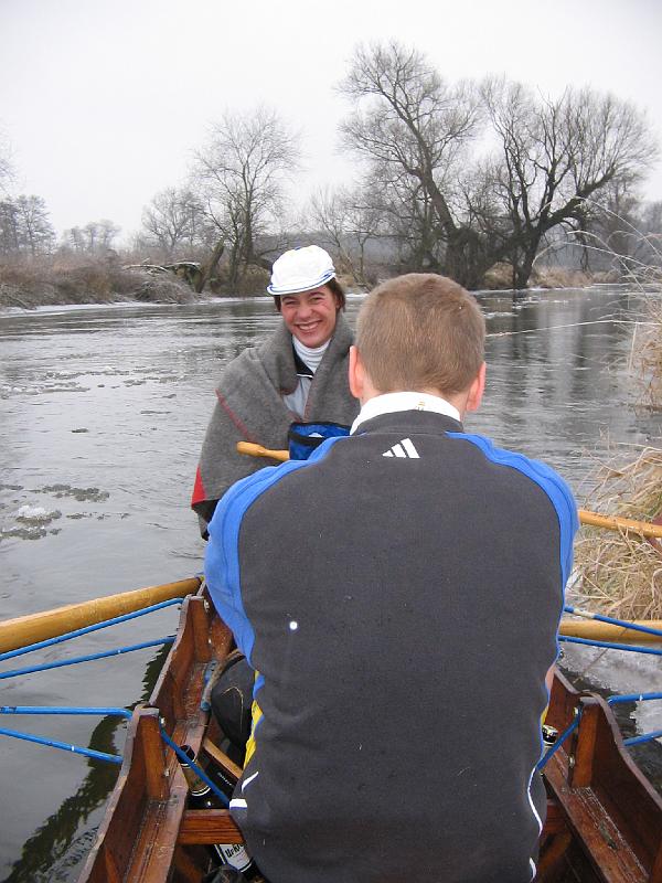 Die Fahrt bis Kilometer 4 verlief ohne Zwischenfälle. Einen herrlichen Eindruck hinterließ die absolute Stille auf den vorüberziehenden Wiesen. Sämtliche Bäume und Sträucher glänzten weiß vom Reif. Die Luft war knackig-kalt jedoch angenenehm und frisch. An der Wendestelle nahm einer der wackeren Ruderer ein Bad bis zur Hüfte im eiskalten Wasser, was uns zur beschleunigten Wende und Abfahrt veranlasste. Am Haven der Drossel wurde festgemacht, das letzte Stück bis zum Bootshaus lief sich der Pechvogel warm. Die übrigen zogen in die Gaststätte ein und bestellten schon im Voraus warme Speisen. Gut gestärkt wurden die letzten Meter wieder ohne Probleme gerudert, dann der Kahn entrümpelt und die letzen hartgekochten Eier verzehrt.