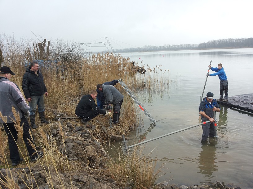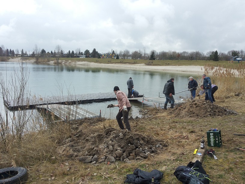 Diese Aktion mündete, was den Sektor 'Kiesgrube' betrifft, überraschend in die längst überfällige Neustrukturierung der Stegbefestigung an der Bungalowseite. Nachfolgend ein paar Schnappschüsse zu diesem kniffligen Vorhaben, das im Großen und Ganzen sogar bis Mittag abgeschlossen werden konnte. Glücklicherweise fanden sich auch am Bootshaus noch genügend Teilnehmer, um das sonstige Pensum zu erledigen. Vielen Dank allen Akteuren und Unterstützern.