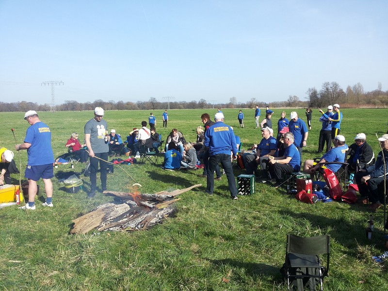 In lockerer Folge begaben sich die einzelnen Bootsbesatzungen auf die Rückfahrt mit Kurs auf dem gemütlichen Tagesausklang. Stehtische vor den Bootshaustoren, Oldies aus den Lautsprechern und die lodernde Feuerstelle warteten schon. Besagte Möbel waren alsbald mit schäumendem Gerstengetränk bestückt, leider jedoch nicht unbedingt geeignet, geländetechnische und sonstige Schieflagen dauerhaft auszugleichen. Viele Hände machten dem entsprechenden Scherbenhaufen schnell ein Ende. Frischer Nachschub aus der Clubwirtschaft und Imbiss zur Stärkung waren rasch besorgt. Mit musikalischen Highlights, ob aus der Konserve oder live am Lagerfeuer konnte der Abend artgerecht ausklingen. Vielen Dank all denen, die als Organisatoren oder Mitstreiter diesen Tag ermöglicht haben.