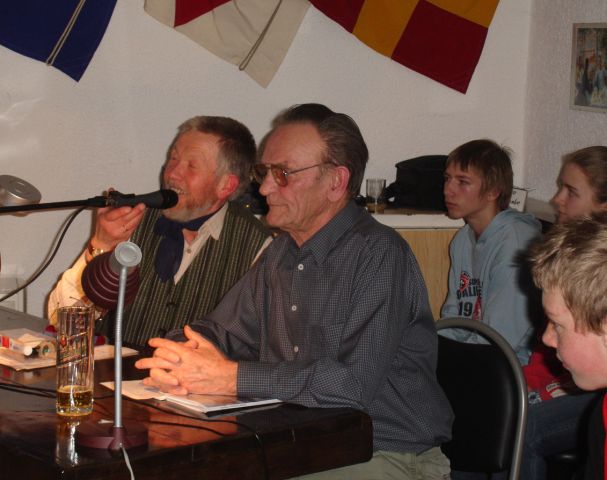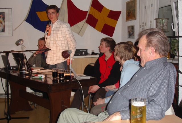 Nach einer gut organisierten Werbekampagne füllte sich am Freitagabend, 9. März 2007, das Bootshaus immer mehr mit Clubmitgliedern und bis dato dort noch nie gesehenen Gästen: Am Ende waren alle Stühle besetzt, mit Andrea Salewski und Heiko Sommer, die von der Theke aus zuschauten, waren somit 100 Leute versammelt, um Helmut Großmann als lesenden Schriftsteller zu erleben. Nach einer Schweigepause im Glockenschlag für die kürzlich verstorbene Ruderkameradin Gudrun Winkler übernahm EINAR HÖDE das Wort: "Manchmal war an Ruderjugend-Wochenenden Helmut Großmann unser Gast. Dabei erzählte er uns aus seinem Leben. Wenn er dann erst einmal in Fahrt kam, hörten wir nicht nur viele Geschichten aus seinem Rudererleben und der Entwicklung des Eilenburger Ruderclubs. Wir hörten auch Geschichten, die für uns sehr spannend waren, aber eher an Märchen erinnerten, statt an wirklich erlebtes Leben. Wir konnten uns kaum vorstellen, wie früher Jugendliche gelebt haben, wie sie ihre Freizeit verbracht haben und welche Wege sie gegangen sind, bis sie so alt geworden sind, wie wir sie als Erwachsene heute kennen. Uns hat immer gut gefallen, wie lebendig Helmut Großmann berichtet hat und waren so herum gesehen dankbar, Geschichtsunterricht der etwas anderen Art mitzubekommen. Als wir von unserem Trainer, Dr. Hirschfeld, erfahren hatten, dass Herr Großmann ein Buch über sein Leben geschrieben hat, das im Bootshaus vorgestellt werden soll, wollten wir uns als RCE-Ruderjugendliche gern an der Ausgestaltung der Lesung beteiligen. Wir interessieren uns natürlich besonders für die Zeit aus Helmut Großmanns Leben, in der er etwa in unserem Alter war und werden von dort einige Abschnitte aus seinem Buch vortragen. Danach wir Herr Großmann selbst sein Buch in die Hand nehmen, Ihnen daraus vorlesen und darüber sprechen. Herr Dr. Hirschfeld wird versuchen, dem Vor- und Leseabend etwas Struktur zu geben. Und wir werden dann noch dabei helfen, dass jeder von Ihnen ein Buch bekommen kann, um es vielleicht vom Autor signieren zu lassen." Danach kamen die jugendlichen Vorleser ans Mikrofon: David Namislo las etwas über Helmut Großmanns Familie vor, in der, wie Elisabeth Budras dann berichtete, Weihnachten nicht immer eitel Freude geherrscht hat. Um was es sich bei einem "Pimpfenlager in Reinharz" handelte, erfuhr man von Jennifer Gollasch, während Kevin Ehser von Helmuts erstem Kuß mit einem fremden Mädchen berichtete. Einar Höde las aus dem Abschnitt vor, in dem man etwas über die Lehrzeit erfahren kann, in der auch, wie Susann Röhr danach las, die "Eroberung des Kammerköhr-Gipfels mit Skiern" stattgefunden hat. Das Ende von Helmut Großmanns Jugendzeit fiel zusammen mit dem Erwerb eines Befähigungsnachweises als "Jagdflieger für jeden fliegerischen Einsatz geeignet", von dem Florian Straub vortrug. Nach einer Pause, in der man miteinander reden und sich mit Getränken versorgen konnte, übernahm Helmut Großmann das Mikrofon und brachte das Auditorium mit Auszügen aus seinem Buch und seinem Leben jenseits des 16. Lebensjahres zum Schmunzeln und zum Nachdenken. Nebenbei wurden mit der tadellos funktionieren neuen Beamer- und Beschallungsanlage Fotos gezeigt die nicht ins Buch aufgenommen werden konnten und das Interesse aller Anwesenden erregten. Gegen 21 Uhr wurde übergeleitet in den "lockeren Teil" des Abends: Die Ruderjugend bezog Position als Buchverkaufseinheit und Helmut Großmann hatte mit dem Signieren der Bücher für seine "Fangemeinde" mächtig zu tun, obwohl er schon vorher viele Bücher mit seinem Namenszug "veredelt" hatte. Alle Aktiven und Besucher, auch Helmut Großmann, sind sich einig gewesen, einen wunderschönen Abend im Bootshaus erlebt zu haben. Wer noch ein Buch erwerben möchte, wende sich bitte an den Webmaster, der vermitteln wird.