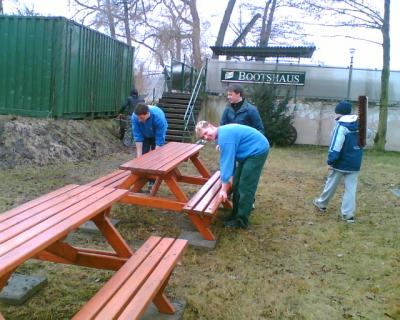 Mit einer erstaunlich hohen Beteiligung wurde am Samstag, dem 25.03.06 der offizielle Frühjahresarbeitseinsatz des RCE e.V. durchgeführt. Grund für die zahlreich erschienen Mitglieder vor allem im Jugendbereich war die gute Vorarbeit des Jugendvorstandes durch gezieltes Ansprechen der Sportler, Übungsleiter und Helfer. So kamen insgesamt 37 Mitglieder, darunter 22 Jugendliche, ab 09:00 Uhr im Bootshaus zusammen um notwendige Arbeiten am Material und auf dem Gelände auszuführen. Die Arbeiten waren diesmal sehr vielseitig: Fleißig gewerkelt wurde an den Booten, Skulls wurden sortiert, Rollsitze neu beschriftet und Fehlteile festgestellt, die Bootshalle wurde geschrubbt, im TT-Raum einige Schränke aussortiert und ausgewischt und auch im Freigelände wurde klar Schiff gemacht. Dazu zählte Laub harken, Bäume fällen, Flächen kehren, Sperrmüll abtransportieren und einiges mehr. Weiterhin wurde der Ruderkasten vom Dreck befreit und das Motorboot gereinigt und poliert. Aufgrund der Hochwasserwarnungen wurde das Einsetzen des Steges noch verschoben. Er soll dann am Donnerstag oder Samstag mit der notwendigen Manpower eingebracht werden, damit auch wirklich ein Anrudern stattfinden kann.