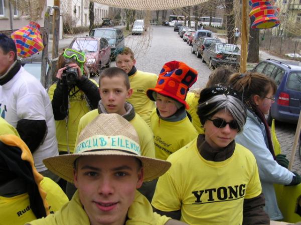 Am Montag mussten nur noch einige wenige Handgriffe ausgeführt werden, und schon stand der Hänger, beladen mit 25 Kilogramm feinsten Bonbons (gesponsert von Tilo Palm und Karsten Köhler), einer 5000 Watt Musikanlage der DJ Kef&friends und Örni und dem übliche Krimskrams, den man zum richtig - Fasching - feiern benötigt, vorm Bootshaus. Das Zubehör waren Trillerpfeifen, Tröten, Konfetti, ein Megaphon und kleine Köstlichkeiten. Damit die Technik auch lief, wurde ein 6,5 kW Generator mit am Hänger platziert. Andrea hatte wieder viele leckere Brötchen geschmiert und belegt sowie einige Erfrischungsgetränke besorgt.