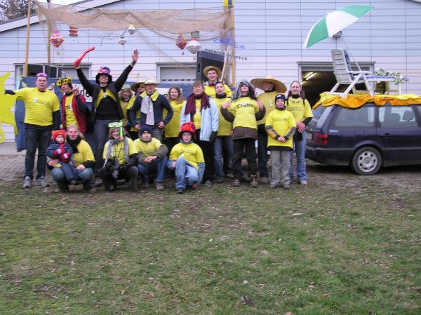 Dem Thema entsprechend wurde diesmal auch auf dem Zug-PKW ein Liegestuhl nebst Sonnenbader platziert. Der Sand wurde durch den goldig-gelben Stoff simuliert. Der Anhänger selbst war eine typische Mallorca Strandbar, mit Ausschank, Musik und natürlich Partypublikum.