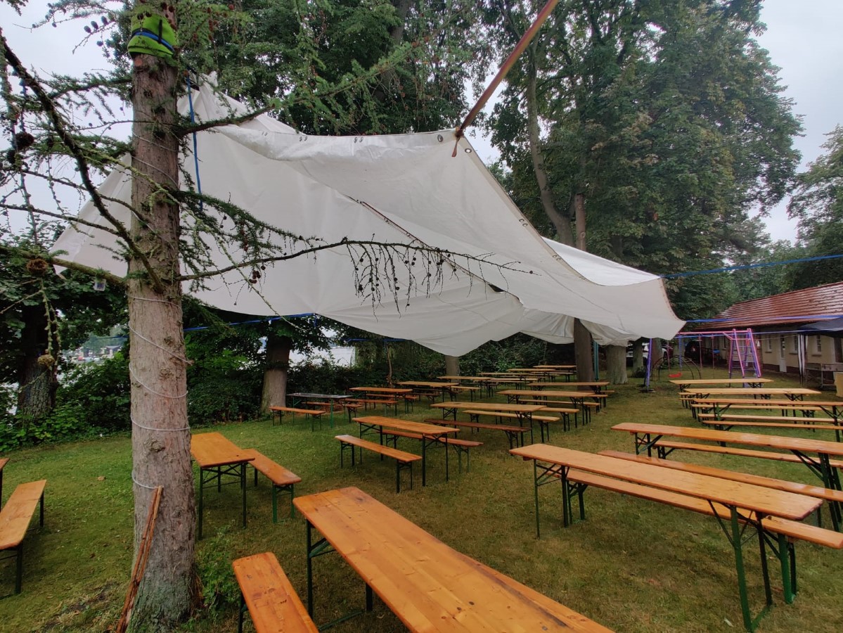 Um nicht allzu viel bei RIHO zu verpassen, wurde der Aufenthalt nicht übermäßig ausgedehnt. Durch den strahlenden Spätnachmittag nahmen wir den kürzestmöglichen Rückweg dorthin, wo die Reste der Party im Gange waren. Die raffinierte Überdachungstechnik konnte sich gegen nicht angesagte Regenschauer nun doch noch als sehr nützlich erweisen. So lief die Chose ohne schwerwiegende Katastrophen mit Musik von DJ „Wacki“ und Tanz an der Dahme bis 23 Uhr durch und fand dann nach und nach ihren entspannten Ausklang.