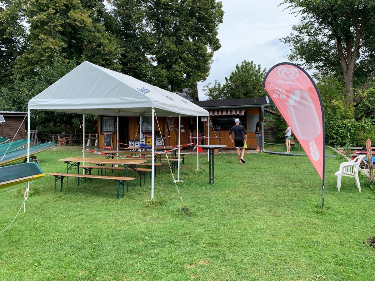 Nach dem Frühstück ließ man sich vom Aufbautrubel anstecken und packte mit zu. Bei strömendem Regen waren vor allem Überdachungen gefragt. Dank Veikkos mitgelieferter Zapfanlage konnten wir unsere Kollegen auch beim getränketechnischen Entzerrungskonzept unterstützen. Zum Glück klarte der Himmel bald auf. Es wurde noch rasch die Taufe des niegelnagelneuen Gig-3/4ers „Baume" durch den ebenso frischen Riho-Chef Phillip Habermann vorgenommen, dann landeten schon die ersten Gäste auf dem Wasserwege an.