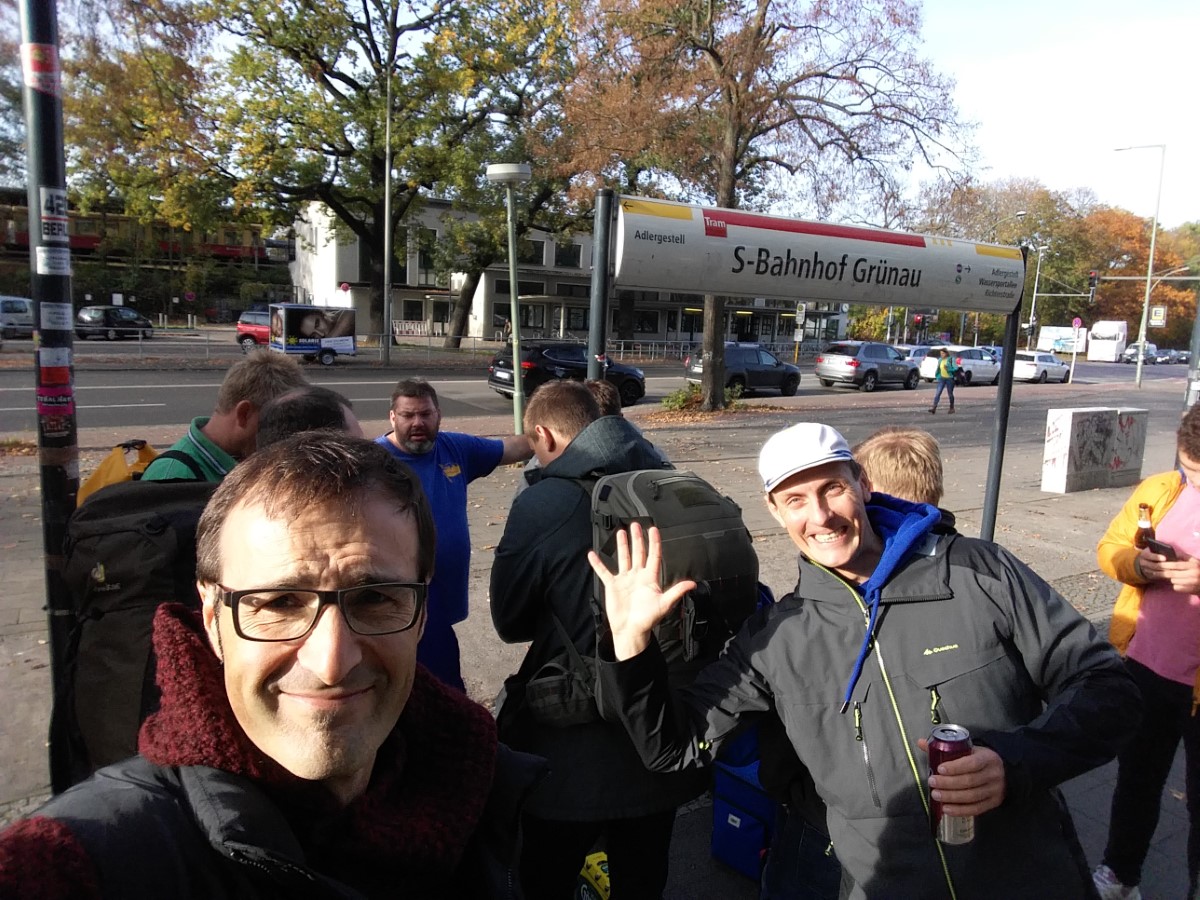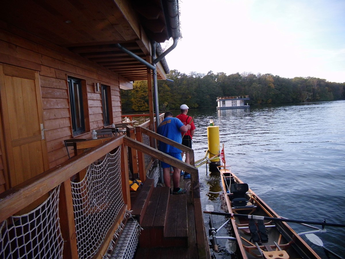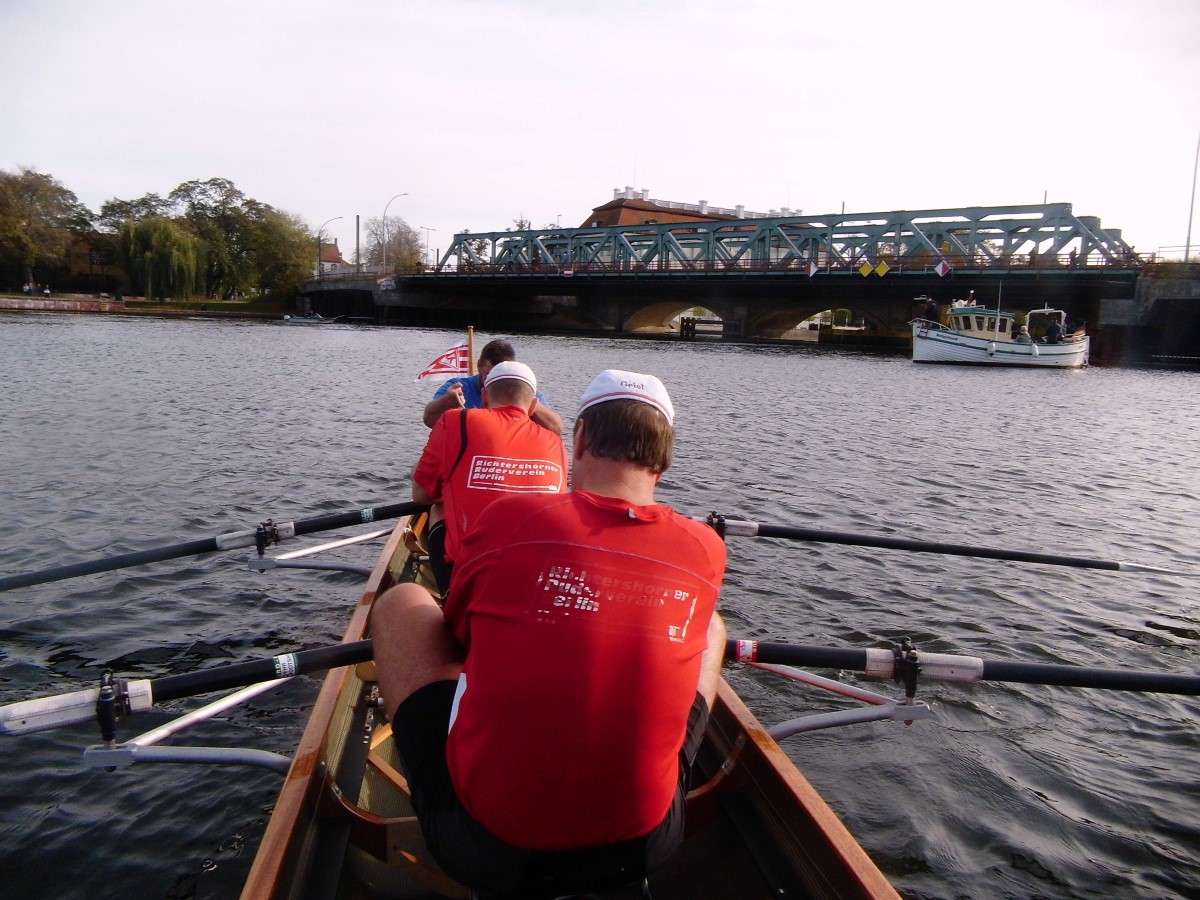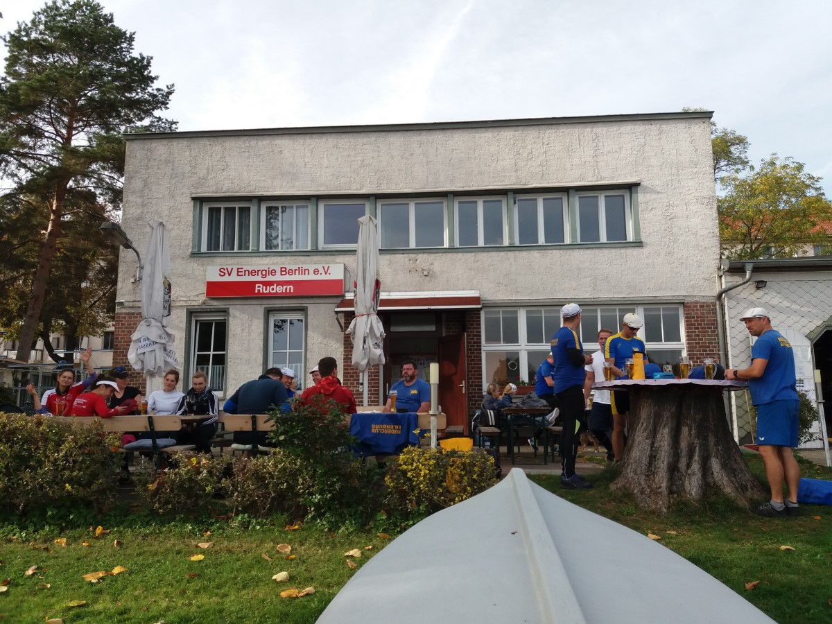 Schon recht zeitig war an diesem letzten Oktobersamstag eine vielköpfige RCE-Delegation zum Frühstück im Regionalexpress nach Calau verabredet, nämlich Anne, Josi, Peter, Felix, Tony, Julius, Osse, AndréP, Rayk, Veikko und Belle. Der Anschluss nach Königs-Wusterhausen wurde planmäßig erreicht. Mit der S-Bahn nach Grünau kam man dem Epizentrum des Berliner Abruderns schon ziemlich nahe. Die Bimmel brachte uns fix nach Richtershorn, wo der Tresendienst schon den 11-Uhr-Tee vorbereitet hatte. Außerdem gab es ein großes Hallo mit zahlreichen Ansässigen sowie Torsten (Sämel) und Nina, die extra aus Düsseldorf eingeflogen waren. Nachdem alles wesentliche besprochen war, gingen drei Vierer und ein Doppelzweier Richtung Köpenick aufs Wasser. Von Riho hatten sich Jessi, Aneta, Geisl und natürlich unser Berliner RCE-Mann Frank angeschlossen.