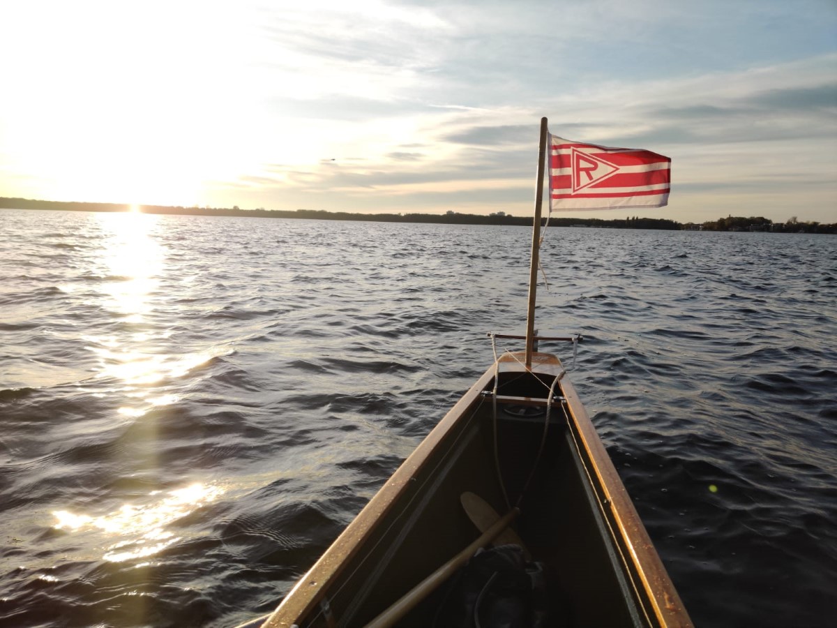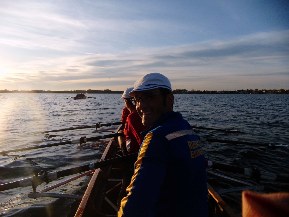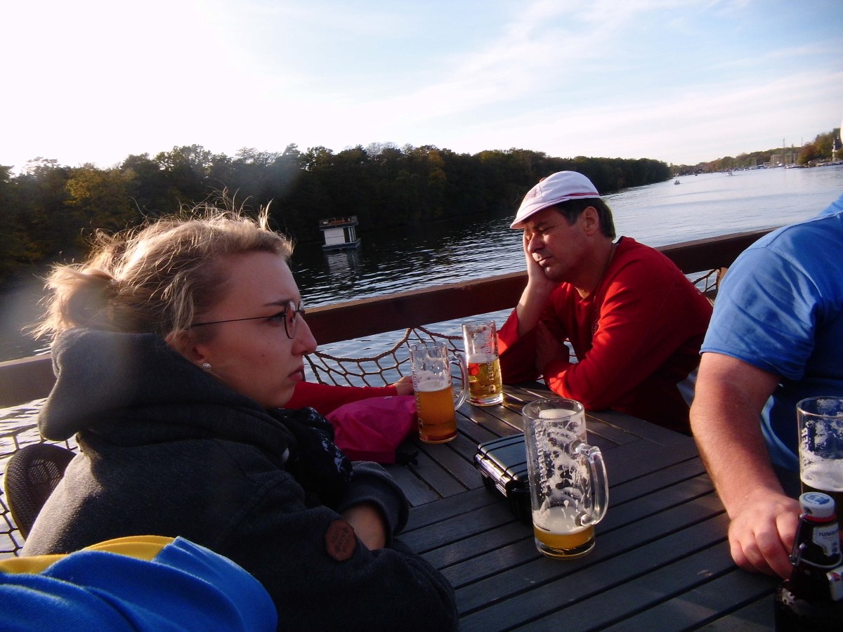 Ein sonniger Herbsttag deutete sich an. Angenehm, mäßiges Lüftchen und mild im Abgang – einer für richtige Genießer eben. Beim SV Energie die obligatorische Pils-und-Buletten-Pause. Danach weiter bis Friedrichshagen, wo an frei schwimmender SpreeArche mit gepflegter Gastronomie angelegt wurde. Die beiden Männervierer entschieden sich bei vorgerückter Stunde noch für das volle „Große Umfahrt"- Programm bis zur Partyzone bei LOK Schmöckwitz. Die Mädels und der Doppelzweier ruderten zurück zu Baume, um die Boote vorher in die Heia zu schaffen. Die Fahrt über den selten so geschmeidigen Müggelsee war ein einziger Traum in untergehender Sonne.