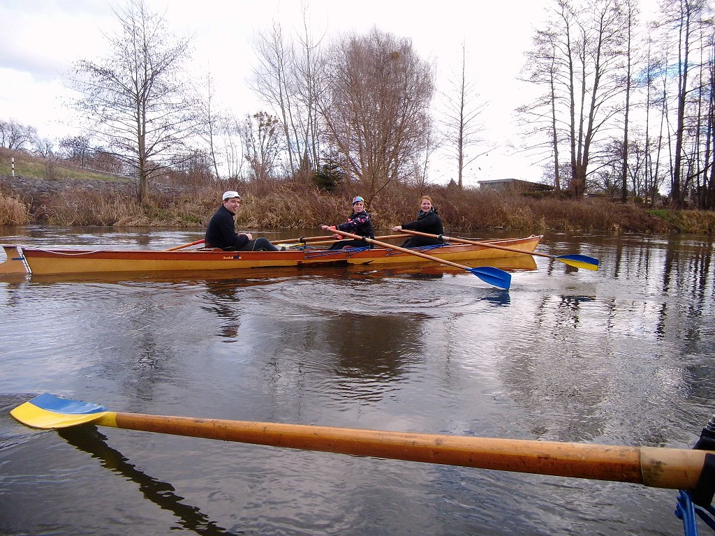 Dieser begann mit den üblichen Vorbereitungen der Boote. Vorsitzender Felix Weiske rief gegen 14 Uhr zur Ansprache. Nach kurzer Belehrung ehrte man die Sieger der Ergometer- und Tischtennismeisterschaften sowie die Kilometer-Champions der Saison 2017. Eine ganze Reihe neuer Mitglieder wurde regelrecht bejubelt, besonders im letzten halben Jahr gab es deutlich Zulauf jüngerer Sportler. Ein weiterer Höhepunkt war die Taufe des nagelneuen leichten Renneiners „Ibis“ und des eben organisierten Nachwuchs-Übungs-Doppelvierers „Marabu“. Mit Stolz und Engagement wurde diese Aufgabe durch die Juniorin Isabell Krause gemeistert. Jonas Palm durfte das neue Boot über seine ersten Meter auf dem Mühlgraben fahren.