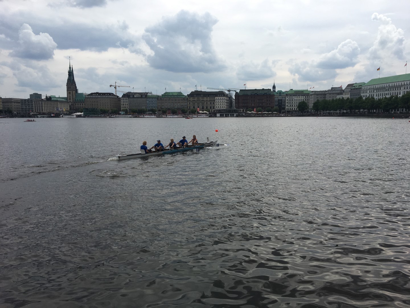 11 Uhr fiel der Startschuss bei strahlendem Sonnenschein und einzigartiger Kulisse am Alsterufer. Bereits nach den ersten Runden zeichnet sich ein harter Zweikampf zwischen dem Hamburger und Germania RC und unserer Renngemeinschaft um die Platzierung in der Gesamtwertung ab. So musste jede Runde unter vollem Einsatz der Kräfte auf Ideallinie gefahren werden, um den gegnerischen Mannschaften standzuhalten. Mit einer unglaublichen Schlussrunde konnte ein 2 Bootslängen Rückstand zugefahren und auf der Zielgeraden das gegnerische Boot überholt werden. Am Ende wurden wir mit dem Sieg in Klasse 1 (kleine Mannschaft) und dem 5. Platz in der Gesamtwertung belohnt. In Summe absolvierte unsere Mannschaft nach 8 Stunden Rudern auf dem Rundkurs 37 Runden.