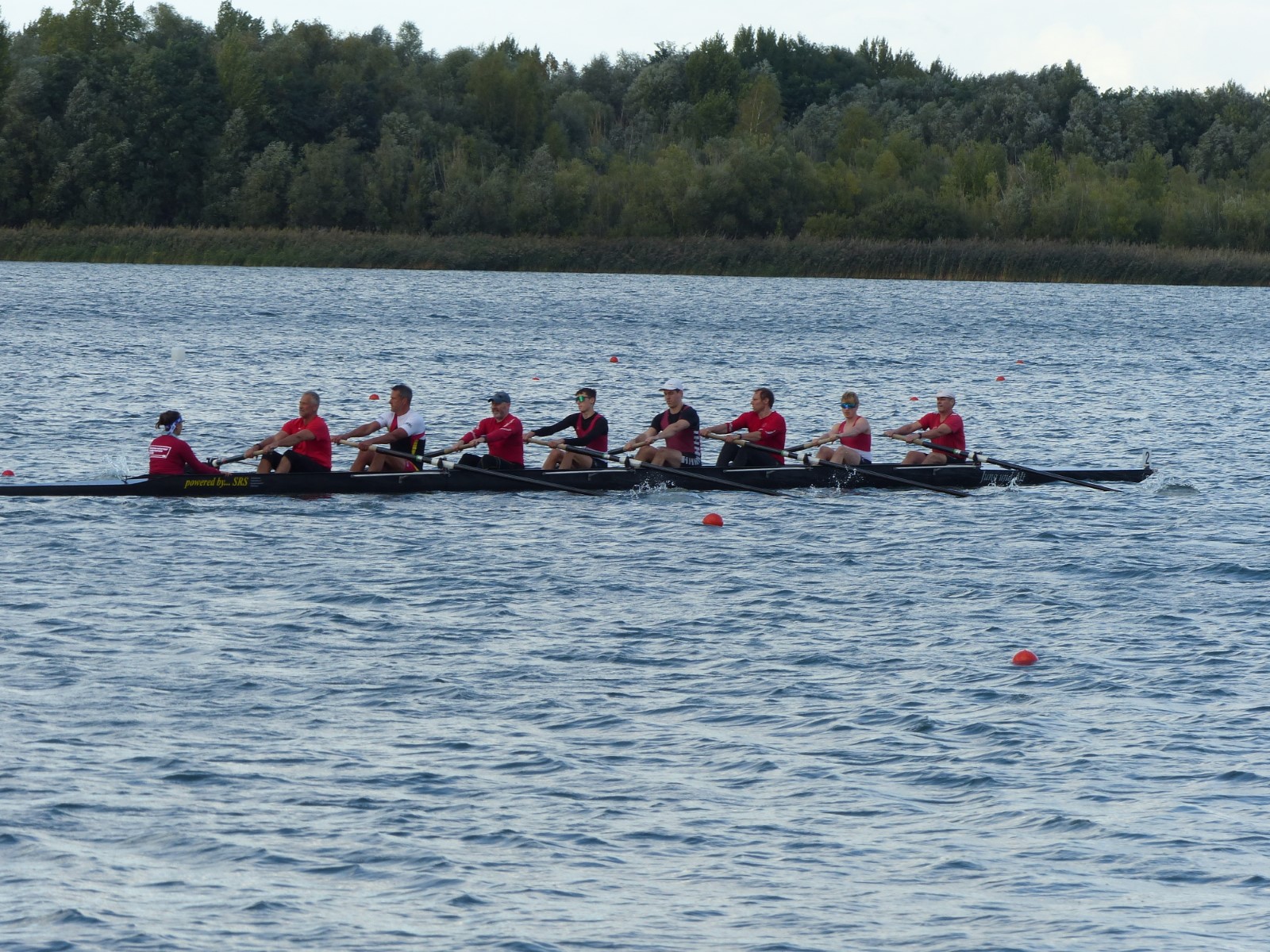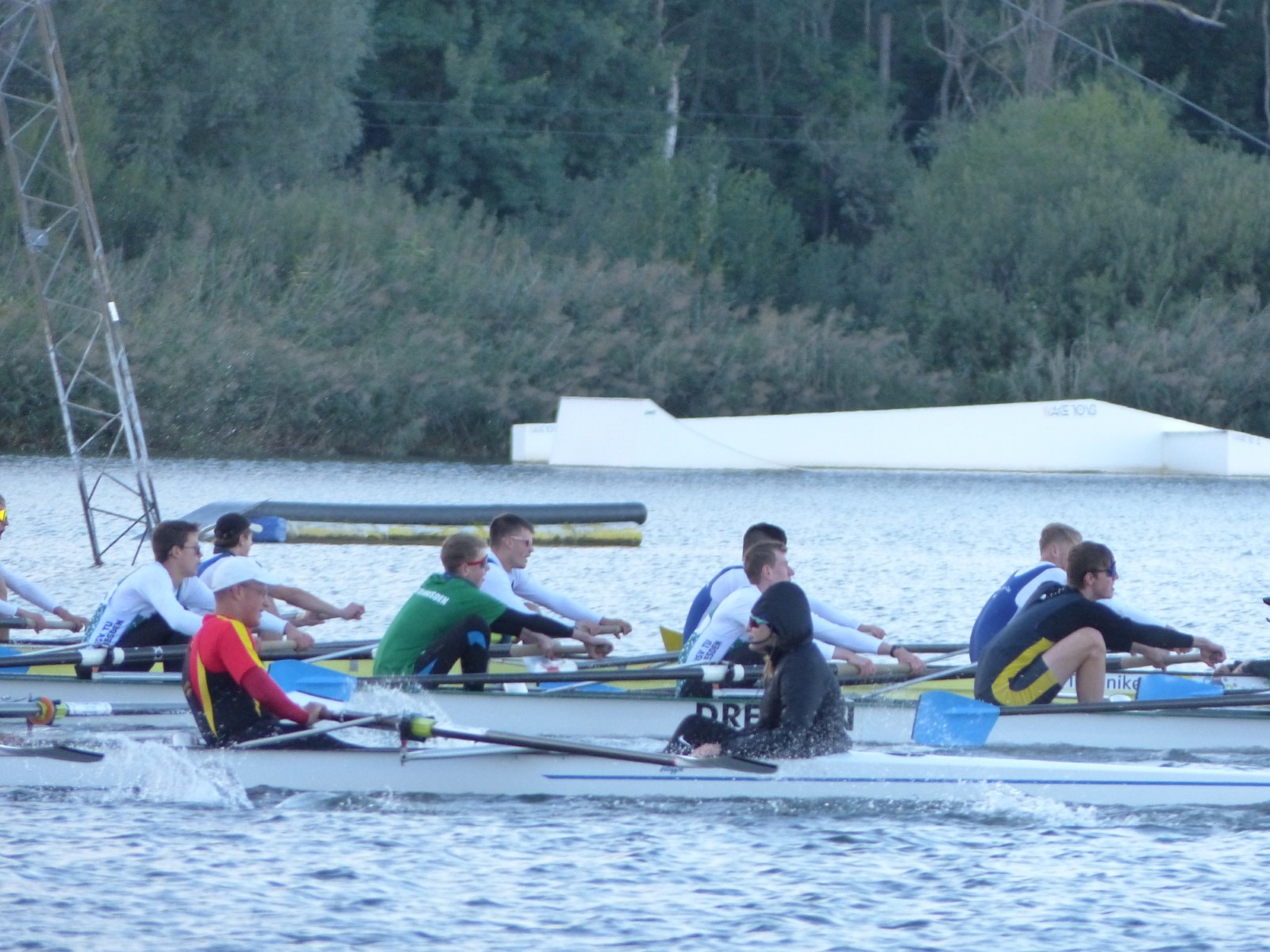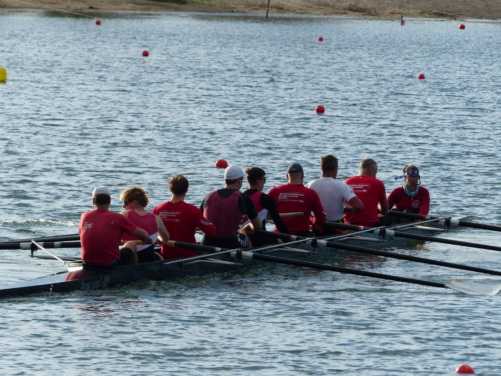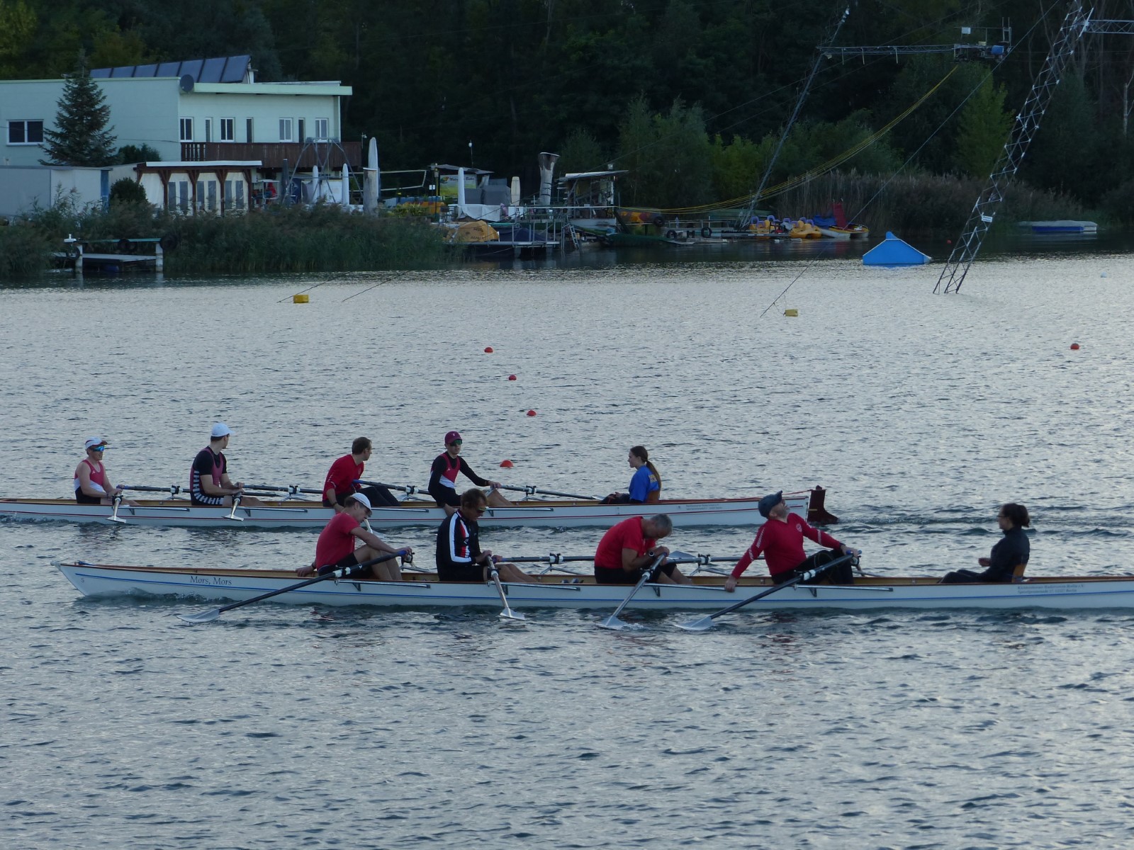 Dieses Sprintrennen war Teil eines Rahmenprogramms für Mastersruderer am Samstagabend, bei dem auch Sportler aus anderen Bundesländern antreten durften. Es waren beeindruckende Bilder, als vollbesetzte Achterrennen auf kurzer Distanz am Ziel anlangten. Schön, dass wir unsere lieben Ruderfreunde aus Berlin-Richtershorn dazu begrüßen durften. Auch wäre ohne sie das 4er-Gig-Rennen nicht zu Stande gekommen.