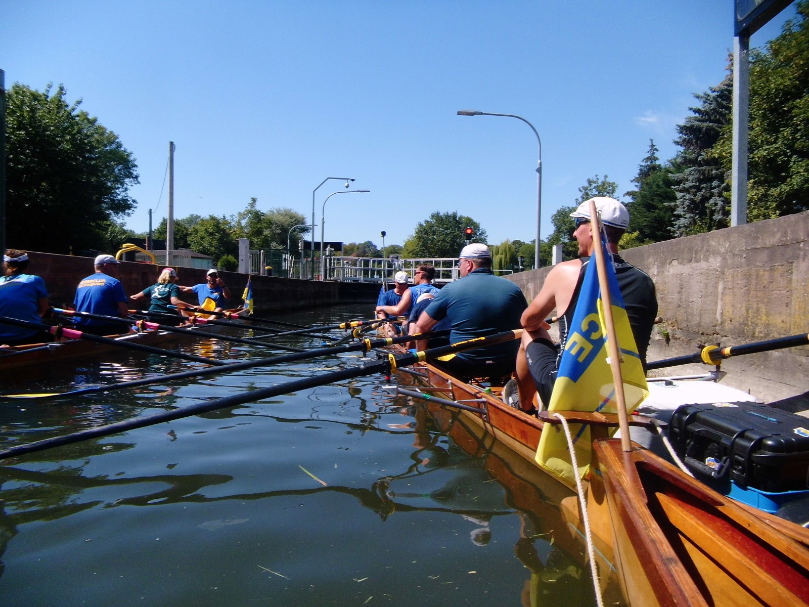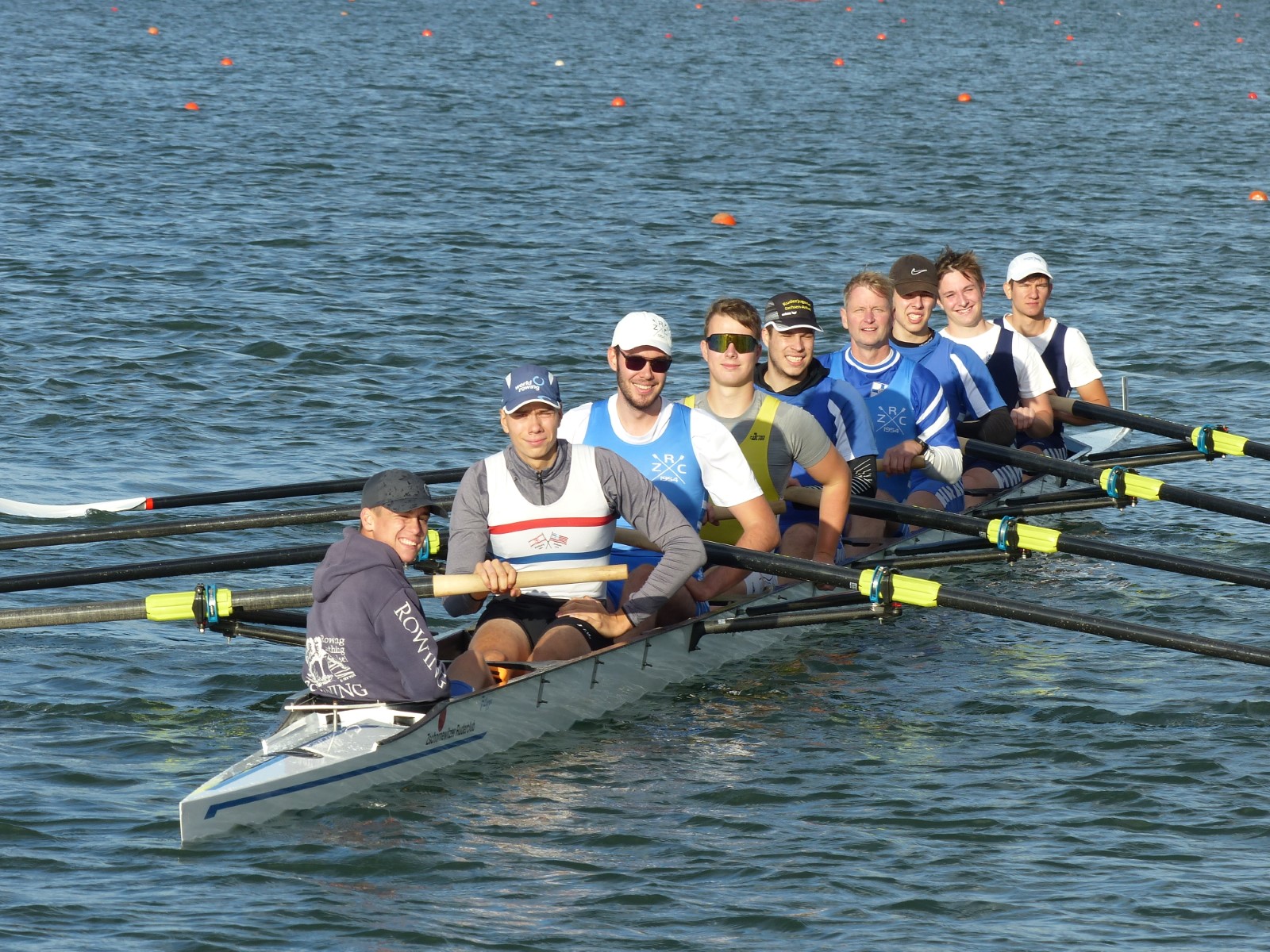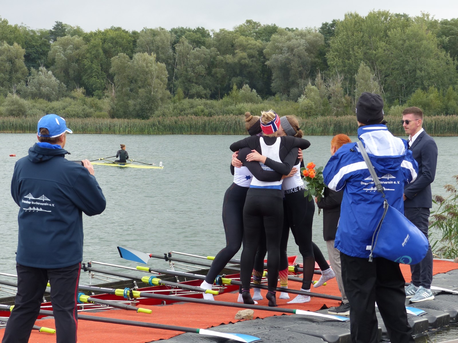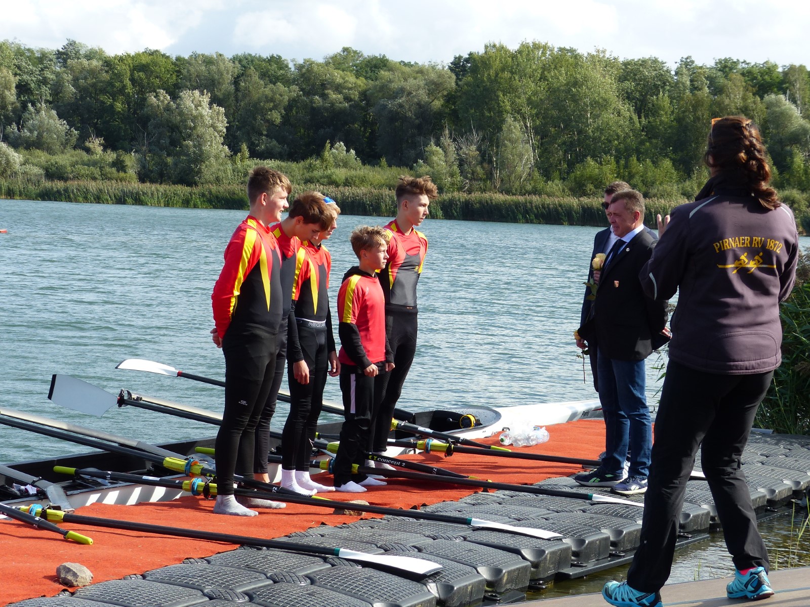 Dieses Sprintrennen war Teil eines Rahmenprogramms für Mastersruderer am Samstagabend, bei dem auch Sportler aus anderen Bundesländern antreten durften. Es waren beeindruckende Bilder, als vollbesetzte Achterrennen auf kurzer Distanz am Ziel anlangten. Schön, dass wir unsere lieben Ruderfreunde aus Berlin-Richtershorn dazu begrüßen durften. Auch wäre ohne sie das 4er-Gig-Rennen nicht zu Stande gekommen.