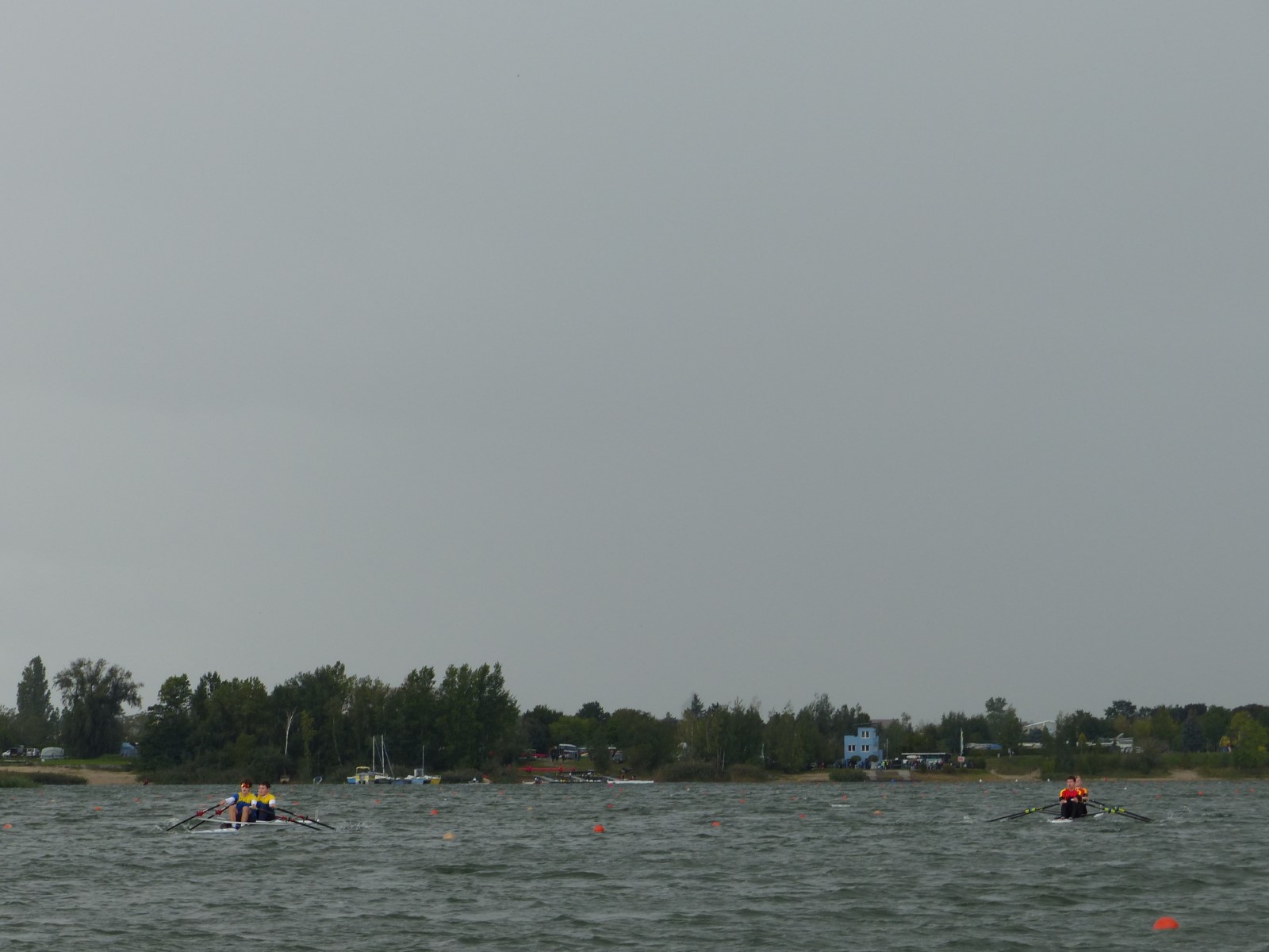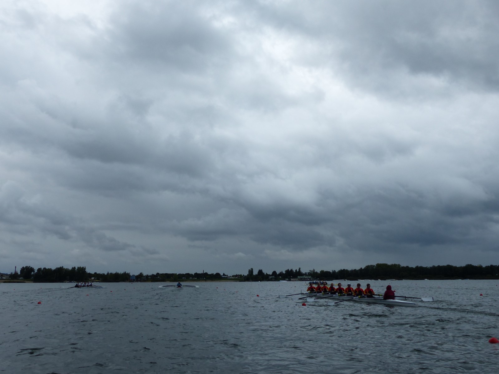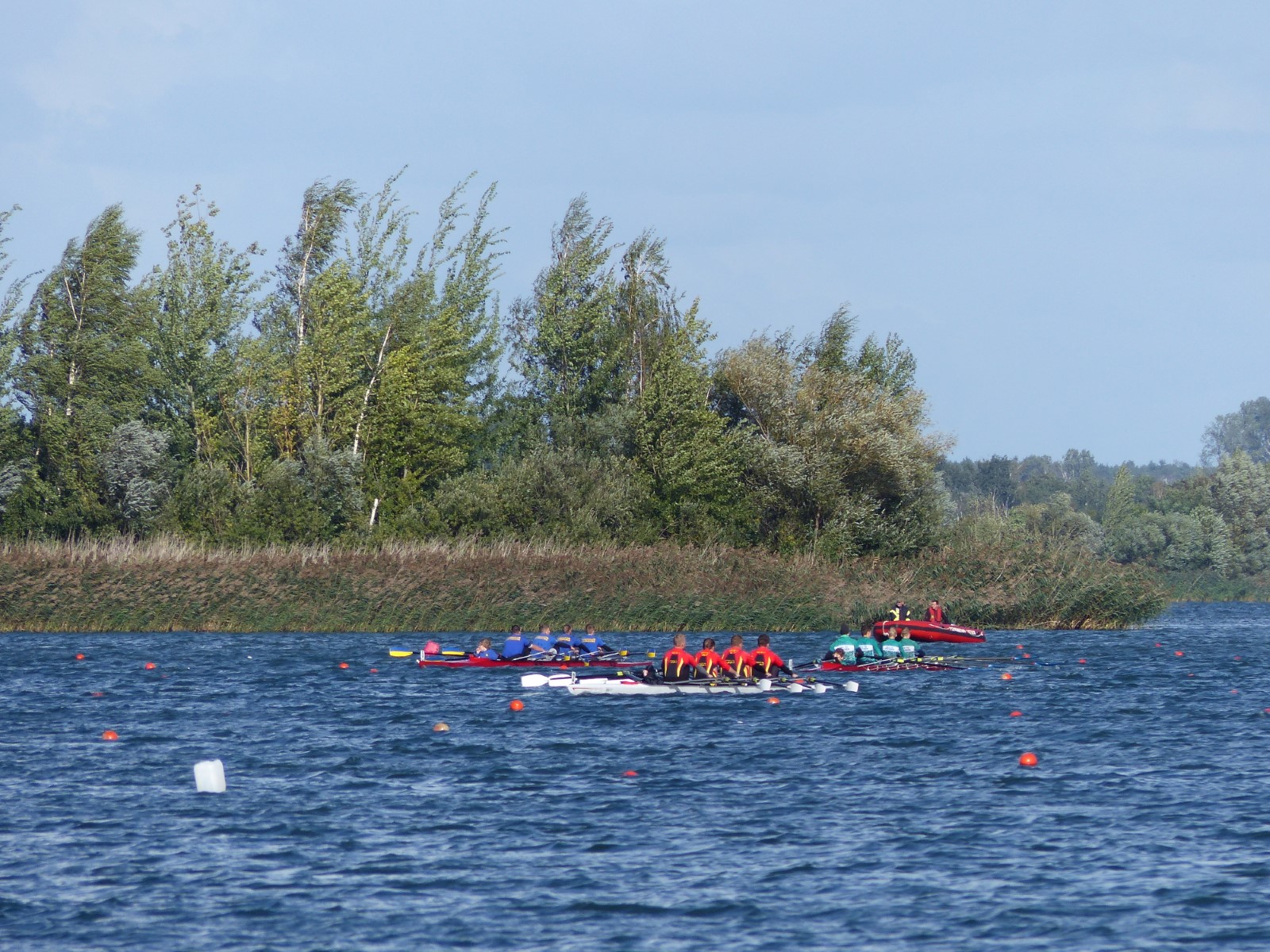 Sowohl bei der Vorbereitung als auch der Durchführung hatte man bei den 31. Landesmeisterschaften einiges zu überstehen. Das Seilziehen für die Streckenbojen gestaltete sich wegen des niedrigen Wasserstandes und entsprechender Untiefen besonders schwierig. Am Vorabend wurde während eines Unwetters das gute Zelt zerlegt, das vielen Sportlern Jahr für Jahr ein verlässlicher Ort für die nötigen Pausen war. Was sich hier wettermäßig schon andeutete, sollte das ganze Wochenende bestimmen. Ein kräftiger Westwind schuf vor allem auf der ersten Streckenhälfte maritime Bedingungen. Immer wieder kamen heftige Regenschauer durch, wer sich hier gerade auf dem Wasser befand, war echt nicht zu beneiden. Wo gerudert wird, ist man aber auch hart im Nehmen und darum machten Organisatoren und Sportler das Beste aus diesen Bedingungen.
