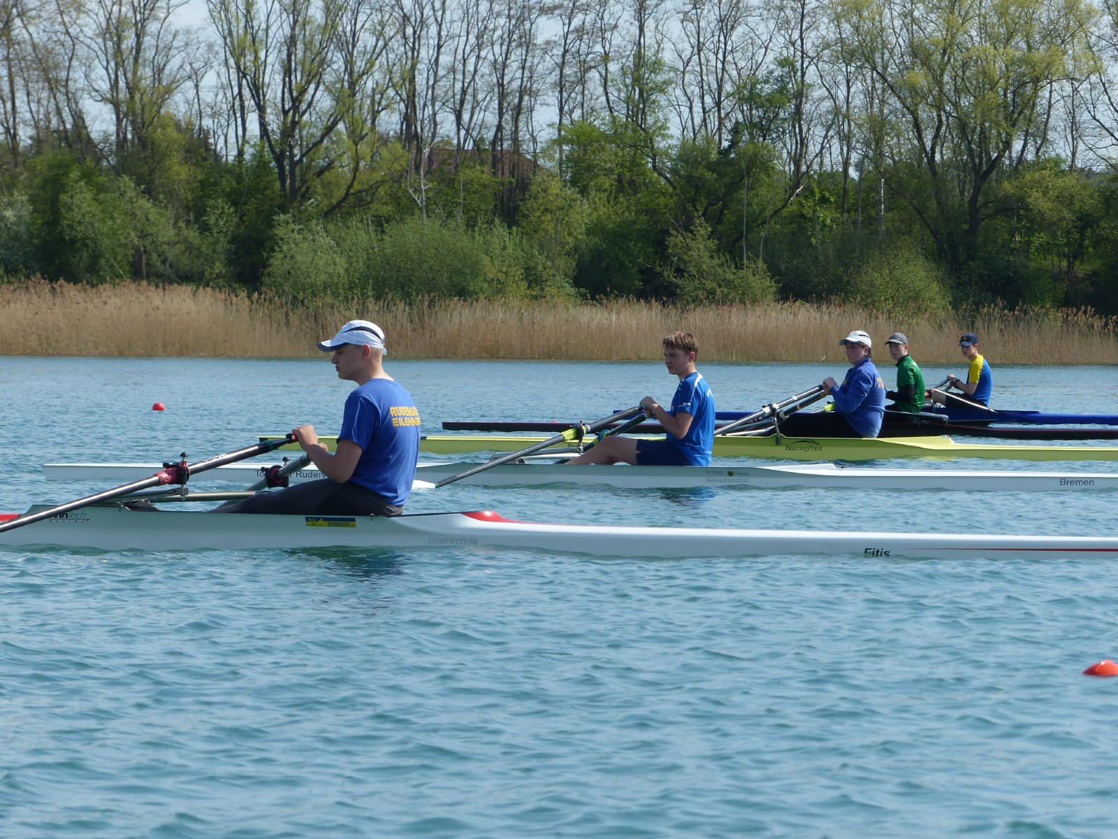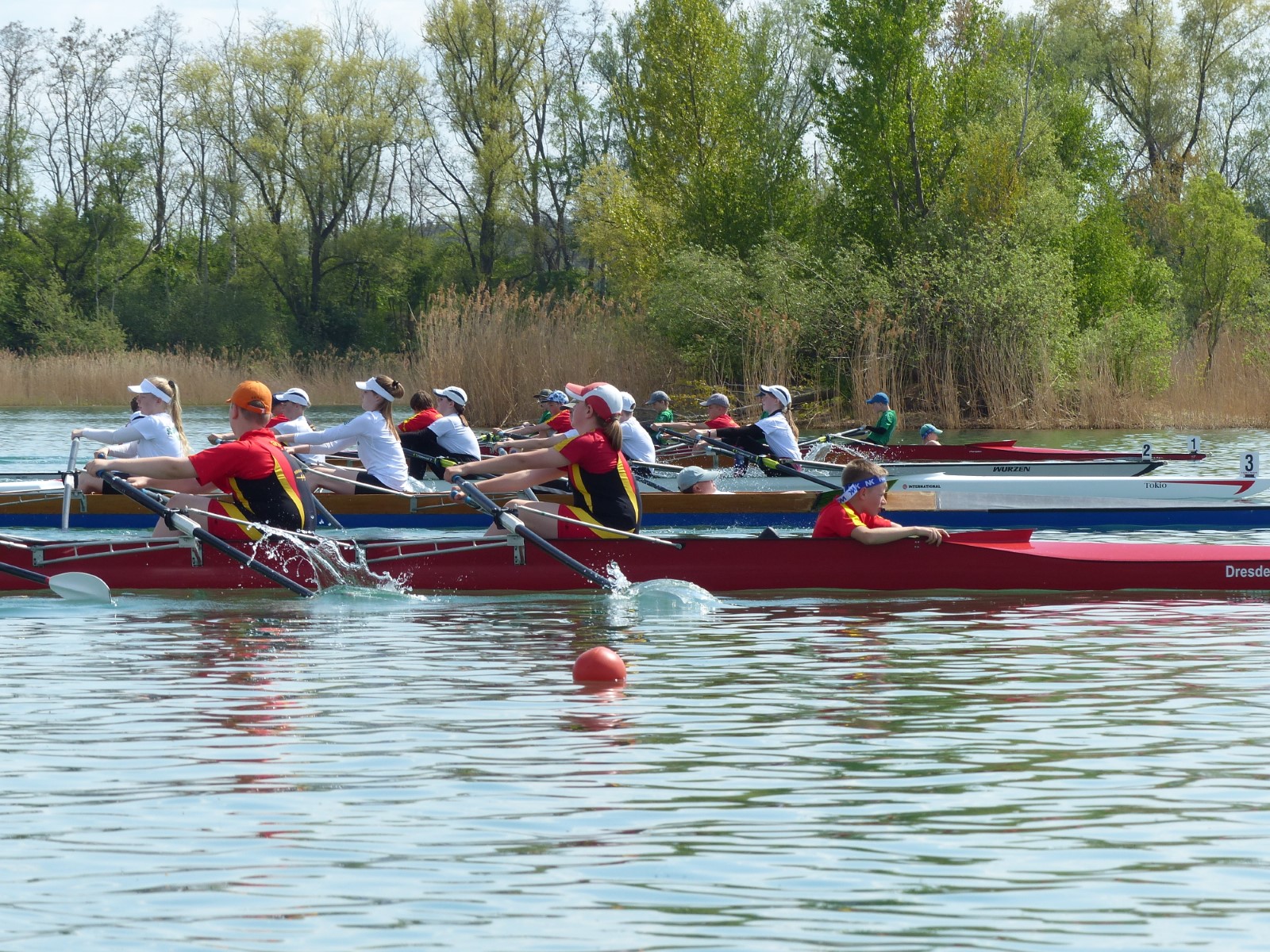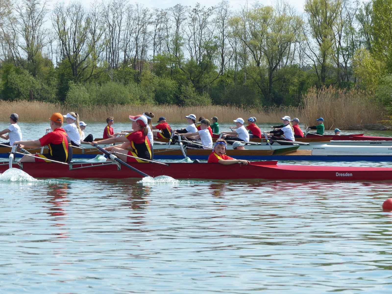 Im Einer hingegen musste Hannes wegen des Seitenwindes einen Start aus der Bojenkette heraus fahren. Er gab das Rennen nicht verloren und kämpfte sich in einem starken Teilnehmerfeld auf Platz 4 ins Ziel. Ebenso Colin Zemke (13 Jahre), der dafür alle Reserven im Endspurt mobilisierte und zwei Mitstreiter auf die hinteren Plätze verwies.