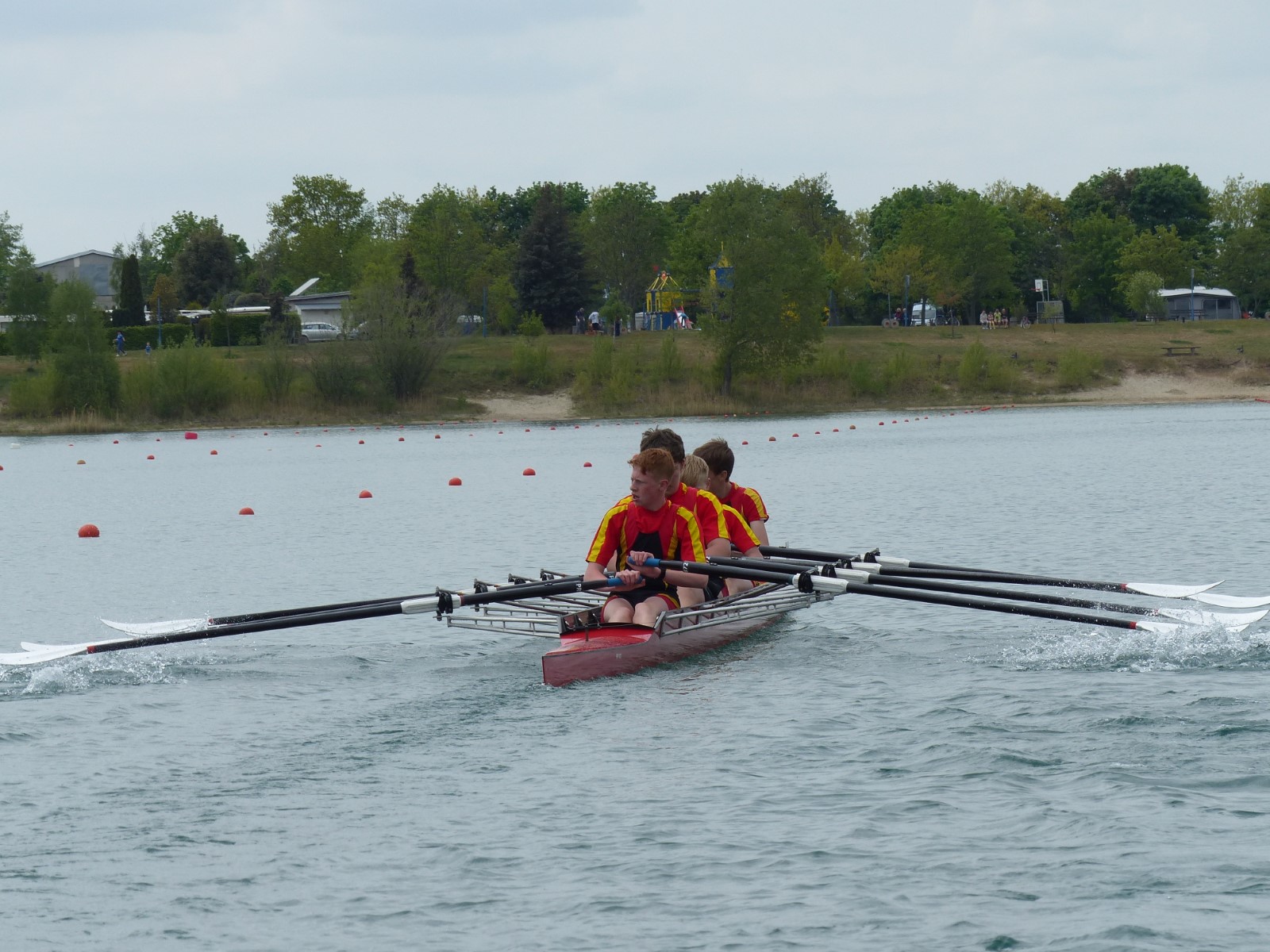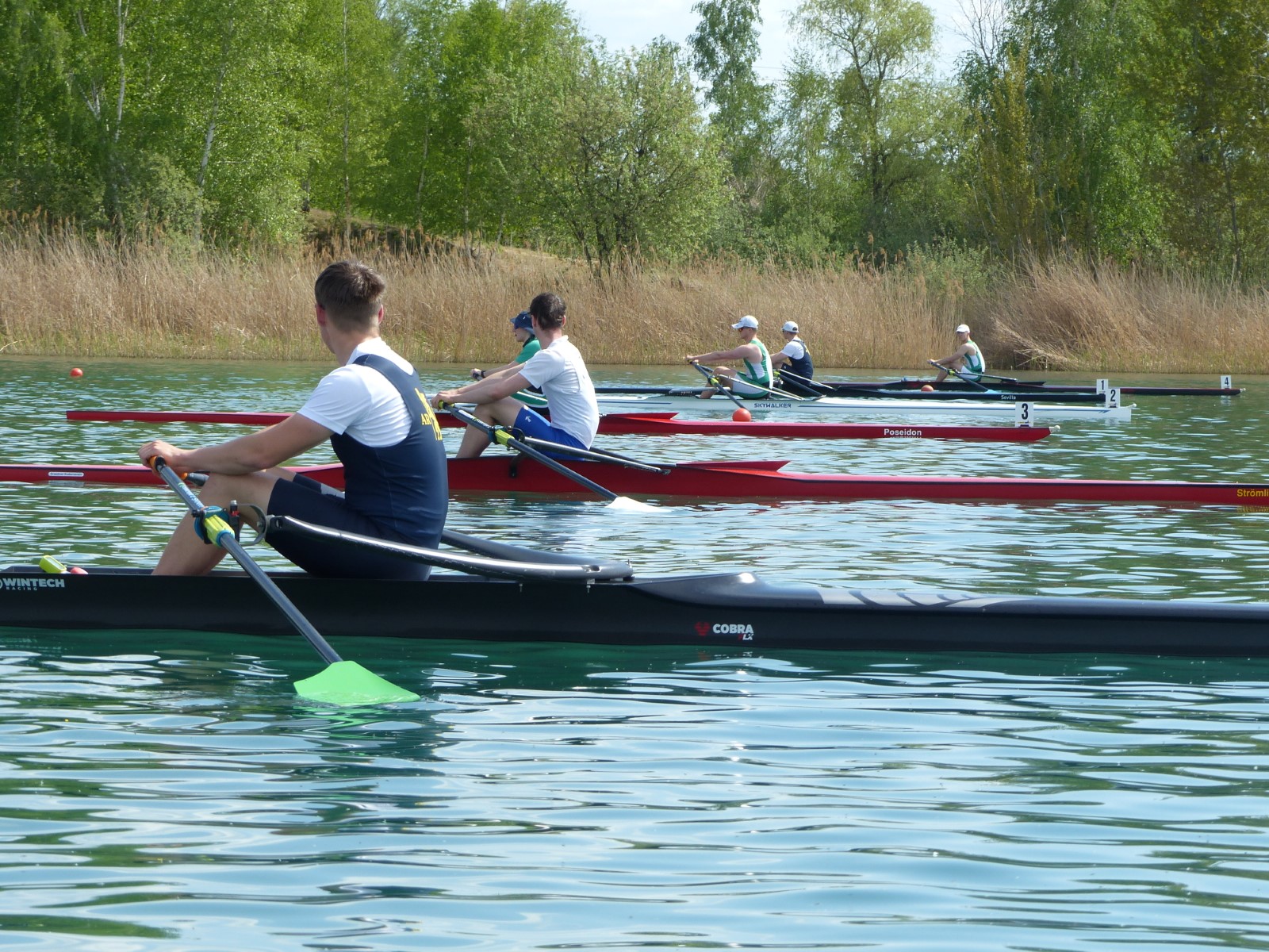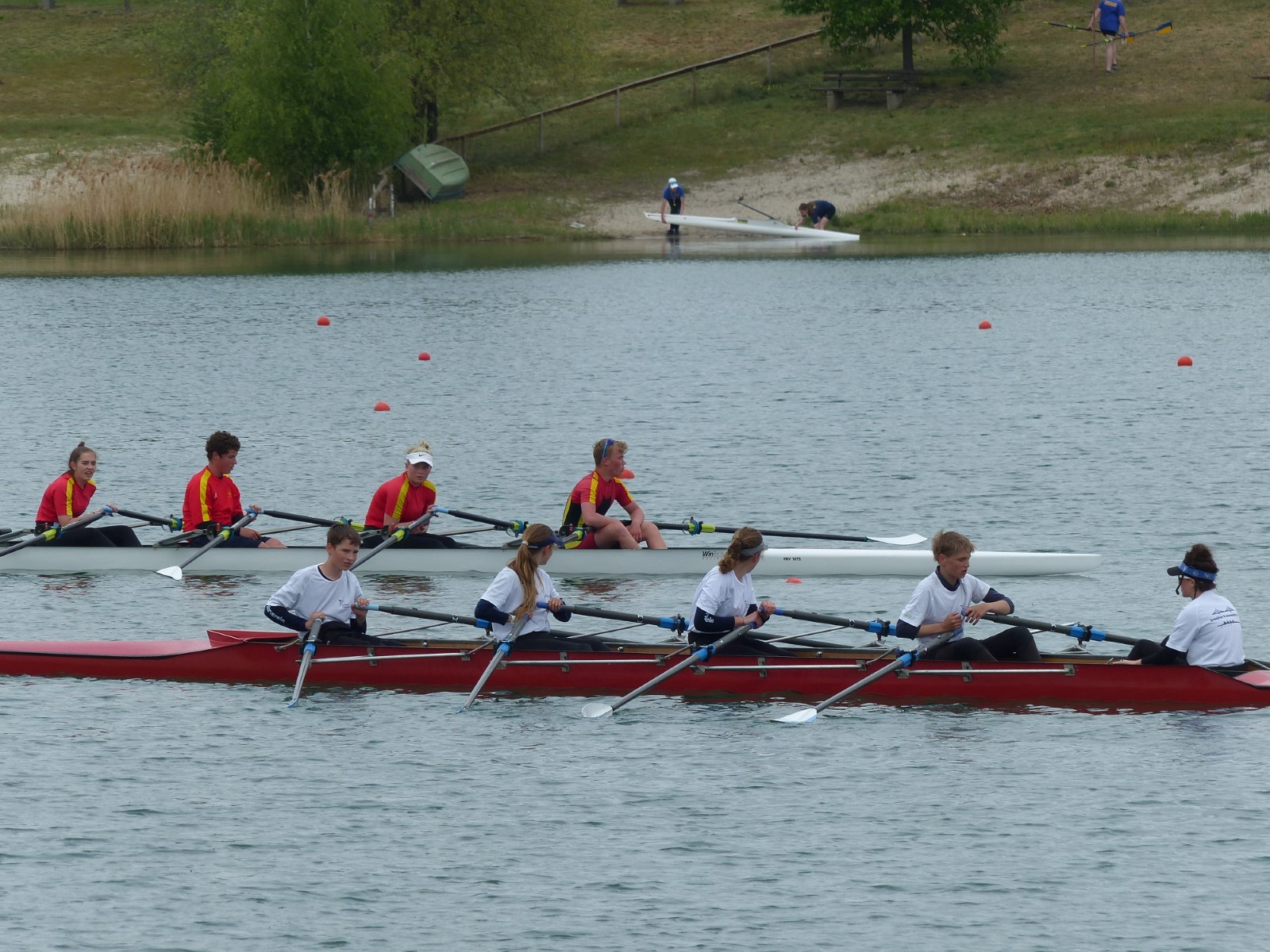 Im Einer hingegen musste Hannes wegen des Seitenwindes einen Start aus der Bojenkette heraus fahren. Er gab das Rennen nicht verloren und kämpfte sich in einem starken Teilnehmerfeld auf Platz 4 ins Ziel. Ebenso Colin Zemke (13 Jahre), der dafür alle Reserven im Endspurt mobilisierte und zwei Mitstreiter auf die hinteren Plätze verwies.