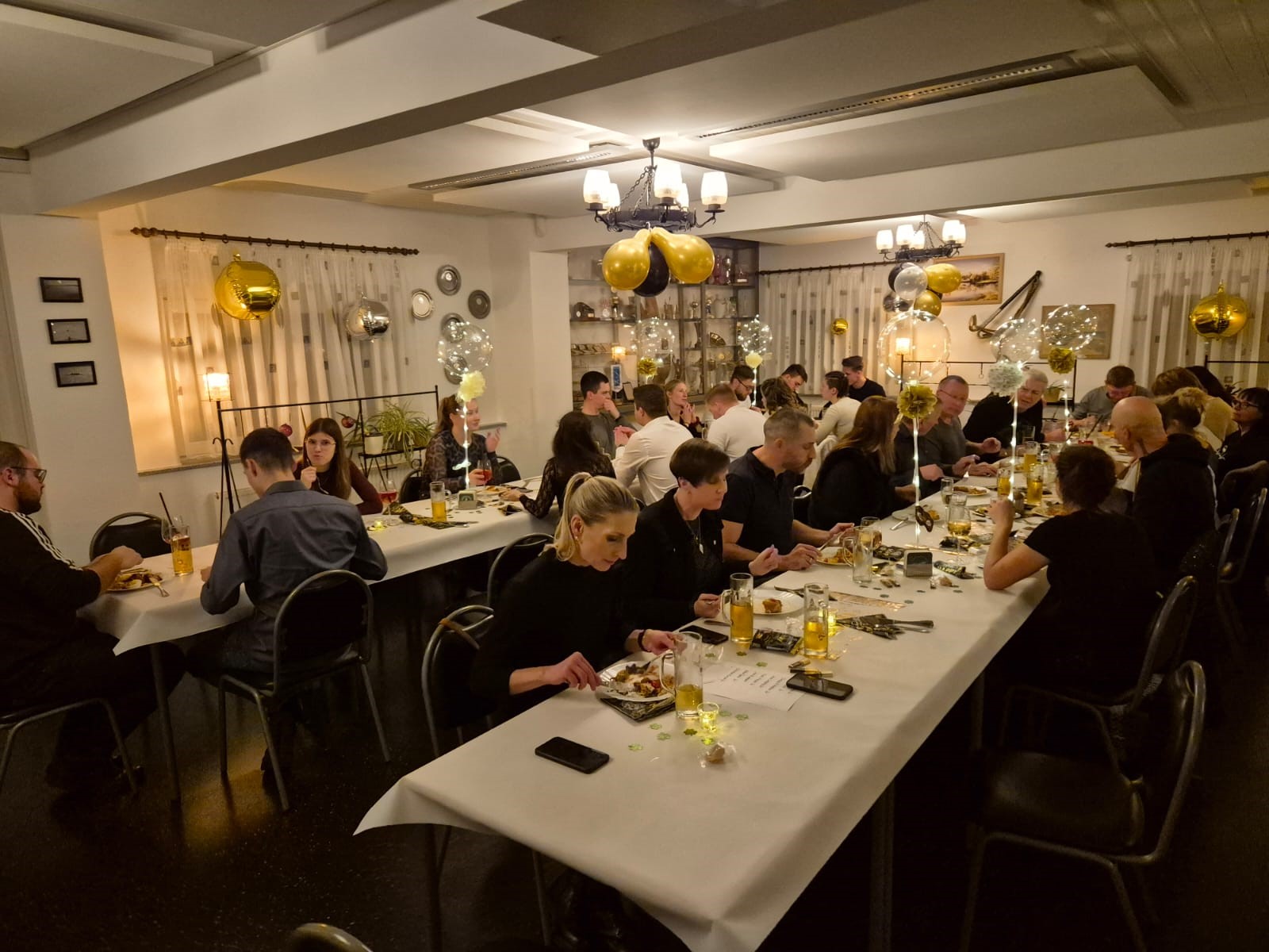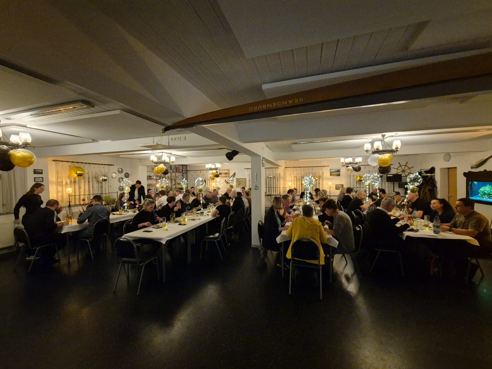Jeder zweite Jahreswechsel wird im RCE-Boothaus ordentlich gefeiert. Diesmal war es wieder soweit. Ein stilvoll geschmückter Saal empfing die Clubmitglieder und ihre Gäste. Auch das Bufett ließ keine Wünsche offen. Für die Grundausstattung mit Fleisch und Fisch hatte man den Caterer „Fiege" in die Pflicht nehmen können. Für Beilagen und Nachtisch hatten die Teilnehmenden selbst gesorgt.
