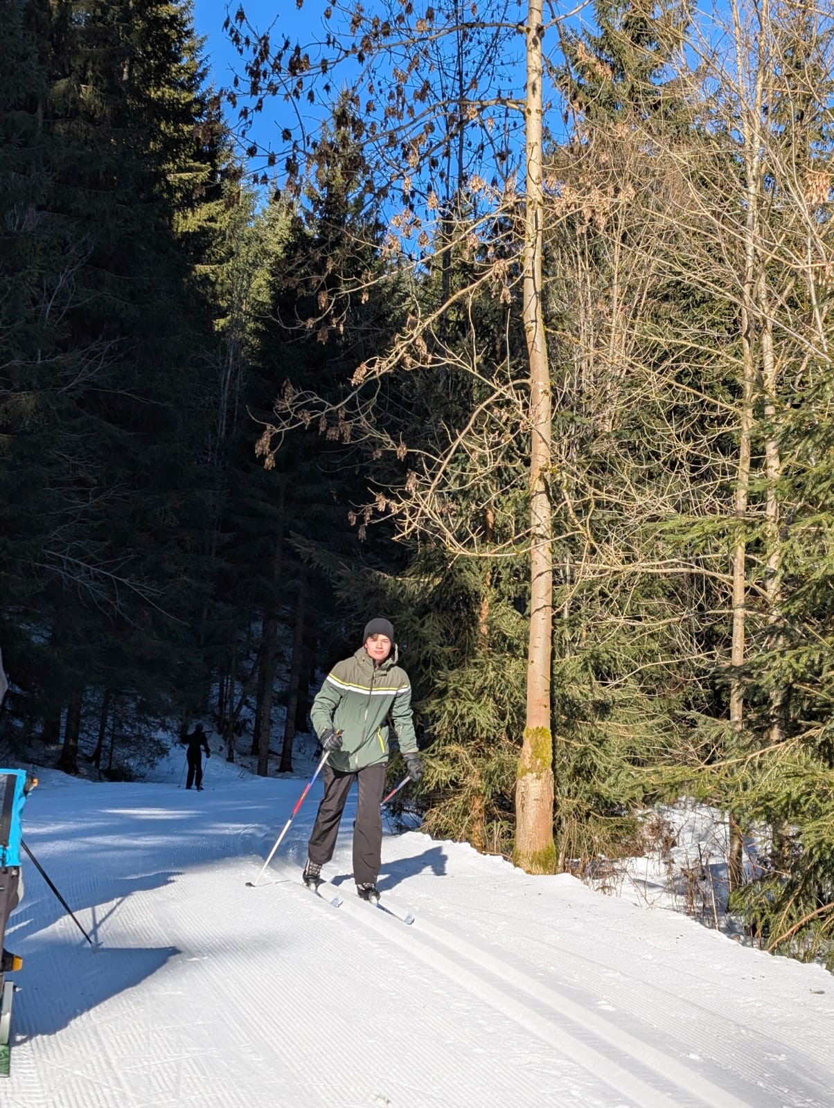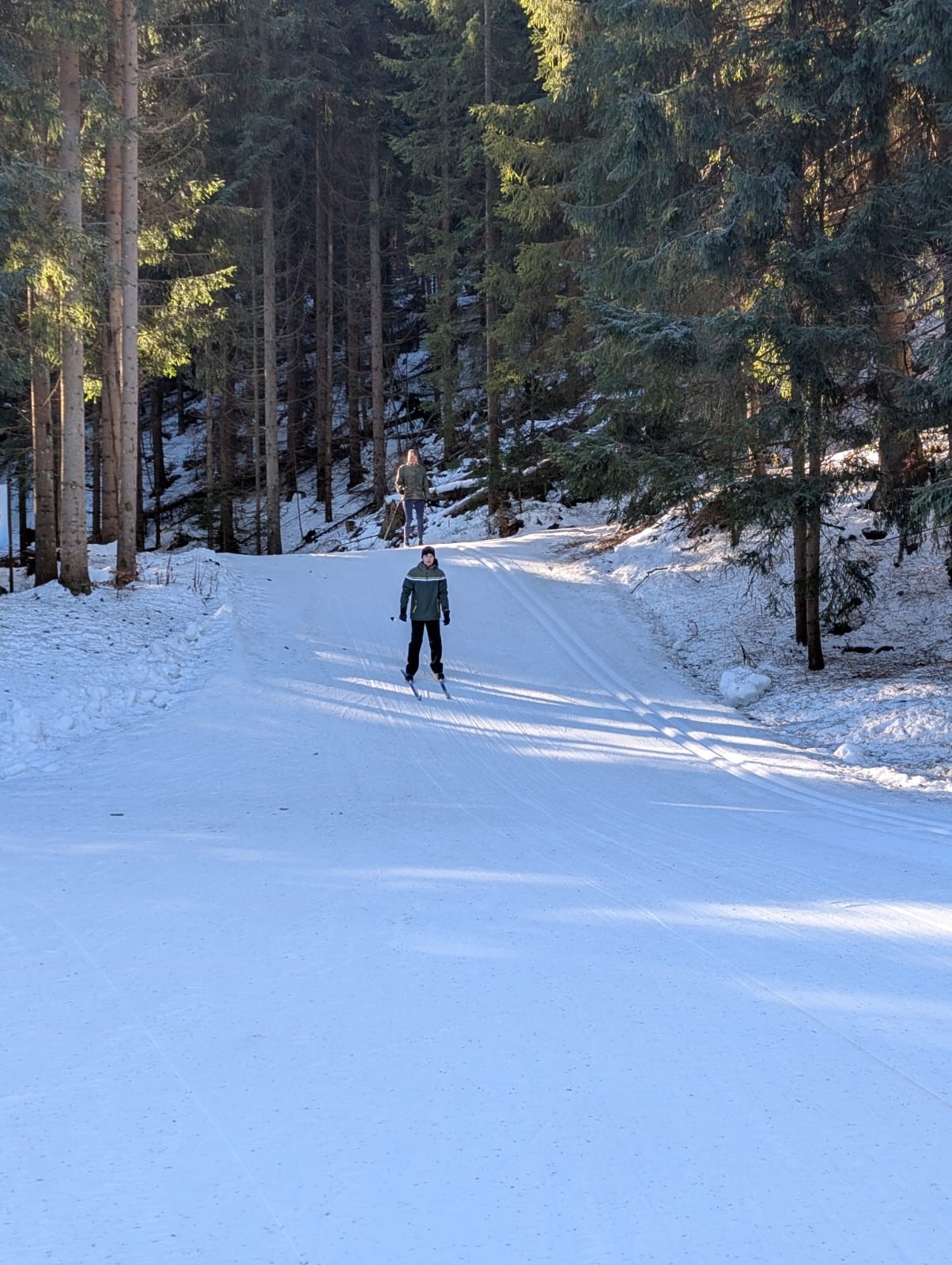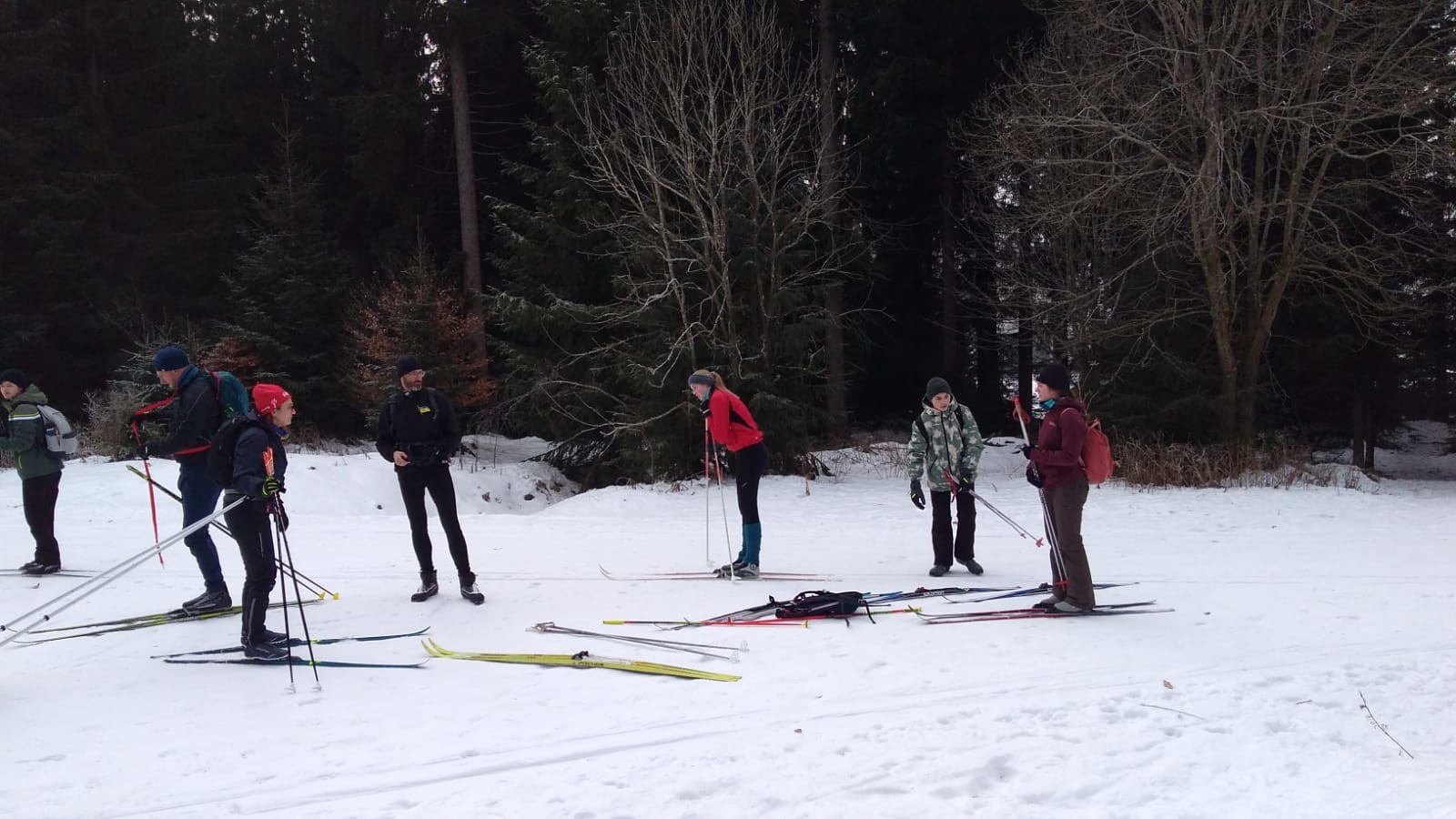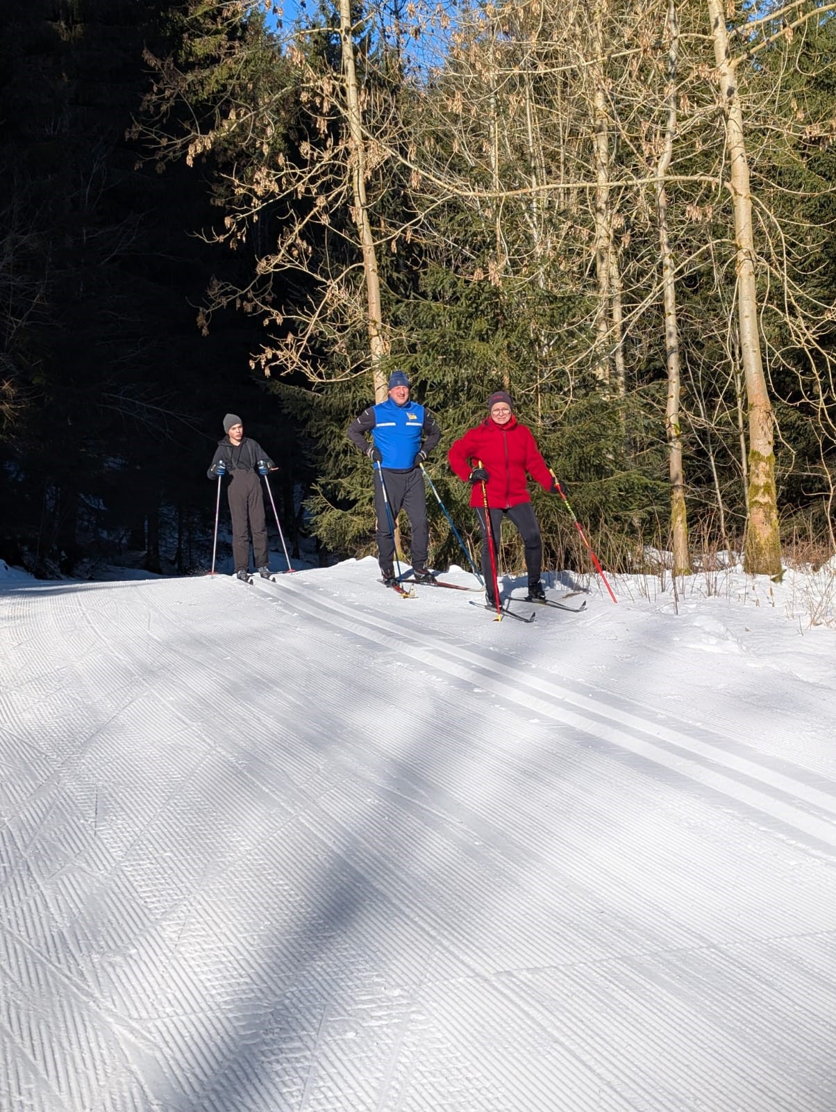 Die erste gute Idee brachte uns am frostigen Samstagmorgen ins sogenannte Eisstadion am Schanzenkomplex. Dort war eine 800m-Runde mit feinstem Kanonenschnee gespurt. Unter Wettkampfbedingungen konnten die ersten Langlaufgrundlagen trainiert bzw. aufgefrischt werden. Zu Mittag gab es im Landschulheim lecker Schnitzel und als Nachtisch Schokopudding. Hinterher war noch etwas Zeit für ein wohlverdientes und gern angenommenes Nickerchen im Kuschelraum. Dann ging es nach Weitersglashütte, um die Loipen zwischen Talsperre und Erzgebirgskamm anzutesten. Mit Einbruch der Dämmerung war man dann wieder in der Herberge, wo bald das Abendbrot aufgetischt war. Danach konnte man sich noch einem kleinen Kulturprogramm hingeben, zu dem jeder etwas Aufschlussreiches beizutragen hatte. Gitarre und Gesang waren auch mit von der Partie, so dass sich späteren Abends sogar eine Auswahl des ebenso anwesenden Apoldaer Schwimmvereins im Gemeinschaftsraum einfand. Der Tag wurde also doch noch etwas länger.