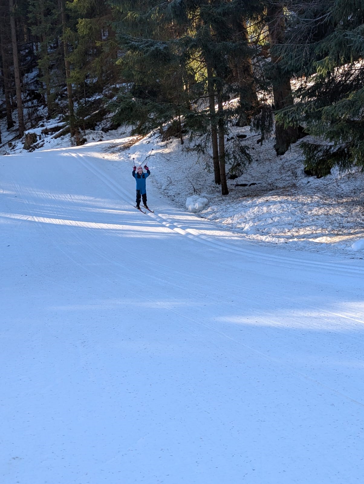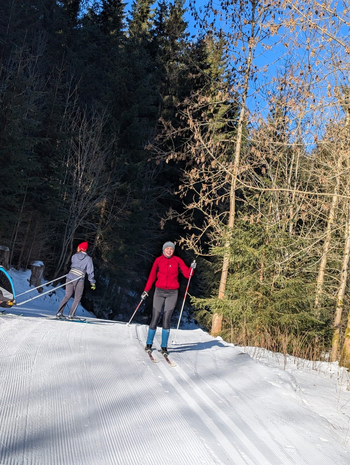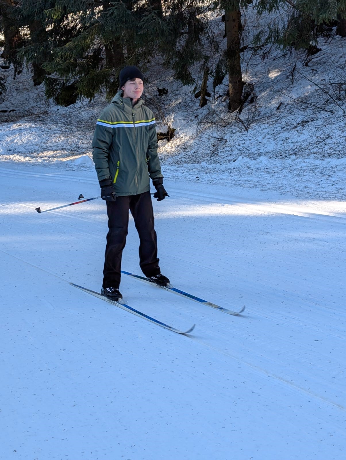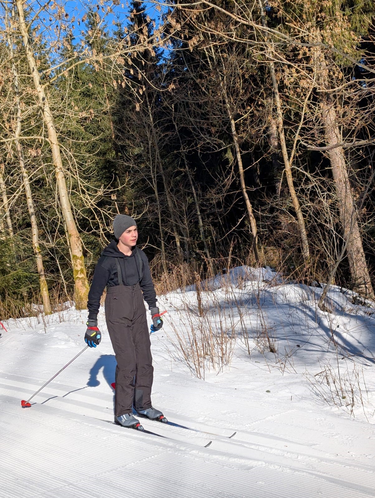 Die erste gute Idee brachte uns am frostigen Samstagmorgen ins sogenannte Eisstadion am Schanzenkomplex. Dort war eine 800m-Runde mit feinstem Kanonenschnee gespurt. Unter Wettkampfbedingungen konnten die ersten Langlaufgrundlagen trainiert bzw. aufgefrischt werden. Zu Mittag gab es im Landschulheim lecker Schnitzel und als Nachtisch Schokopudding. Hinterher war noch etwas Zeit für ein wohlverdientes und gern angenommenes Nickerchen im Kuschelraum. Dann ging es nach Weitersglashütte, um die Loipen zwischen Talsperre und Erzgebirgskamm anzutesten. Mit Einbruch der Dämmerung war man dann wieder in der Herberge, wo bald das Abendbrot aufgetischt war. Danach konnte man sich noch einem kleinen Kulturprogramm hingeben, zu dem jeder etwas Aufschlussreiches beizutragen hatte. Gitarre und Gesang waren auch mit von der Partie, so dass sich späteren Abends sogar eine Auswahl des ebenso anwesenden Apoldaer Schwimmvereins im Gemeinschaftsraum einfand. Der Tag wurde also doch noch etwas länger.