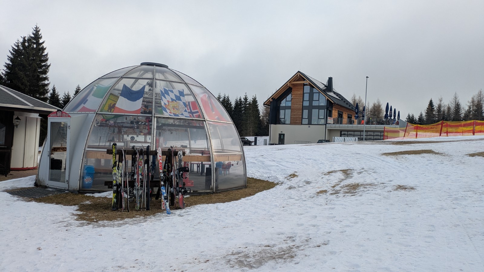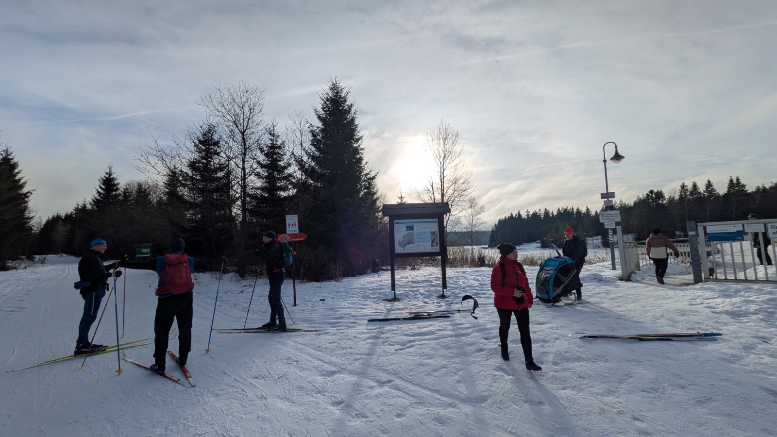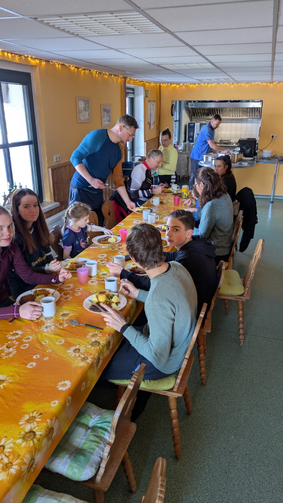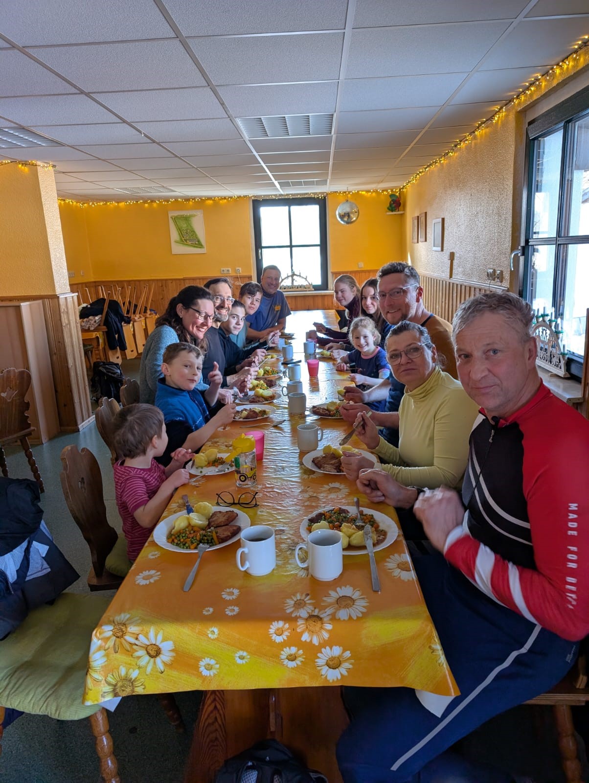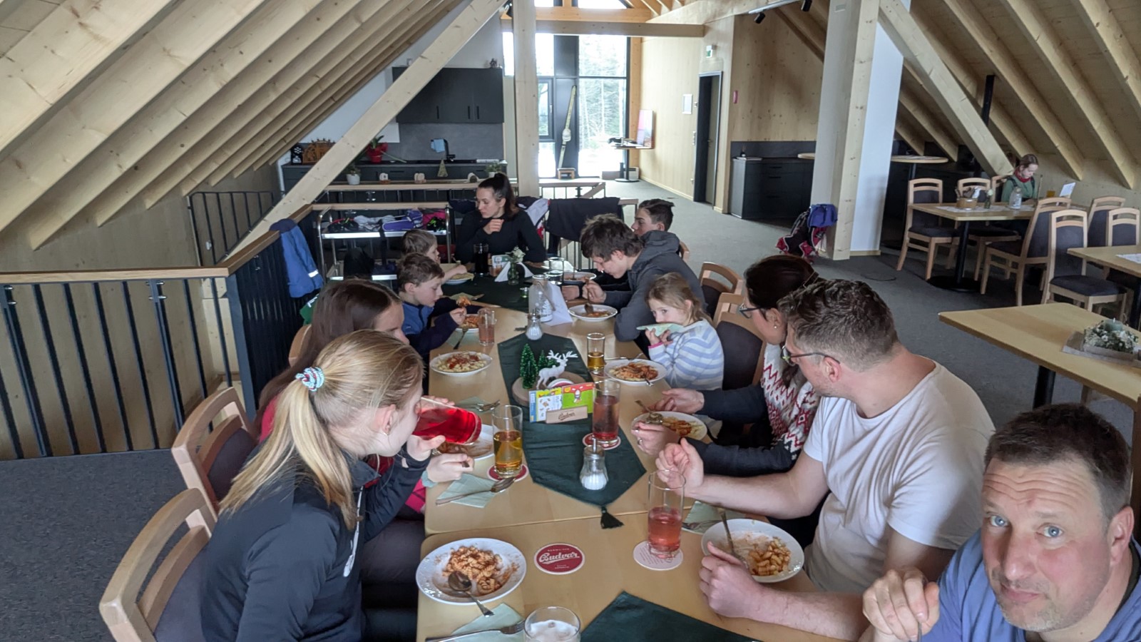 Eine kurze Nacht später hieß es dann: Sonntagsfrühstück, Packen, Stube fegen und Aufsitzen. Ein letztes Mal fuhr man nach Weitersglashütte. Auf dem Plan stand die Umrundung der Talsperre Carlsfeld. Unterwegs sollte als Mittagsziel die neue Baude des Skiclubs am „Bombardino“-Iglu erreicht werden. Das Hauptfeld hatte jedoch einen Abzweig zu früh genommen und musste die Staumauer sowohl „nei- als ah nauszu“ überqueren. Das war jedoch nicht weiter schlimm, denn der Nudelteller schmeckte ausgezeichnet, mit Ausblick auf die Bergstation des Schlepplifts. Zügig schob man sich dann wieder zurück zum Ausgangspunkt. Schließlich hieß es Abschied nehmen vom Erzgebirge, mit bis zu 35km Loipenkilometern und einem schönen Winterwochenende mehr auf der Haben-Seite. Vielen Dank Allen, die dazu beigetragen haben.