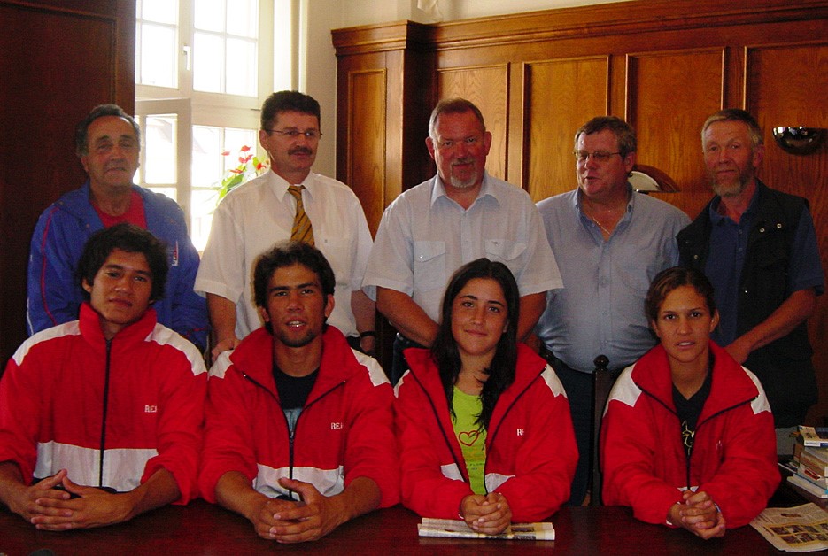 Am Donnerstag nahm sich der OBM von Eilenburg, Hubertus Wacker, die Zeit, um die Delegation mit Gastgebern vom RCE im Rathaus zu empfangen. Ein externer Dolmetscher war nicht erforderlich, denn Präsident Thiede spricht selbst ausgezeichnet unsere Muttersprache. Er bedankte sich in warmen Worten beim Oberbürgermeister für die Gastfreundschaft, die seine Nationalmannschaft nun bereits zum zweiten Mal in Eilenburgs Mauern erlebt. Für uns Eilenburger war es interessant zu hören, dass es einer der Aktiven Paraguays, die sich vor vier Jahren in Eilenburg gleichfalls auf eine Junioren-WM vorbereitet hatten, in die Olympiamannschaft des Landes geschafft hat. Im Einer startete Daniel Sosa auf dem Olympiakurs von Athen 2004 mit einer beachtenswerten Leistung. Trainer Ruben Pesce war des Lobes voll über die Leistungen der Eilenburger, die sie bei der Überwindung der Hochwasserschäden erreicht haben. Gleichwohl machte der Oberbürgermeister klar, wie gut wir Eilenburger Solidarität zu schätzen wüssten. Mit einem kleinen Erinnerungsgeschenk und allen guten Wünschen für optimale Erfolge bei der WM in Brandenburg verabschiedete sich das Stadtoberhaupt und lud die Gäste ein, das Stadtmuseum zu besuchen.