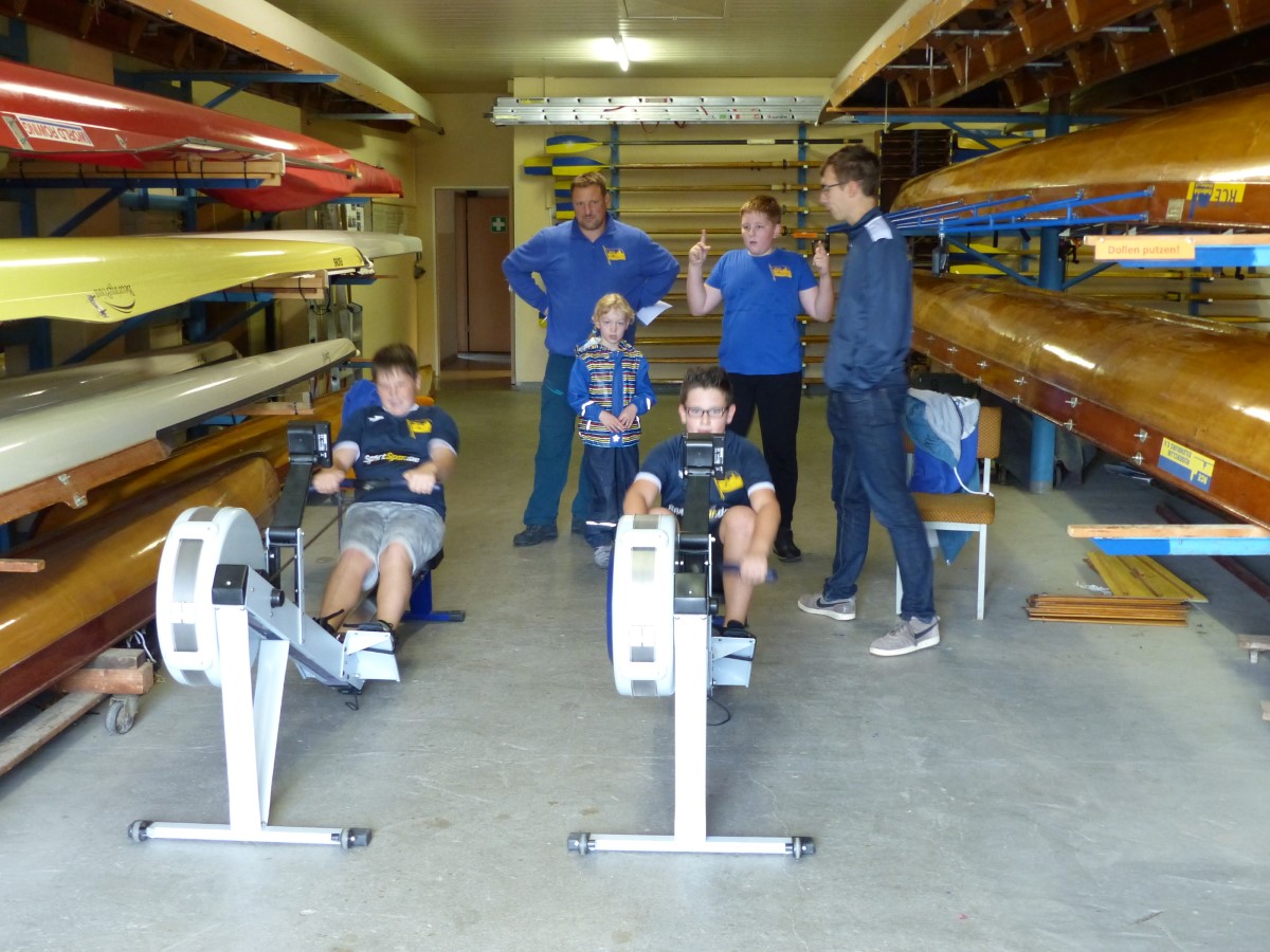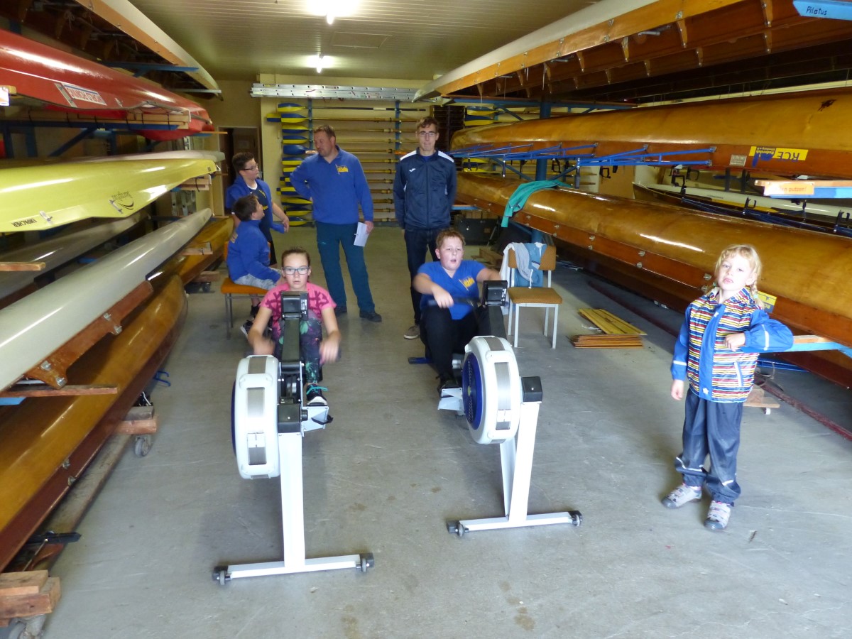 Den Anfang machten unsere Jüngsten, die ihren Wettstreit auf dem Ergometer austrugen. Mit Blick auf den Mühlgraben gaben sie ihr Bestes. Über 500 Meter siegte Peter Kieselstein bei den 10/11jährigen mit einer halben Sekunde Abstand vor Tilmann Domin. Vereinsmeister der Alterklasse 12/13 wurden Helene Weist und Tobias Ulrich, die bereits auf die 1000-Meter-Strecke gingen.