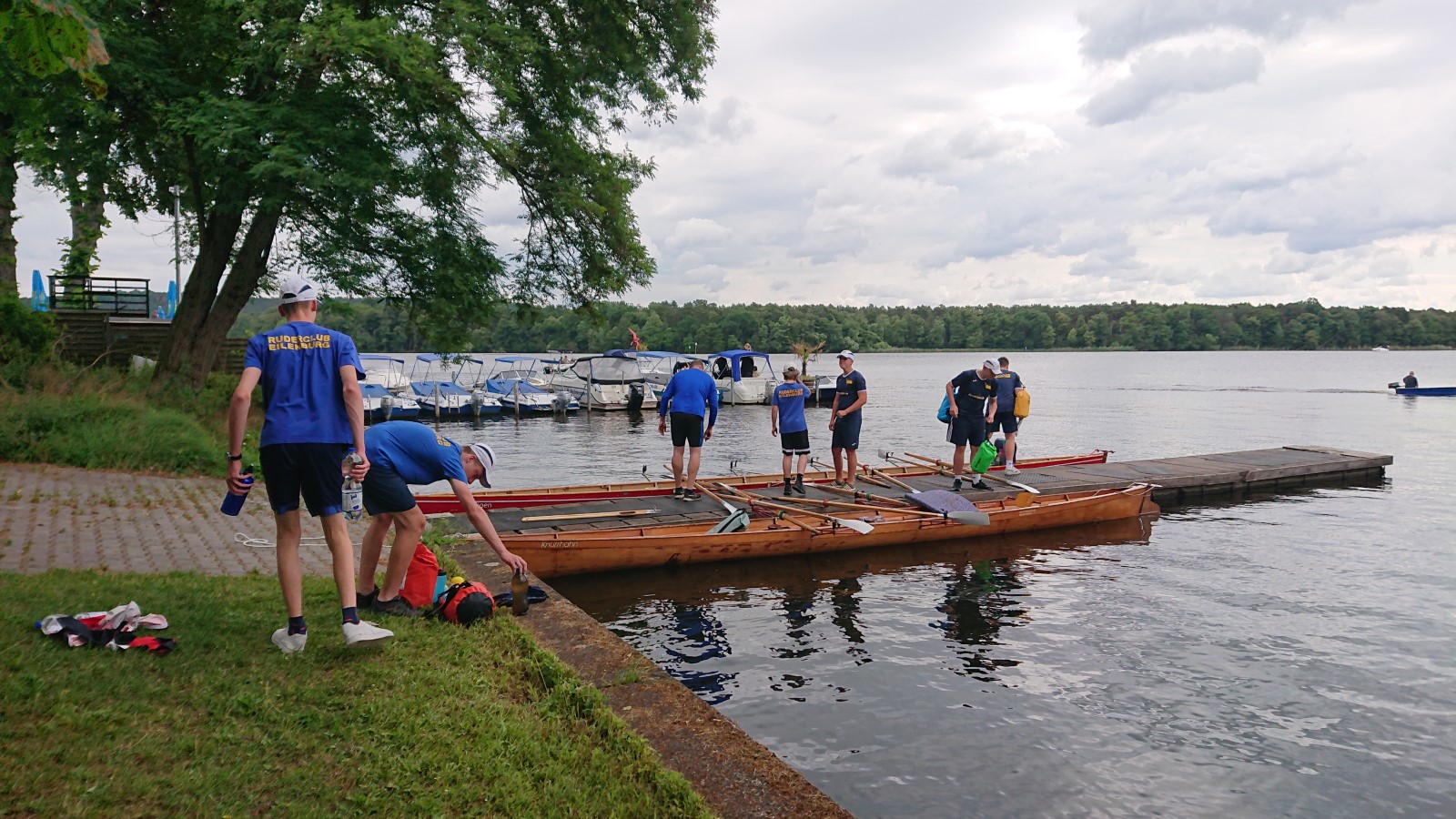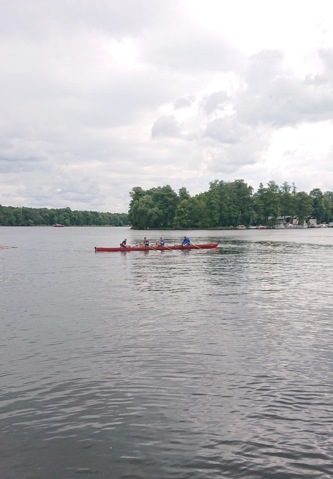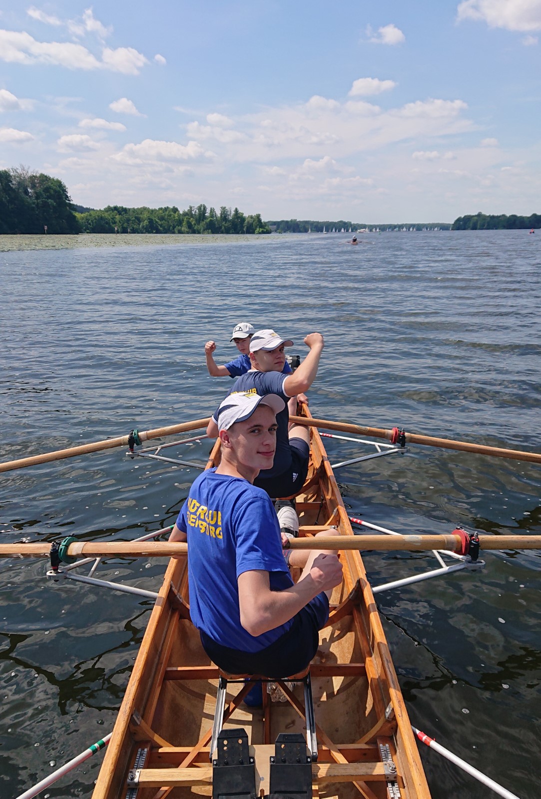 Nach dem Frühstück am nächsten Morgen bereiteten wir uns alle auf die bevorstehende Wanderfahrt vor. Dafür losten wir die Besatzung des Vierers (Rügen) und des Zweiers (Knurrhahn) aus. Nach dem Zuwasserlassen der Boote legten wir ca. 10:30 Uhr ab. Zuerst fuhren wir über den langen See in Richtung Schmöckwitz, dabei konnten wir eine Segelboot-Regatta beobachten. Von dort aus ruderten wir weiter in den Seddinsee und dann in den Gosener Kanal. Als wir letzteren passierten, kamen wir am Imbiss Sturzbecher vorbei, wo wir das erste Mal anlegten und Rast machten. Nachdem wir uns gestärkt hatten, fuhren wir weiter über den alten Spreearm durch „Neu Venedig“. Nach Passieren dieses Abschnitts, welcher durch seine große Menge an kleinen Nebenkanälen sehr an die oberitalienische Stadt erinnerte, fuhren wir rüber auf den Kleinen Müggelsee. An dessen Ende schloss sich der Große Müggelsee an. Aufgrund der durch den Wind entstehenden Wellen konnten wir auf dem großen Müggelsee keine Pause machen und fuhren komplett durch bis zum Ruderclub Ägir. Schon während der Überfahrt kam uns die gerade stattfindende Achterregatta entgegen. Als wir Ägir erreichten, machten wir dort unsere zweite große Landpause. Vor dem Bootshaus stärkten wir uns mit etwas Essen vom Grill sowie Gebäck und Getränken. Eine Liveband war auch vor Ort. Gegen 17:30 Uhr ging es dann wieder zurück zu den Booten und wir legten ab. Wir fuhren über die Spree in die Altstadt Köpenick, dort befanden sich zahlreiche Brücken, welche immer von einem Bootsmitglied angesagt wurden. Nachdem wir die Altstadt passierten, ging es auf die Dahme. Dann am Teltowkanal vorbei und über die Regattastrecke Grünau. Als diese überquert war, kam nur noch die Bammelecke. Danach sahen wir schon unser Ziel, das Bootshaus Richtershorn. Nach dieser etwa 30 Kilometer umfassenden Umfahrt, sprangen wir freudig in den See und aßen danach Leckeres vom Grill, zubereitet durch Steffen und Tillmann. Wenig später bauten wir das Lagerfeuer auf, an dem wir den restlichen Abend verweilten. Zu später Stunde kam der an der Regatta teilnehmende Achter des Vereins Richtershorn zurück. Diesem halfen wir, das Boot in die Halle zu tragen. Nach getaner Arbeit saßen wir noch kurz am Feuer und gingen dann ins Schlaflager unter dem Dach des Bootshauses.