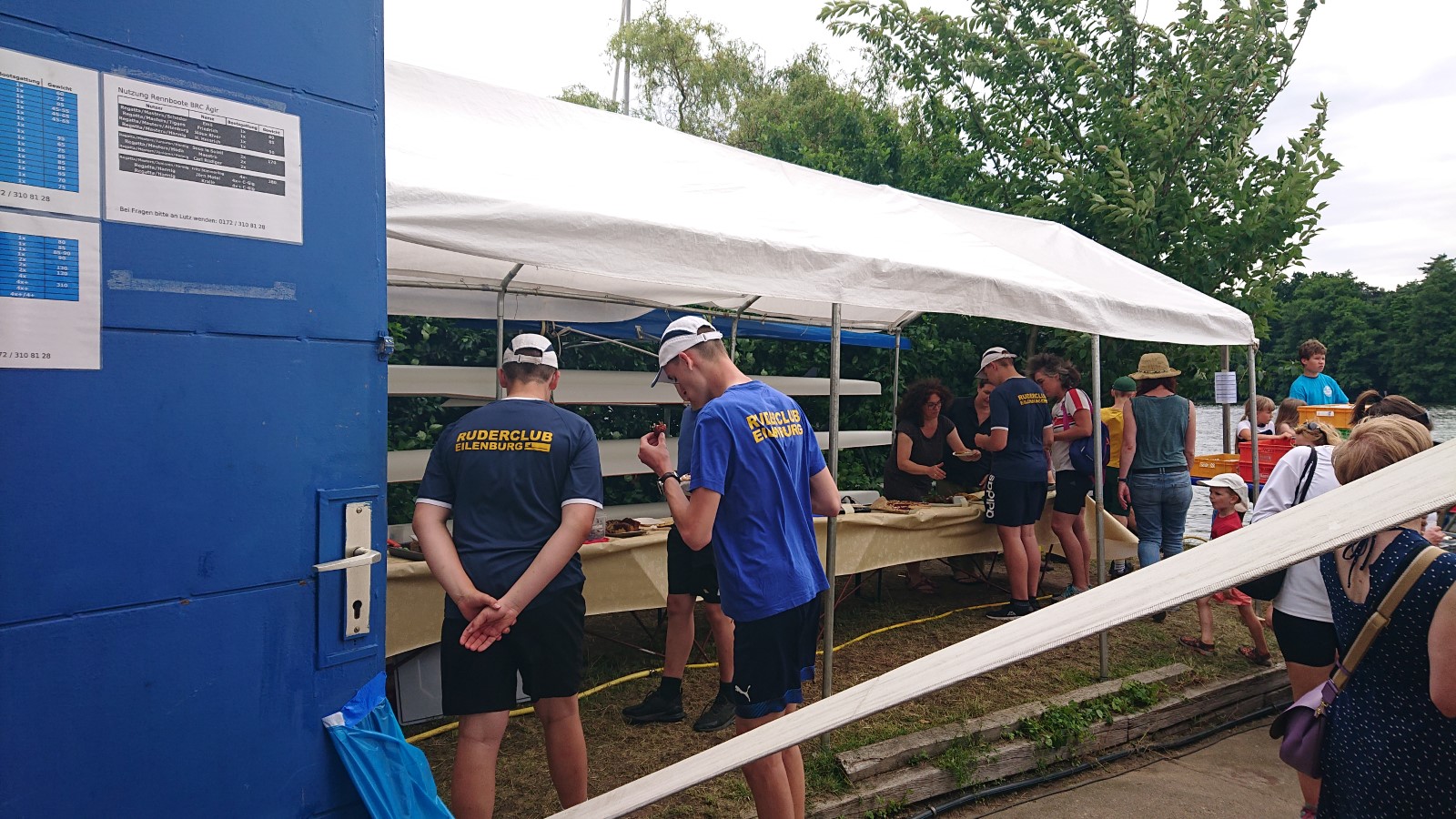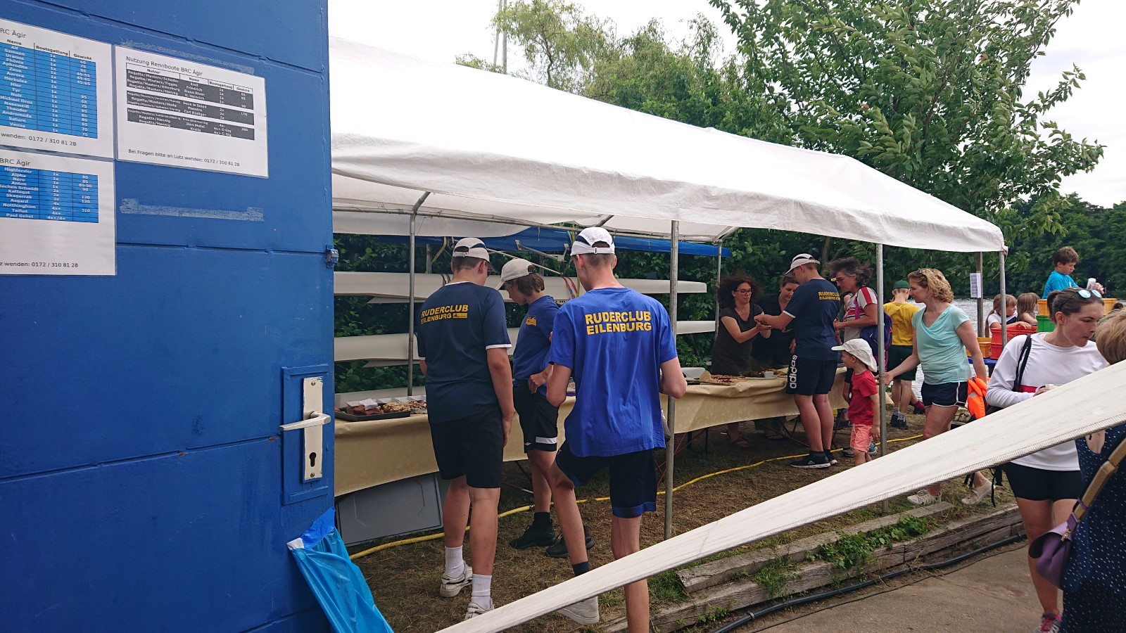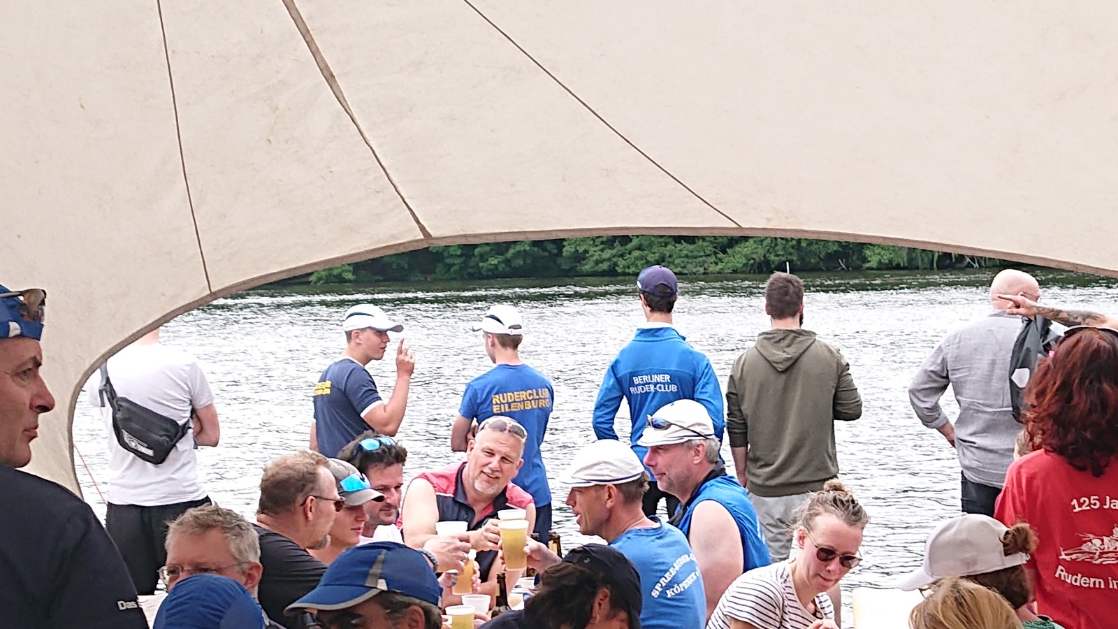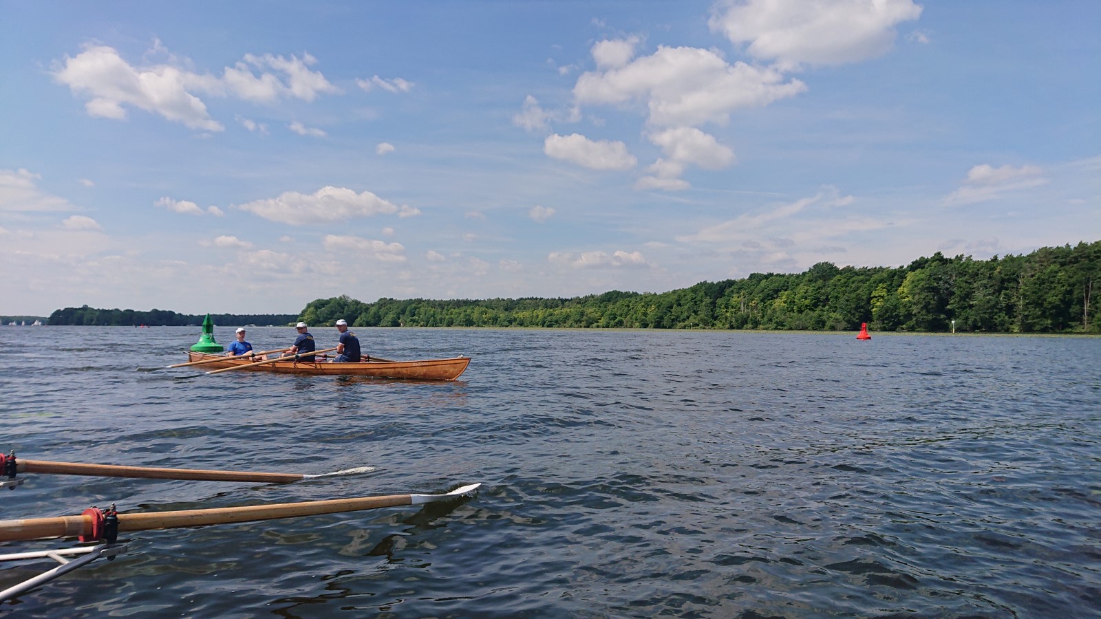 Nach dem Frühstück am nächsten Morgen bereiteten wir uns alle auf die bevorstehende Wanderfahrt vor. Dafür losten wir die Besatzung des Vierers (Rügen) und des Zweiers (Knurrhahn) aus. Nach dem Zuwasserlassen der Boote legten wir ca. 10:30 Uhr ab. Zuerst fuhren wir über den langen See in Richtung Schmöckwitz, dabei konnten wir eine Segelboot-Regatta beobachten. Von dort aus ruderten wir weiter in den Seddinsee und dann in den Gosener Kanal. Als wir letzteren passierten, kamen wir am Imbiss Sturzbecher vorbei, wo wir das erste Mal anlegten und Rast machten. Nachdem wir uns gestärkt hatten, fuhren wir weiter über den alten Spreearm durch „Neu Venedig“. Nach Passieren dieses Abschnitts, welcher durch seine große Menge an kleinen Nebenkanälen sehr an die oberitalienische Stadt erinnerte, fuhren wir rüber auf den Kleinen Müggelsee. An dessen Ende schloss sich der Große Müggelsee an. Aufgrund der durch den Wind entstehenden Wellen konnten wir auf dem großen Müggelsee keine Pause machen und fuhren komplett durch bis zum Ruderclub Ägir. Schon während der Überfahrt kam uns die gerade stattfindende Achterregatta entgegen. Als wir Ägir erreichten, machten wir dort unsere zweite große Landpause. Vor dem Bootshaus stärkten wir uns mit etwas Essen vom Grill sowie Gebäck und Getränken. Eine Liveband war auch vor Ort. Gegen 17:30 Uhr ging es dann wieder zurück zu den Booten und wir legten ab. Wir fuhren über die Spree in die Altstadt Köpenick, dort befanden sich zahlreiche Brücken, welche immer von einem Bootsmitglied angesagt wurden. Nachdem wir die Altstadt passierten, ging es auf die Dahme. Dann am Teltowkanal vorbei und über die Regattastrecke Grünau. Als diese überquert war, kam nur noch die Bammelecke. Danach sahen wir schon unser Ziel, das Bootshaus Richtershorn. Nach dieser etwa 30 Kilometer umfassenden Umfahrt, sprangen wir freudig in den See und aßen danach Leckeres vom Grill, zubereitet durch Steffen und Tillmann. Wenig später bauten wir das Lagerfeuer auf, an dem wir den restlichen Abend verweilten. Zu später Stunde kam der an der Regatta teilnehmende Achter des Vereins Richtershorn zurück. Diesem halfen wir, das Boot in die Halle zu tragen. Nach getaner Arbeit saßen wir noch kurz am Feuer und gingen dann ins Schlaflager unter dem Dach des Bootshauses.