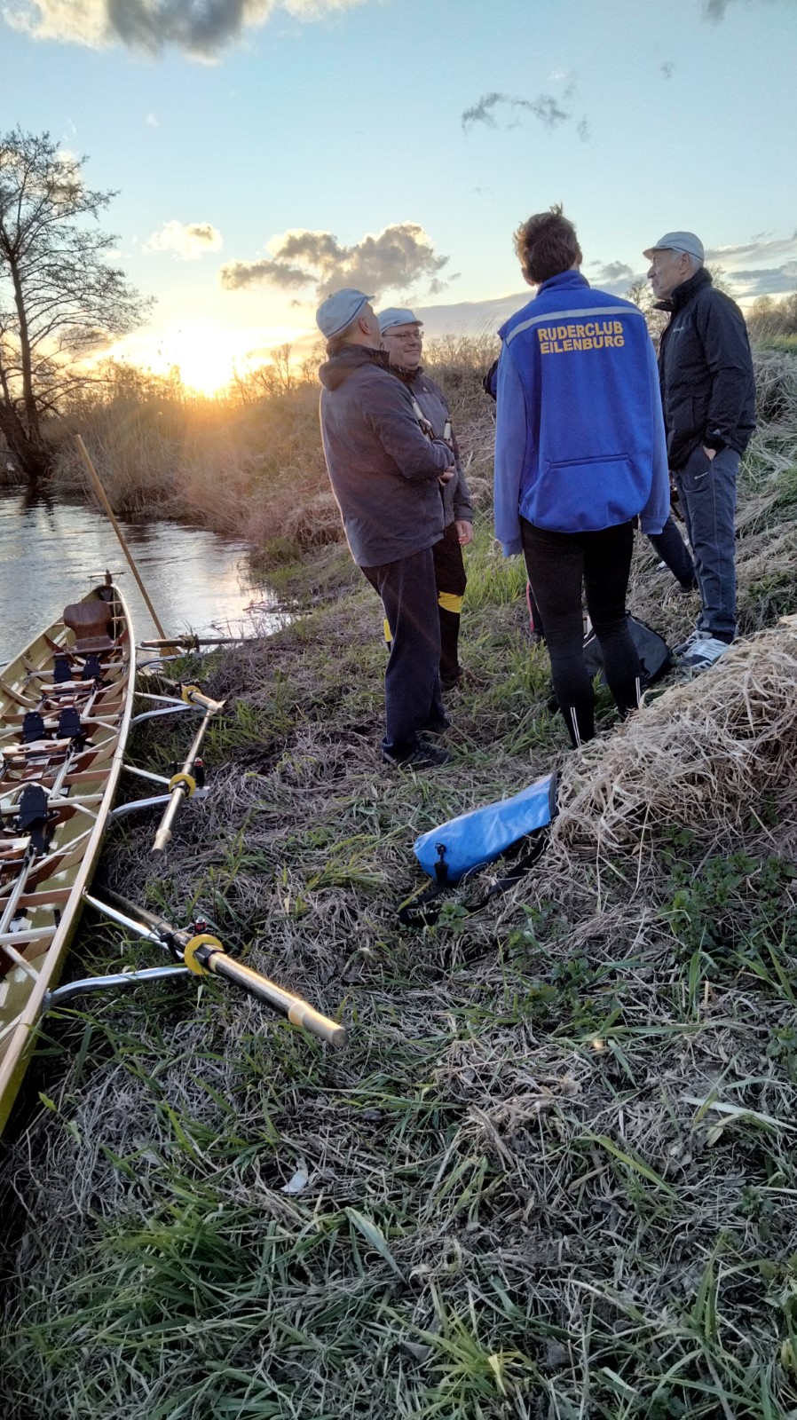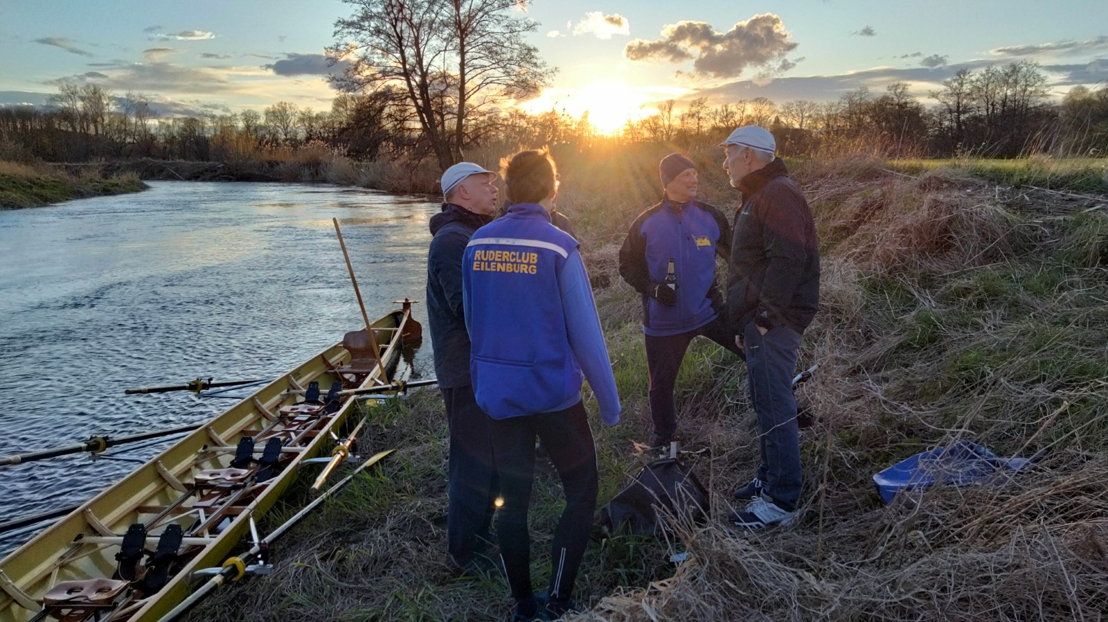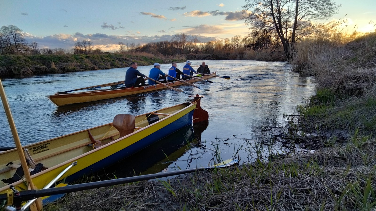 Extra zeitig, nämlich 17 Uhr, sollte es auf die traditionelle Gründonnerstagsausfahrt gehen. Zwei Doppelvierer und ein Radfahrer waren am Start. Mehr oder weniger schnell kamen alle in die Pötte. Mit dem Abendrot wurde es zunehmend frisch in der Mühlgrabenaue, was eine zügige Heimkehr begünstigte.