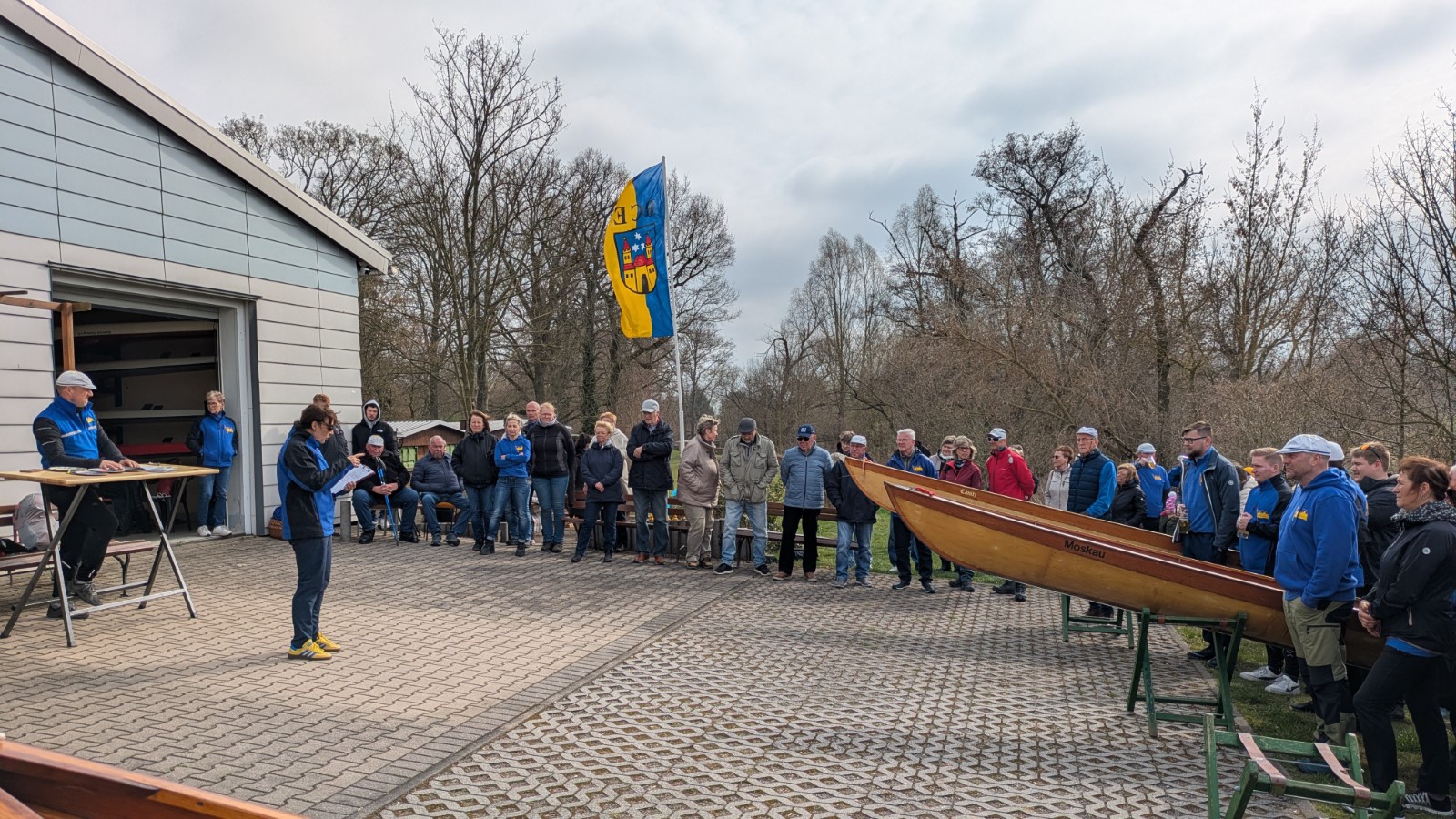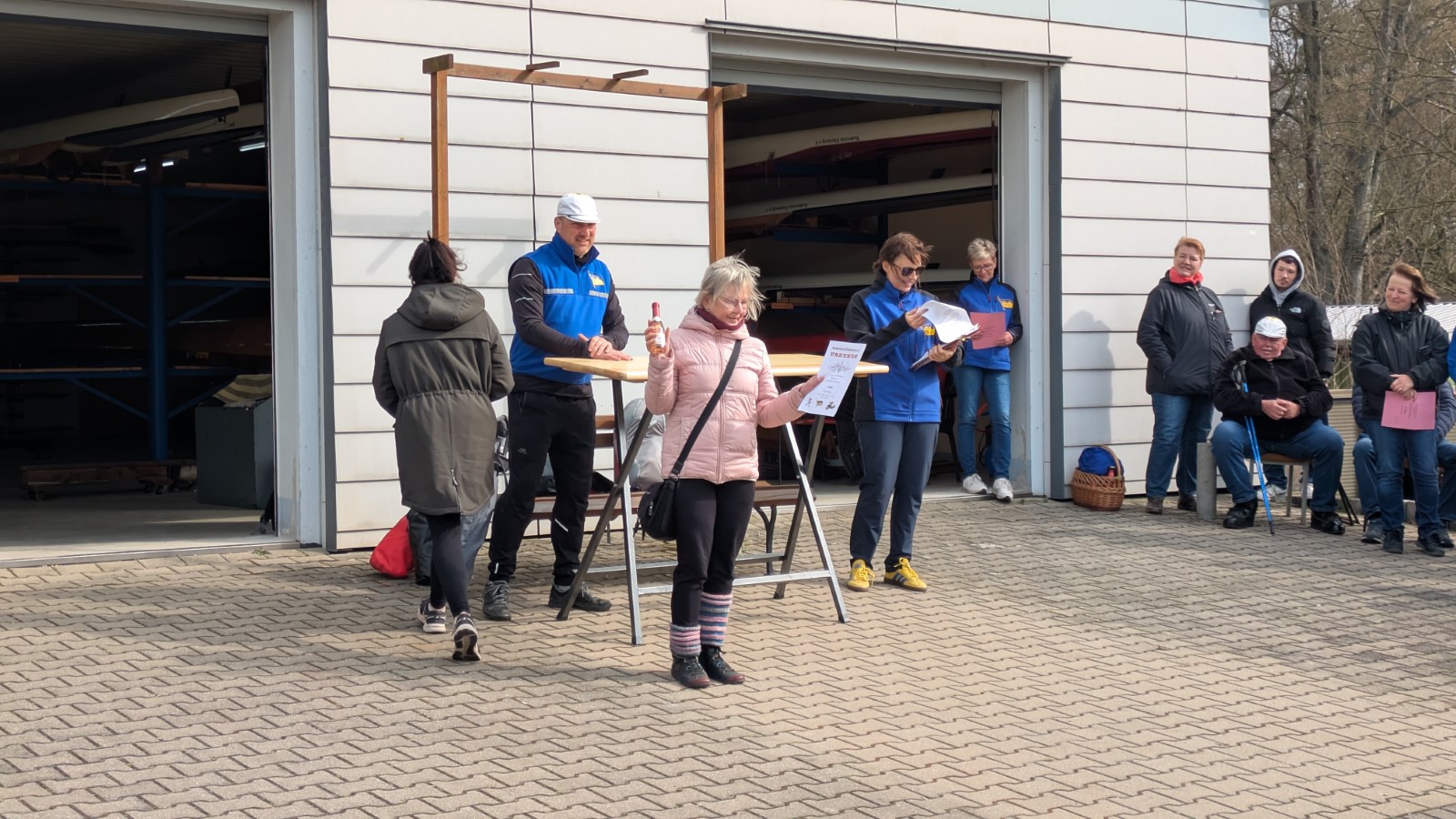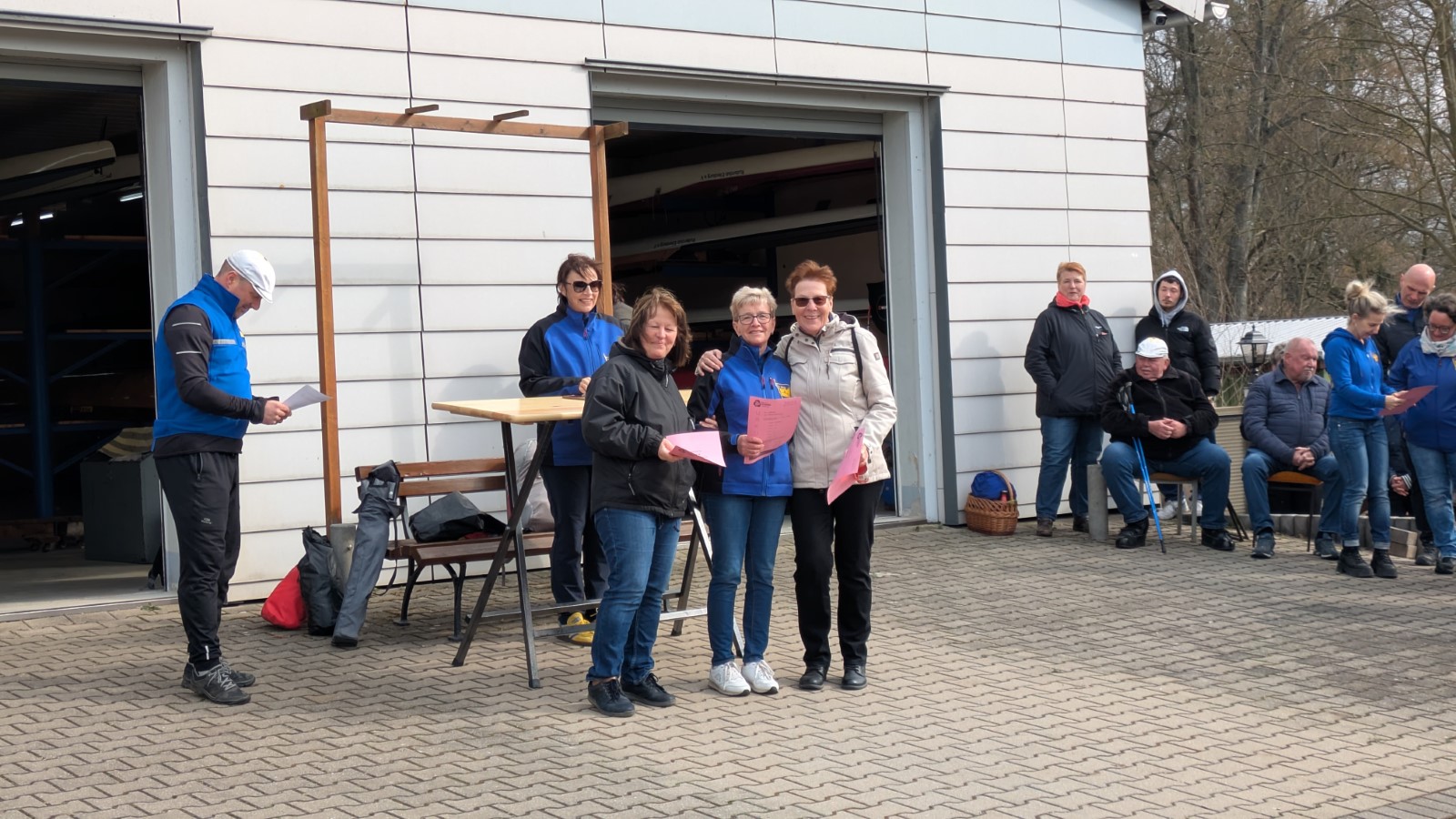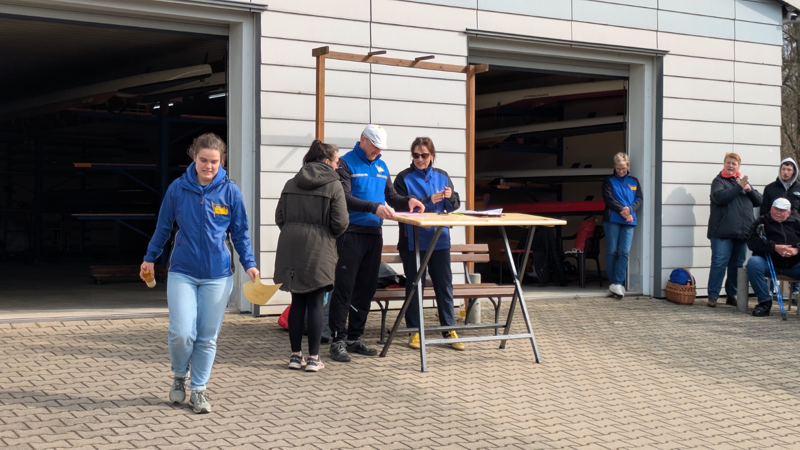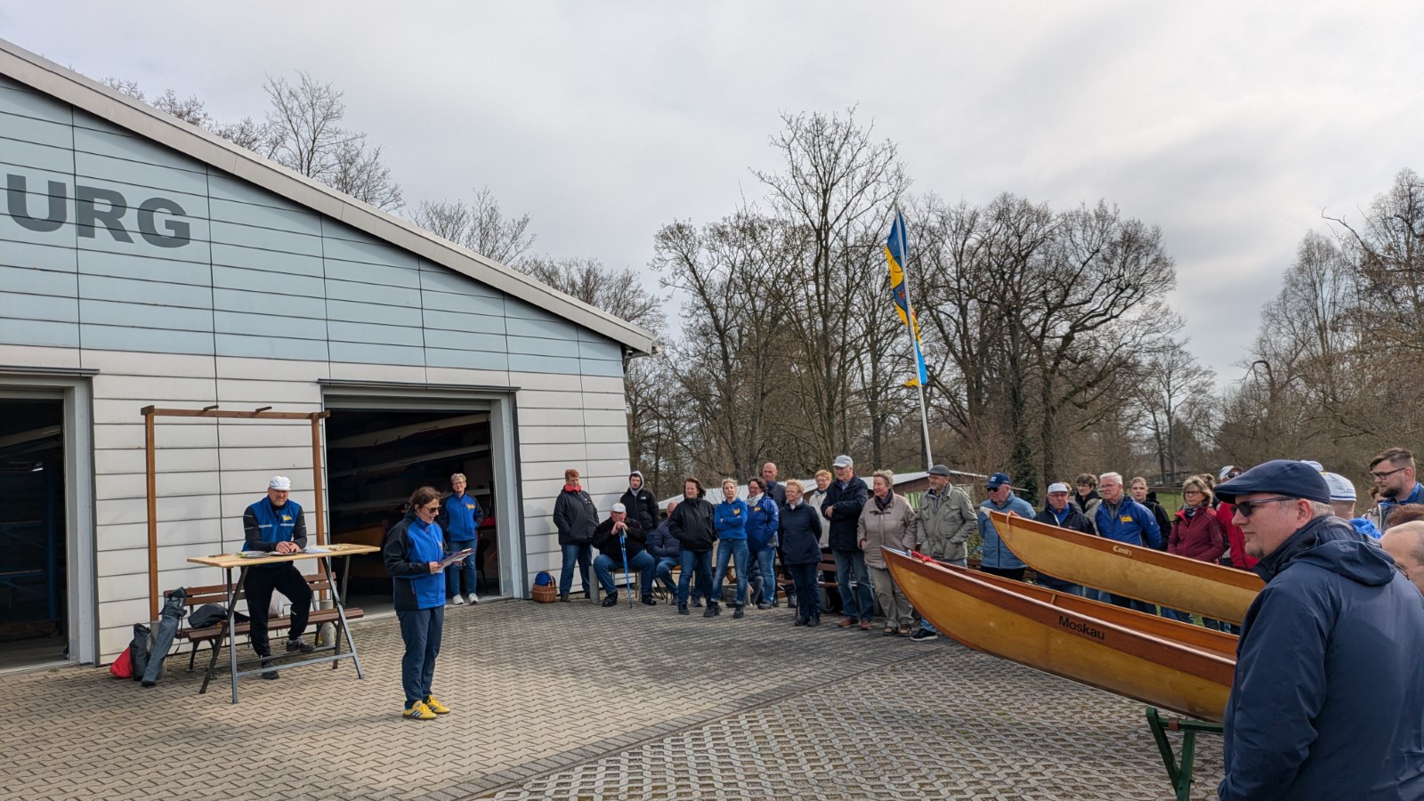 Derweil wurden vor der Bootshalle schon Boote vorbereitet und Besatzungen zusammengelistet. Pünktlich begrüßte die Vorsitzende Silke Gans die neue Saison mit der Ansprache, den Belehrungen, dem Rückblick auf die vergangene Winterpause und die Vorschau auf das Kommende. Sportwart André ehrte die Sieger und Platzierten des Tischtennisturniers, der Ergometer-Meisterschaft und der Women‘s Rowing Challenge. Nach der Aufforderung „Boote zu Wasser und Riemen zur Hand“ nahm die neue Saison an Fahrt auf.