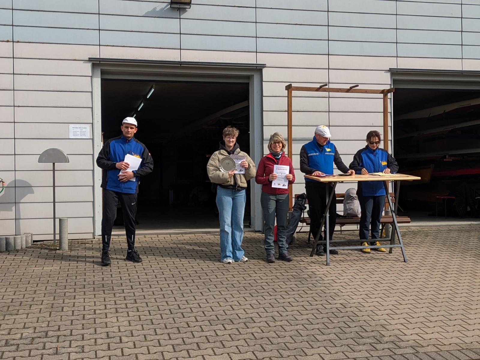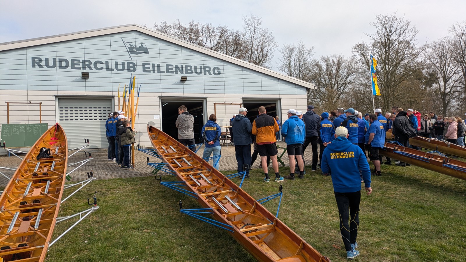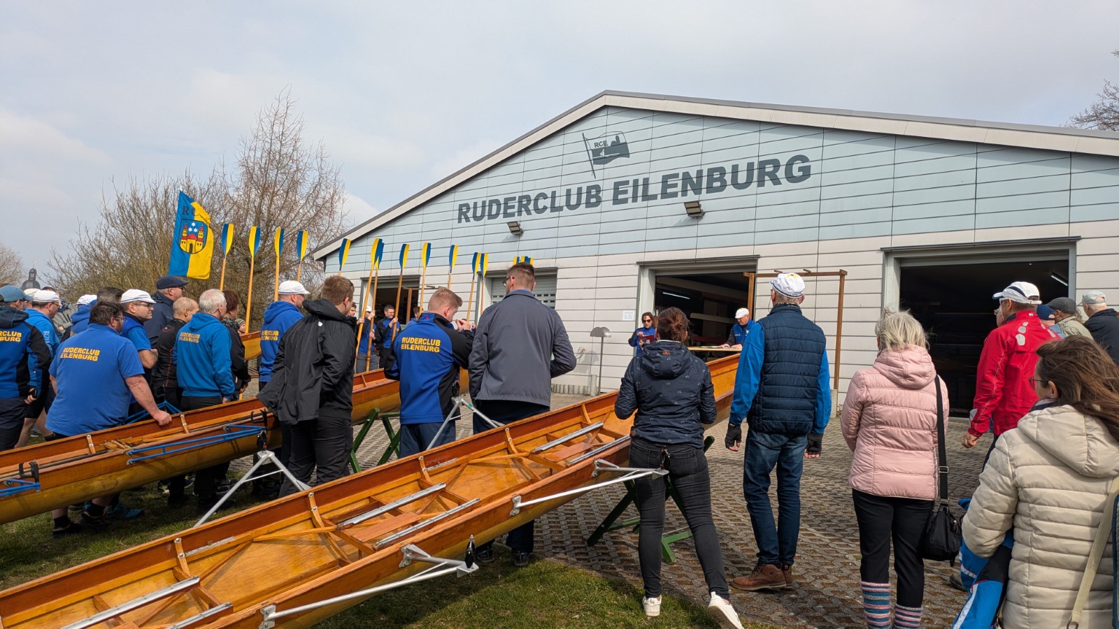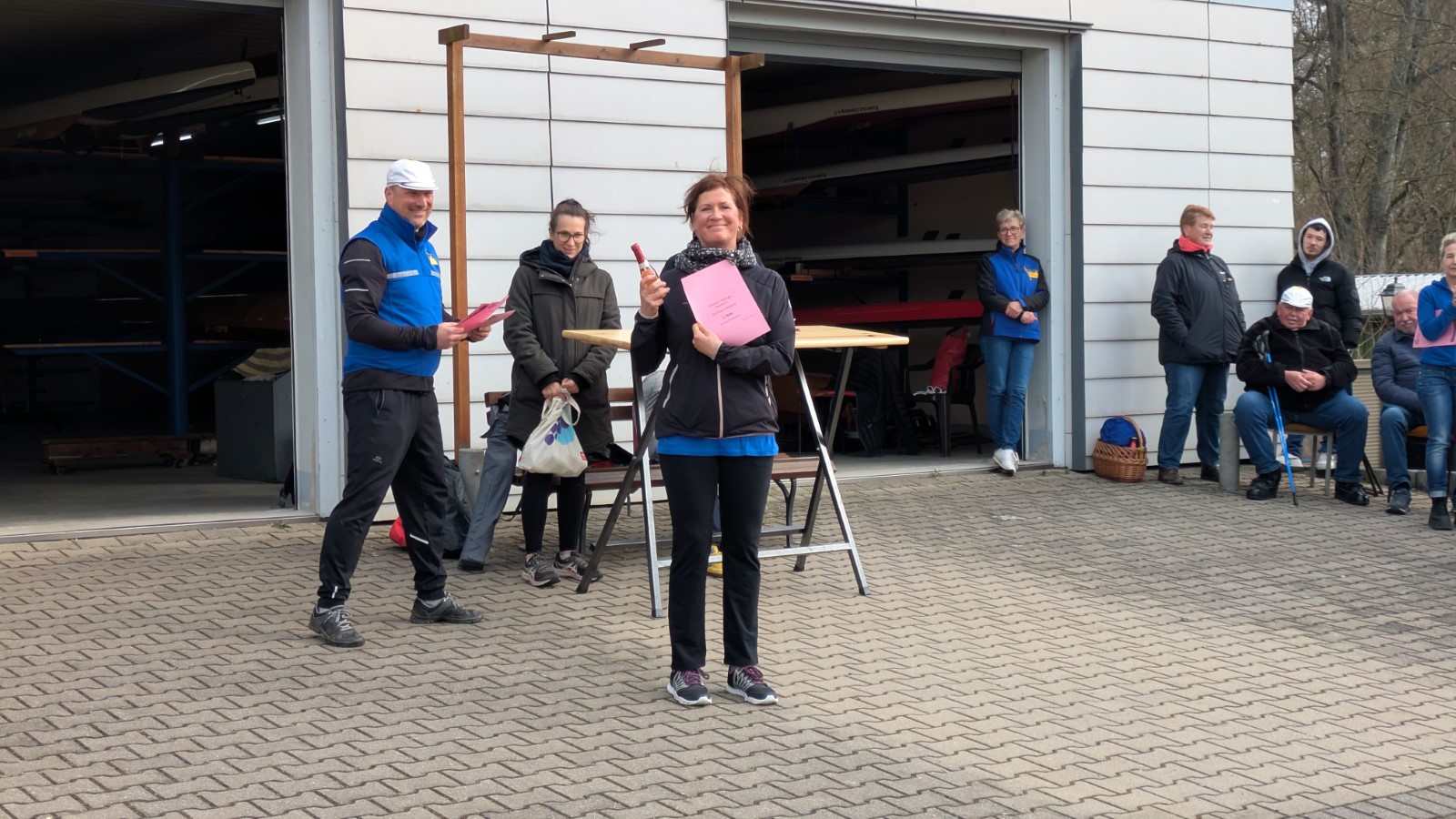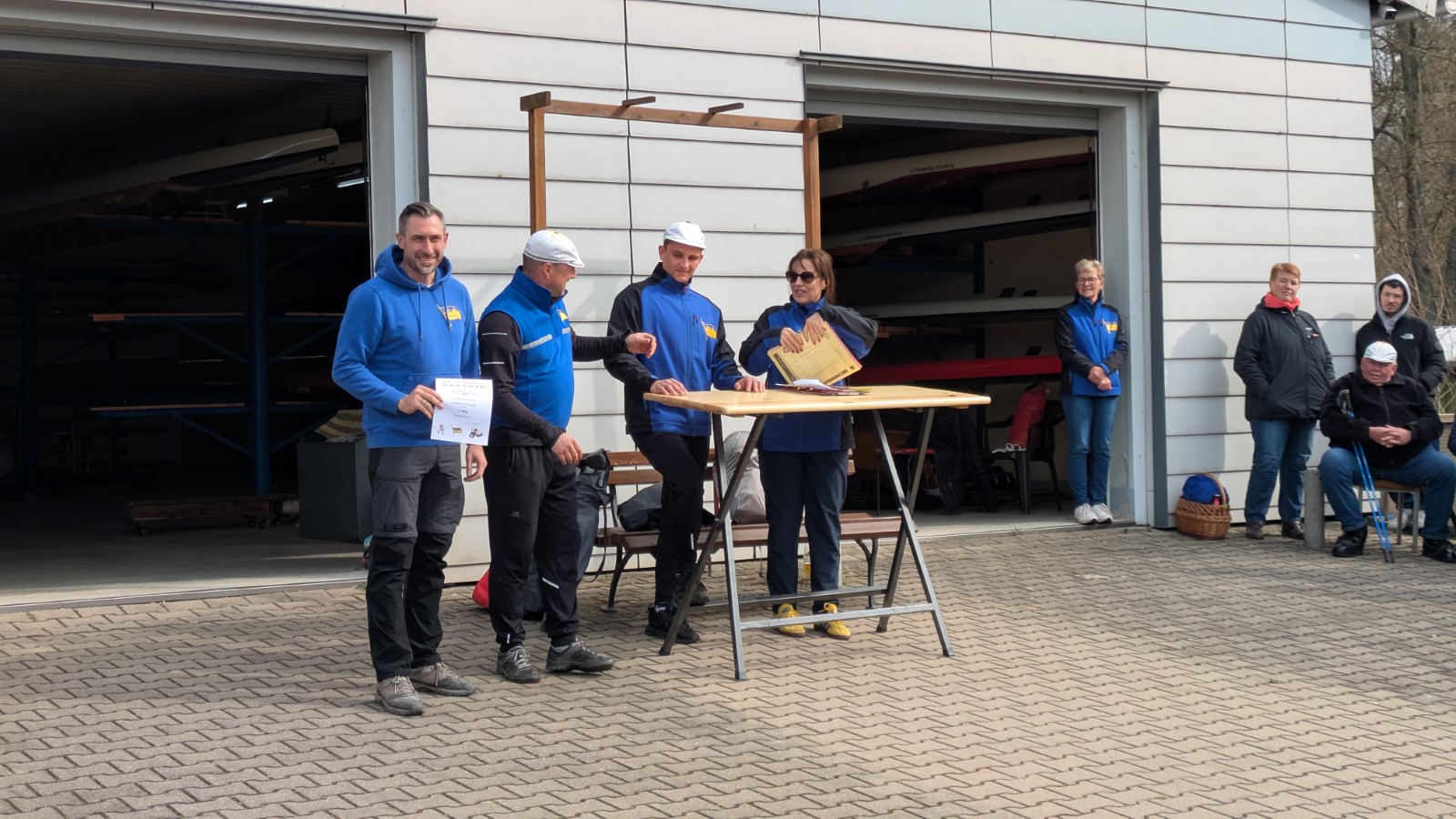 Derweil wurden vor der Bootshalle schon Boote vorbereitet und Besatzungen zusammengelistet. Pünktlich begrüßte die Vorsitzende Silke Gans die neue Saison mit der Ansprache, den Belehrungen, dem Rückblick auf die vergangene Winterpause und die Vorschau auf das Kommende. Sportwart André ehrte die Sieger und Platzierten des Tischtennisturniers, der Ergometer-Meisterschaft und der Women‘s Rowing Challenge. Nach der Aufforderung „Boote zu Wasser und Riemen zur Hand“ nahm die neue Saison an Fahrt auf.