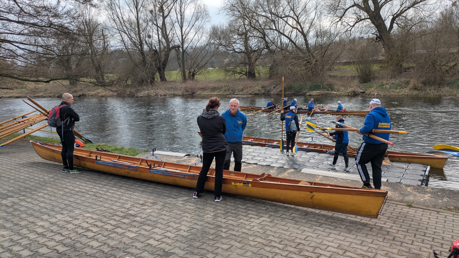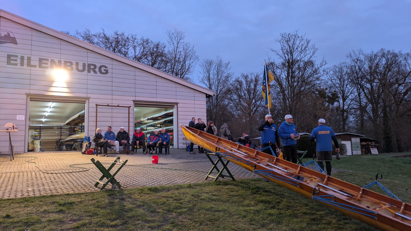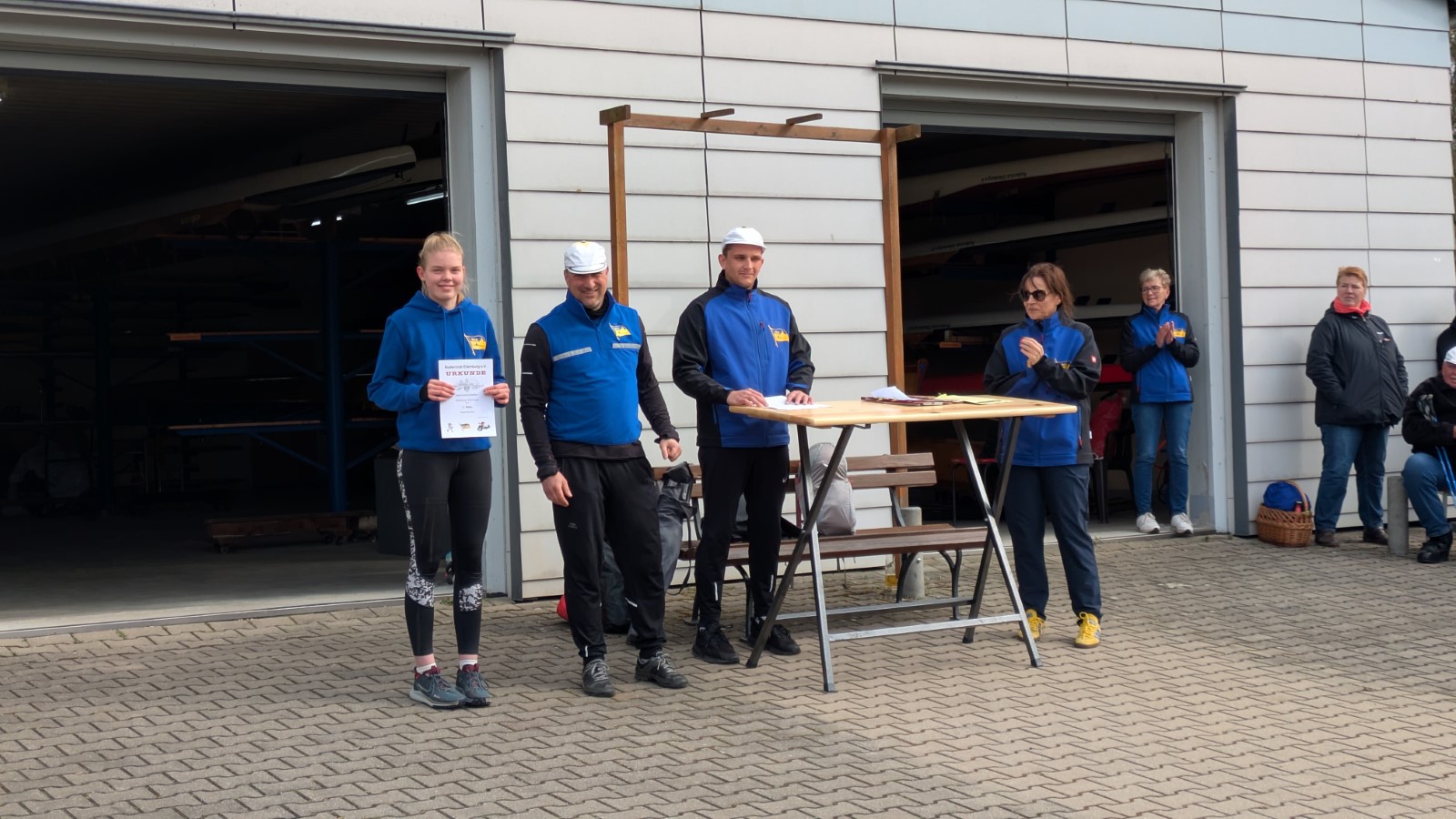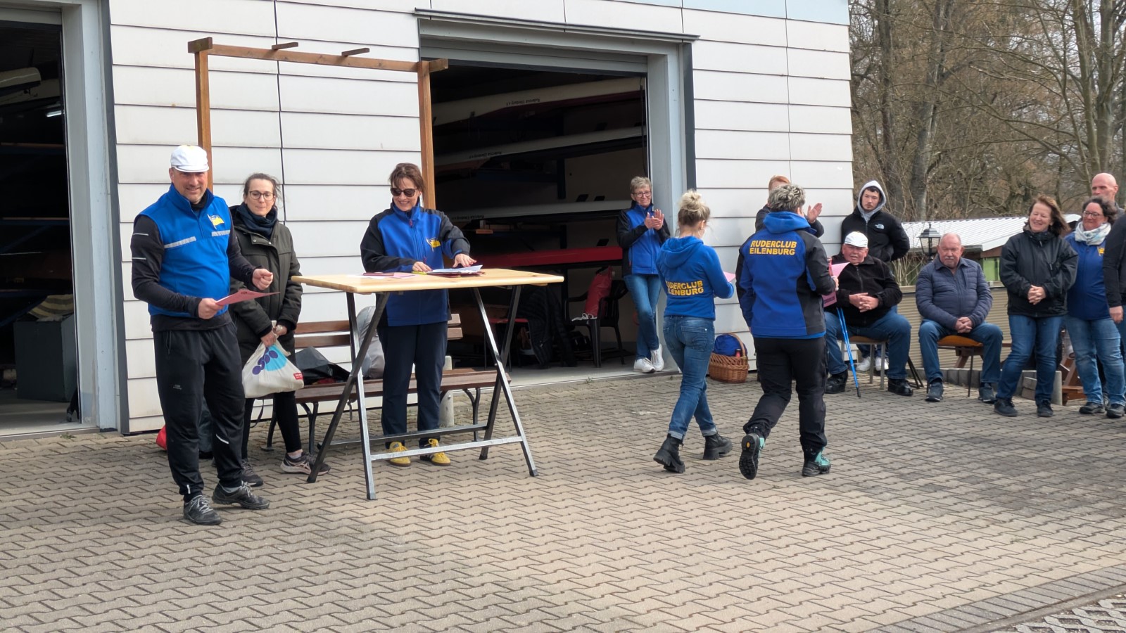 Derweil wurden vor der Bootshalle schon Boote vorbereitet und Besatzungen zusammengelistet. Pünktlich begrüßte die Vorsitzende Silke Gans die neue Saison mit der Ansprache, den Belehrungen, dem Rückblick auf die vergangene Winterpause und die Vorschau auf das Kommende. Sportwart André ehrte die Sieger und Platzierten des Tischtennisturniers, der Ergometer-Meisterschaft und der Women‘s Rowing Challenge. Nach der Aufforderung „Boote zu Wasser und Riemen zur Hand“ nahm die neue Saison an Fahrt auf.