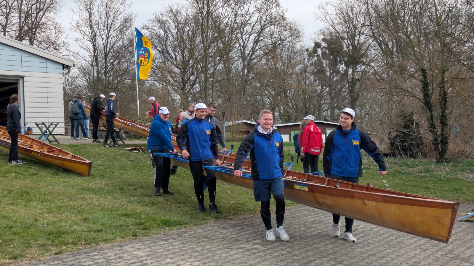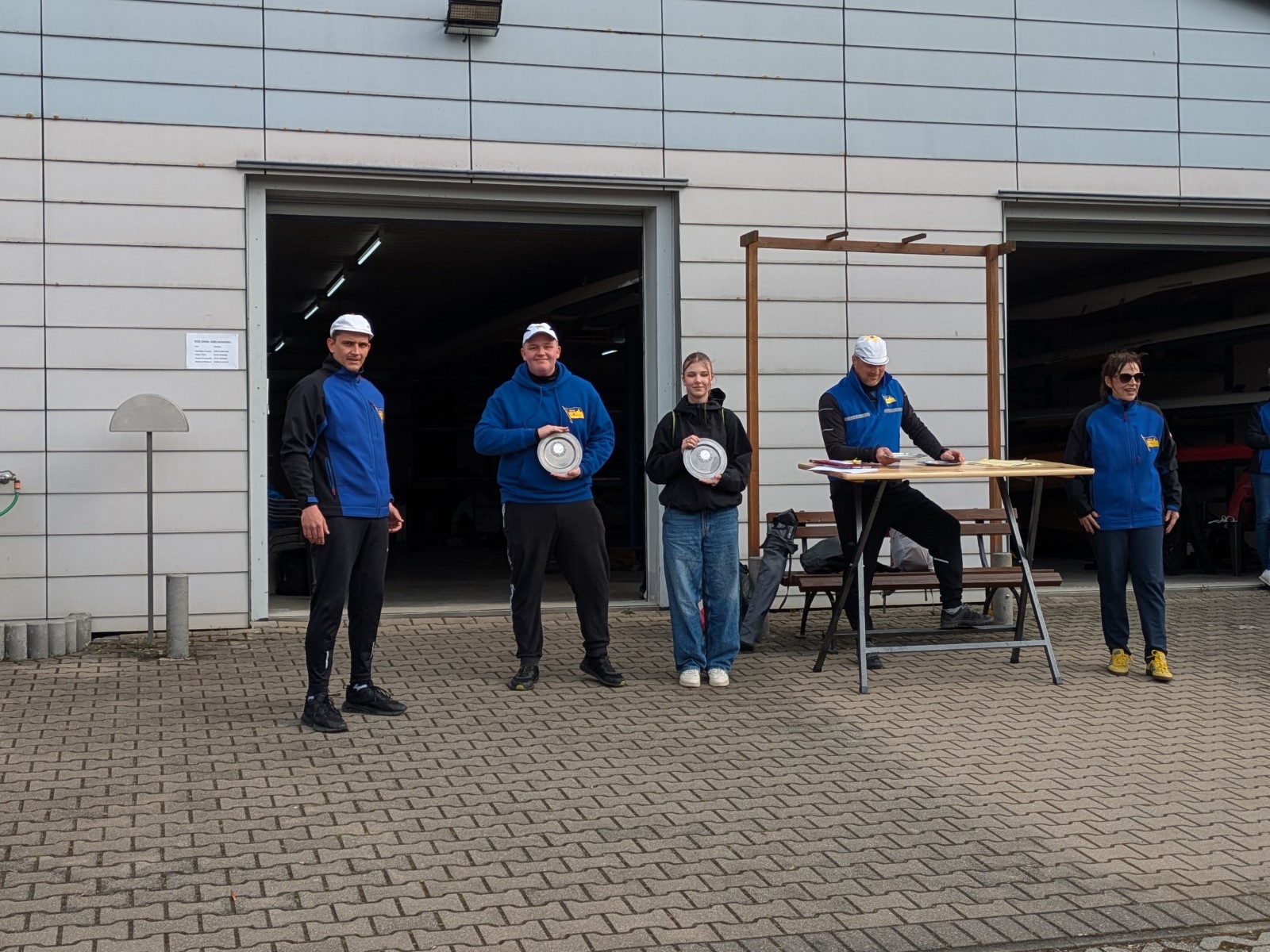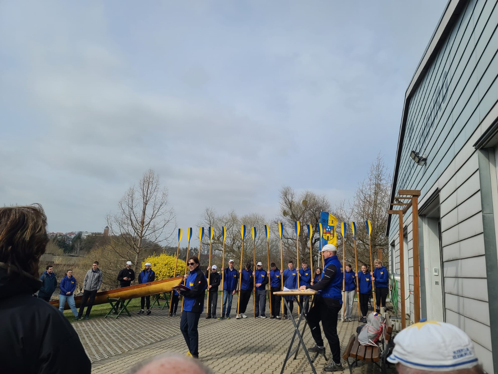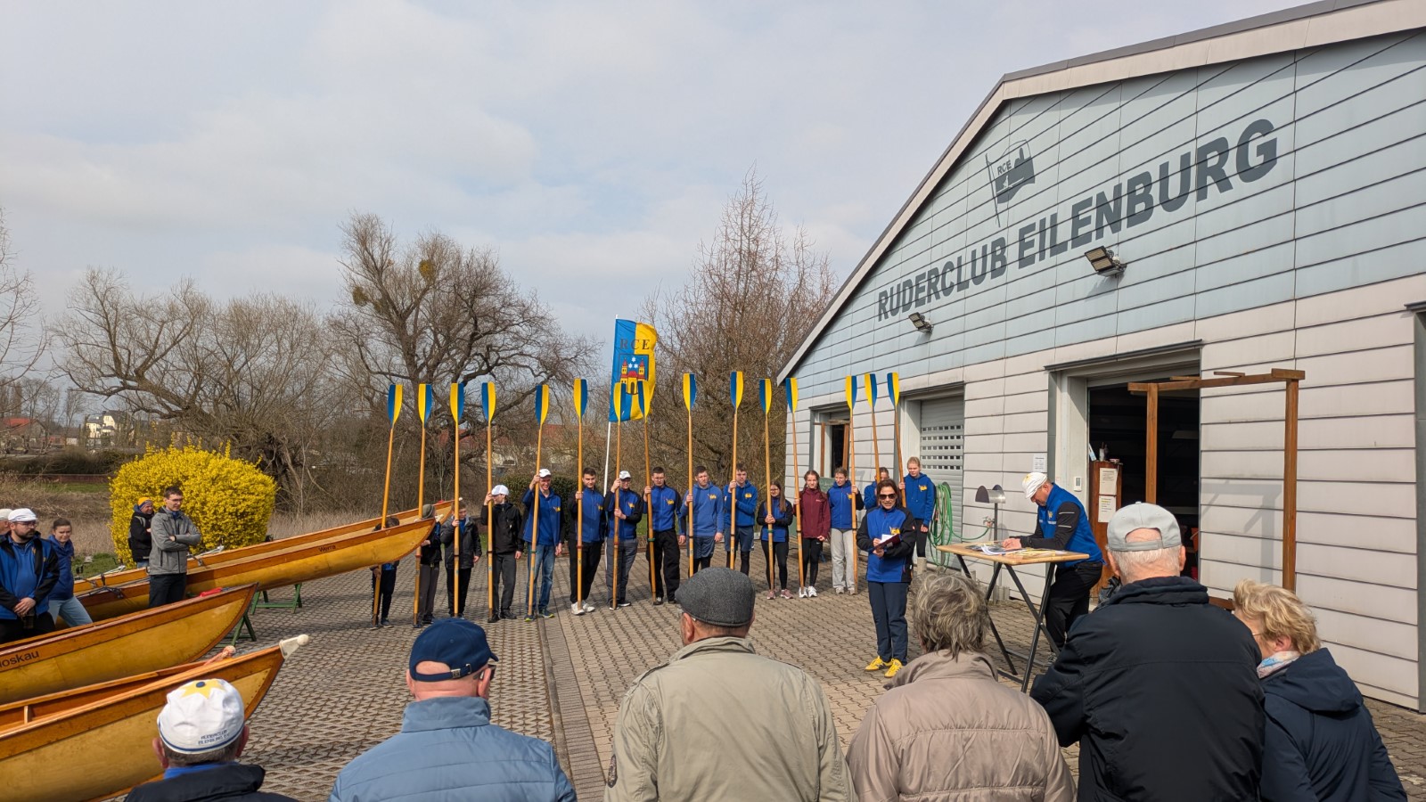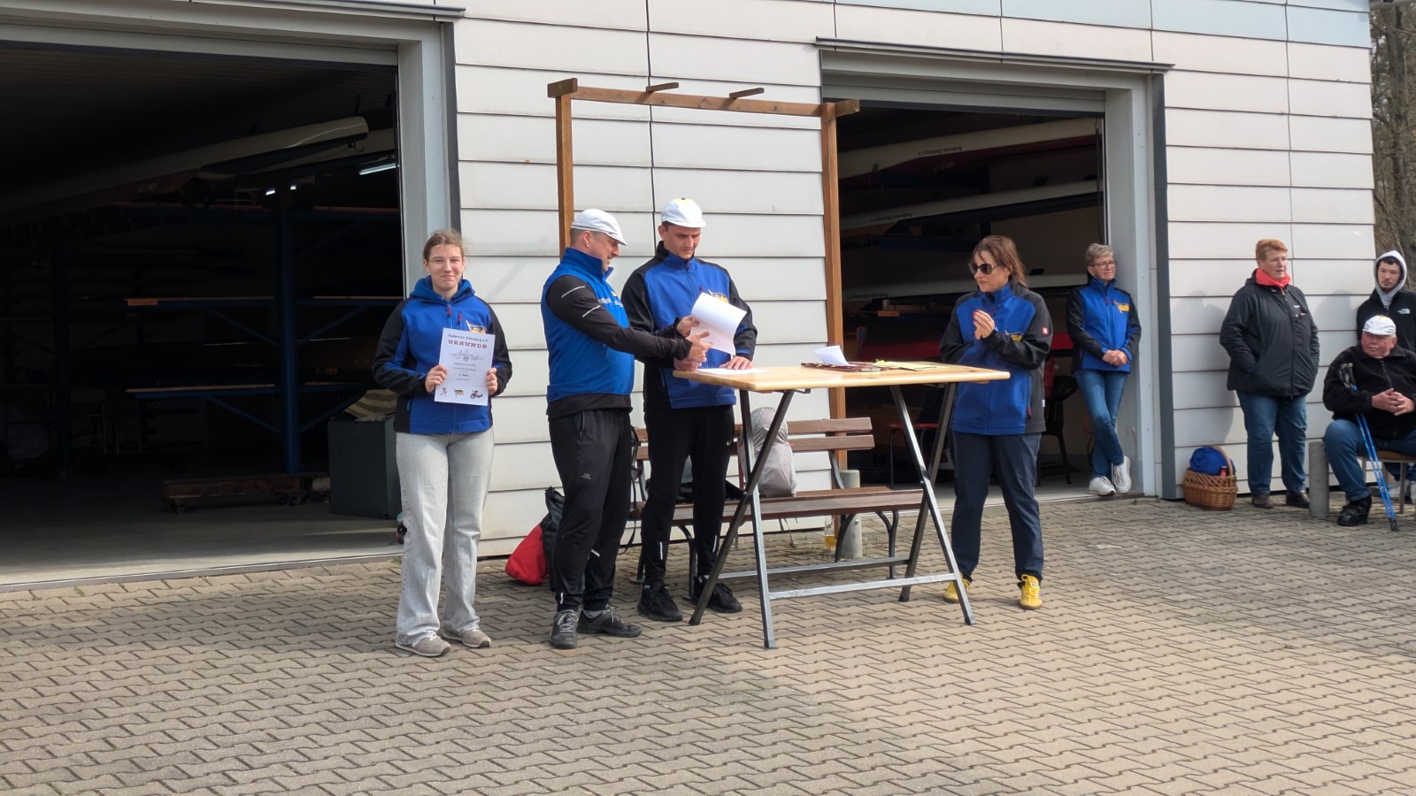 Derweil wurden vor der Bootshalle schon Boote vorbereitet und Besatzungen zusammengelistet. Pünktlich begrüßte die Vorsitzende Silke Gans die neue Saison mit der Ansprache, den Belehrungen, dem Rückblick auf die vergangene Winterpause und die Vorschau auf das Kommende. Sportwart André ehrte die Sieger und Platzierten des Tischtennisturniers, der Ergometer-Meisterschaft und der Women‘s Rowing Challenge. Nach der Aufforderung „Boote zu Wasser und Riemen zur Hand“ nahm die neue Saison an Fahrt auf.