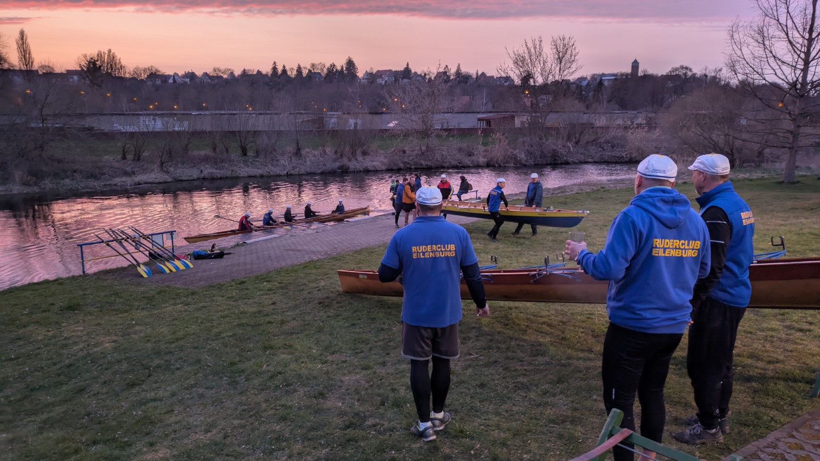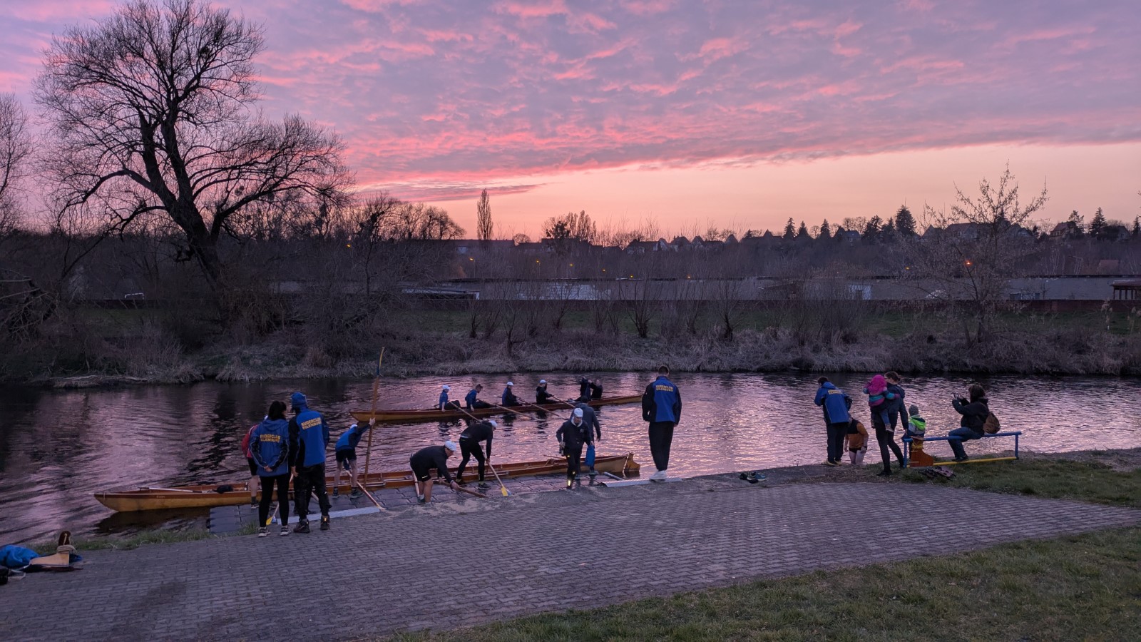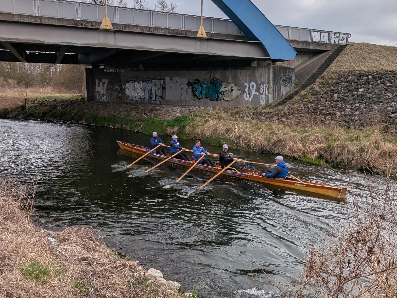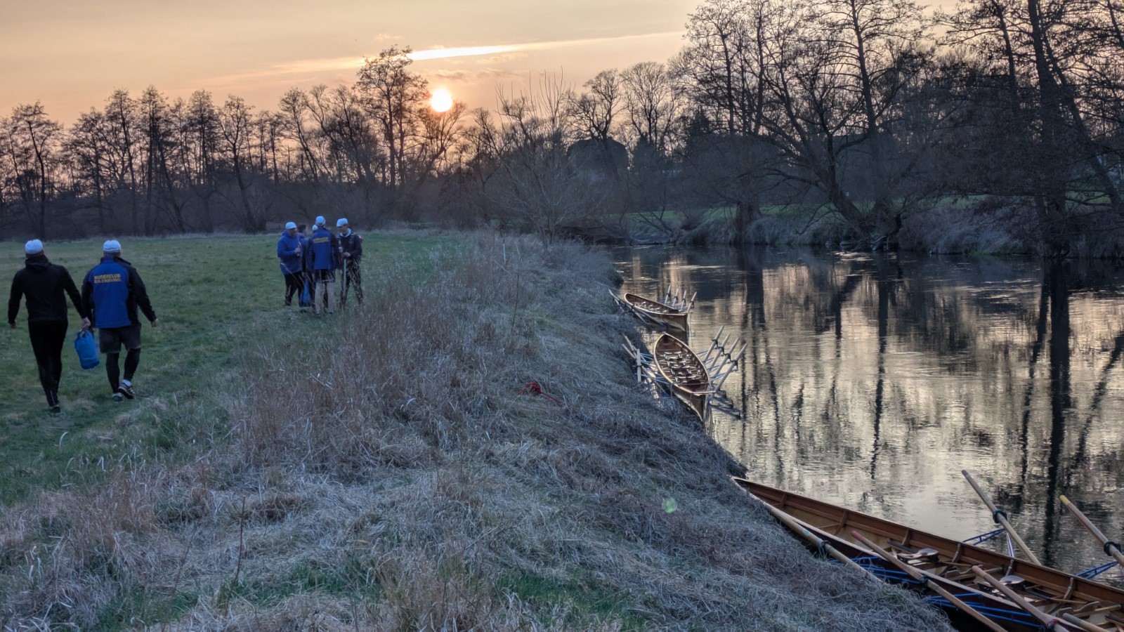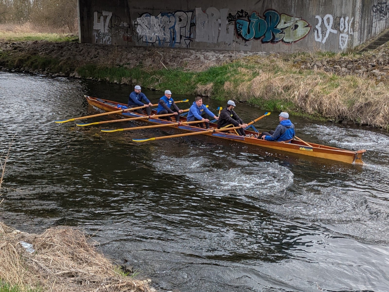 Ein halbes Dutzend Gigs wurden den Mühlgraben aufwärts gerudert. Wer sich sonst noch vom Kaffeekränzchen loseisen konnte, nahm das Fahrrad. In fröhlicher Runde fand man auf der Uferwiese wieder zusammen. Dank des üblichen Knäckerchens musste niemand frieren oder hungern. Verdursten ist sowieso nie eine Option. Mehr oder weniger trocken wurde bei untergehender Sonne der heimische Steg erreicht. Im Bootshaus gab es dann wie immer den gemütlichen Ausklang. Vielen Dank allen, die zum gelungenen Saisonauftakt beigetragen haben.