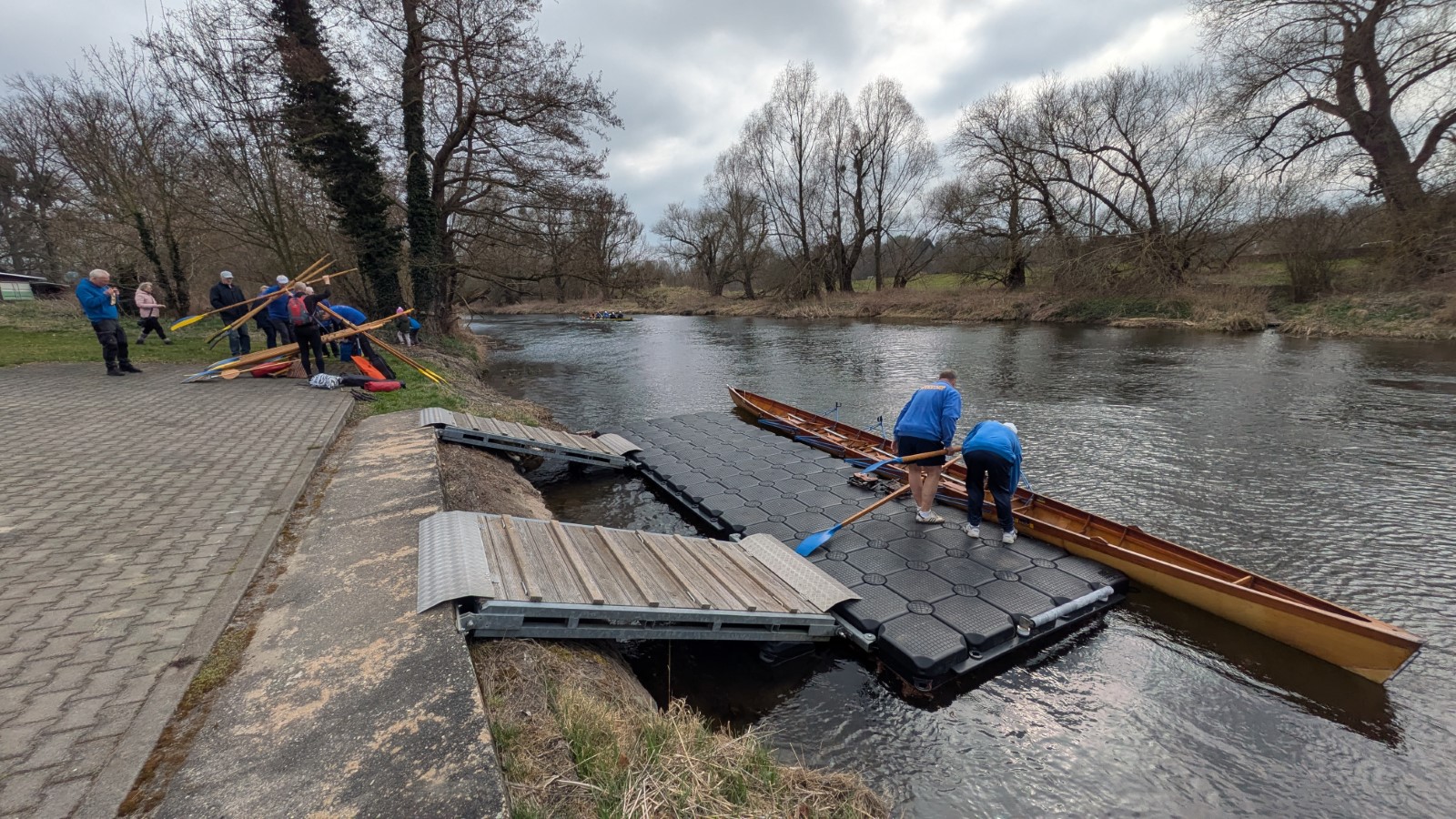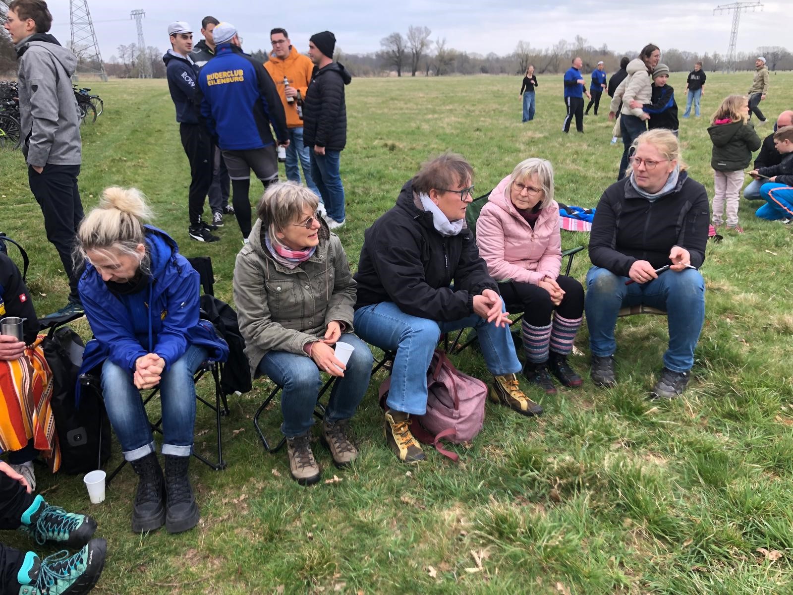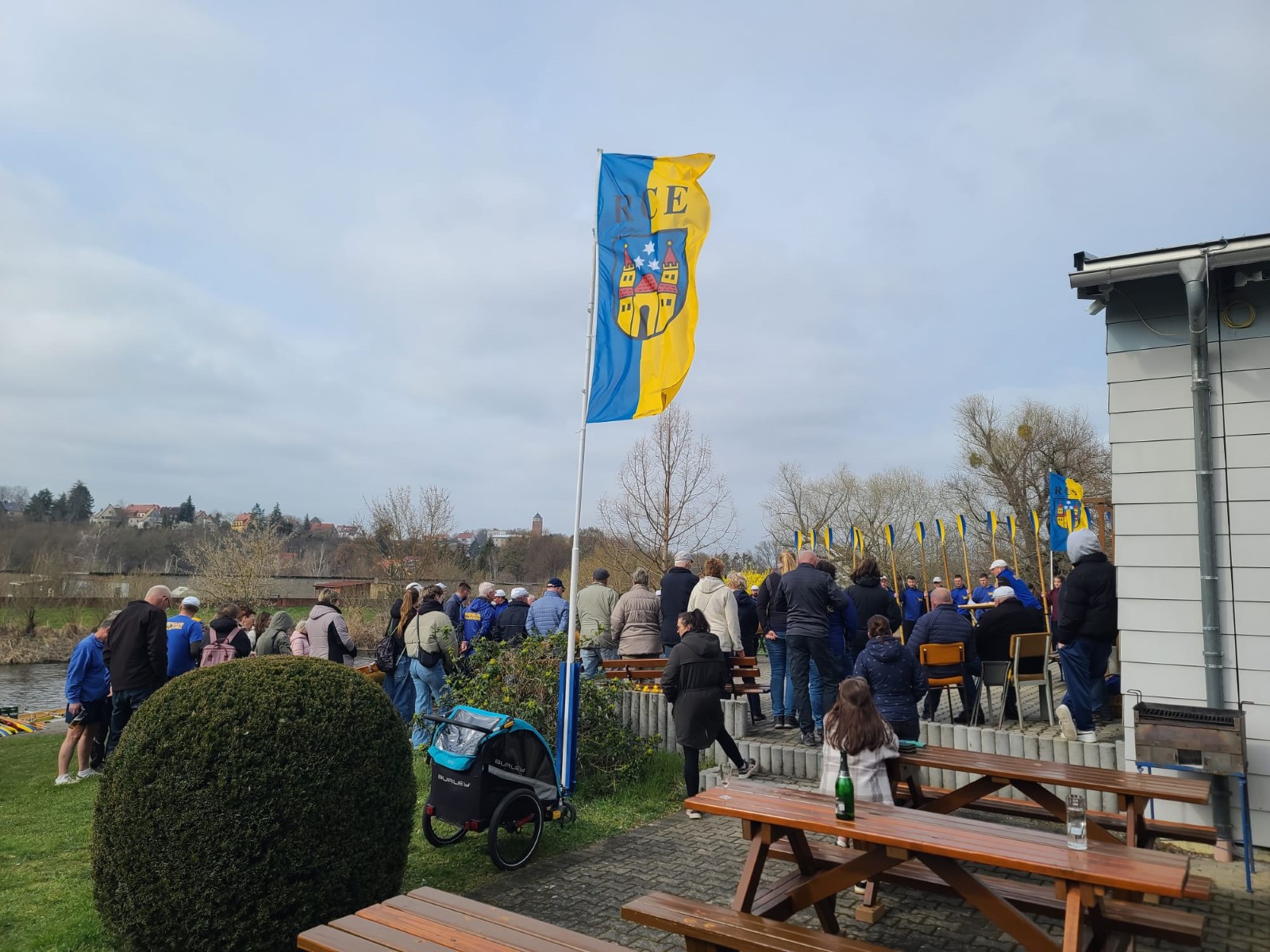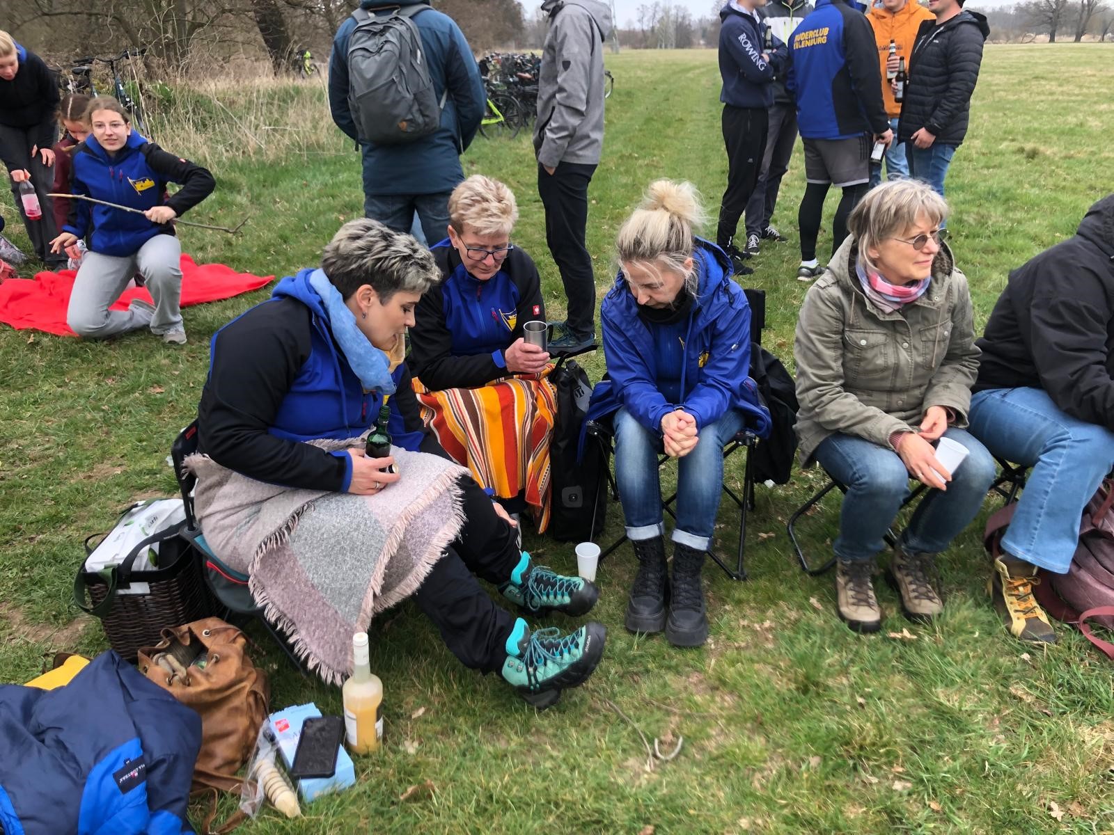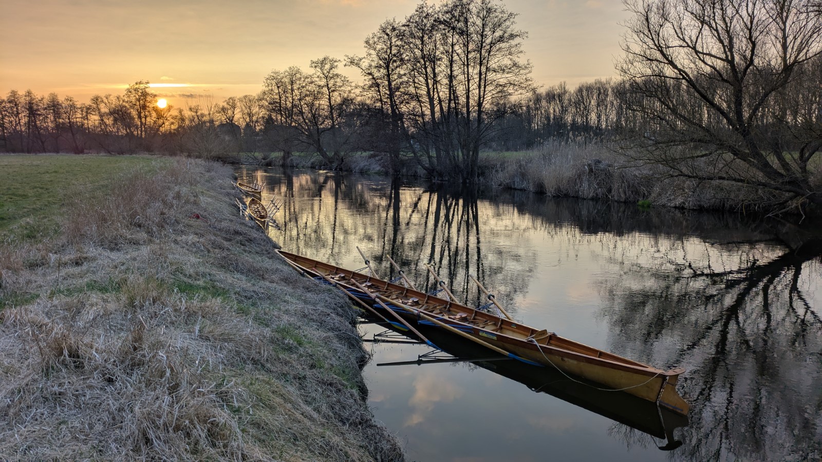 Ein halbes Dutzend Gigs wurden den Mühlgraben aufwärts gerudert. Wer sich sonst noch vom Kaffeekränzchen loseisen konnte, nahm das Fahrrad. In fröhlicher Runde fand man auf der Uferwiese wieder zusammen. Dank des üblichen Knäckerchens musste niemand frieren oder hungern. Verdursten ist sowieso nie eine Option. Mehr oder weniger trocken wurde bei untergehender Sonne der heimische Steg erreicht. Im Bootshaus gab es dann wie immer den gemütlichen Ausklang. Vielen Dank allen, die zum gelungenen Saisonauftakt beigetragen haben.
