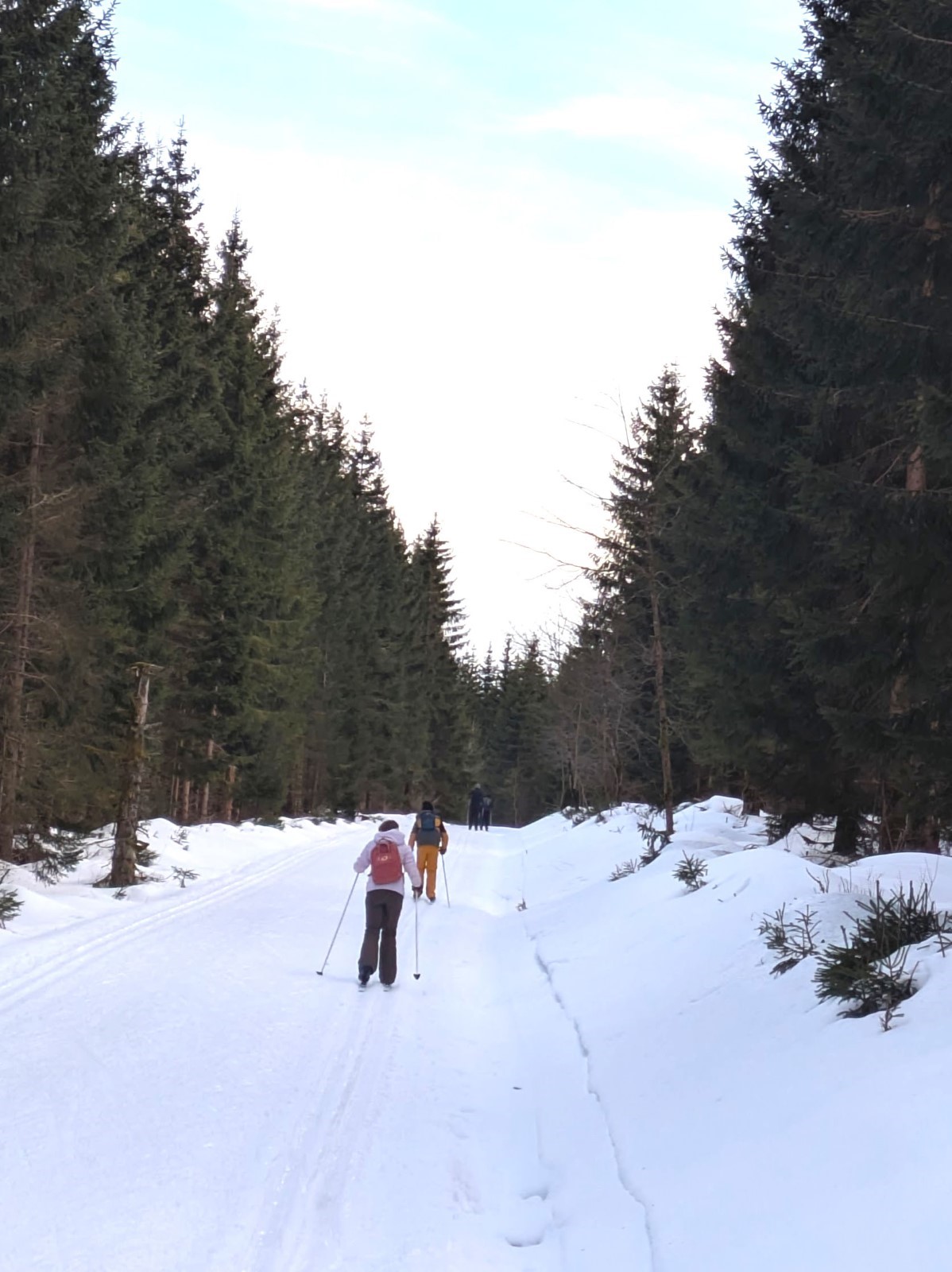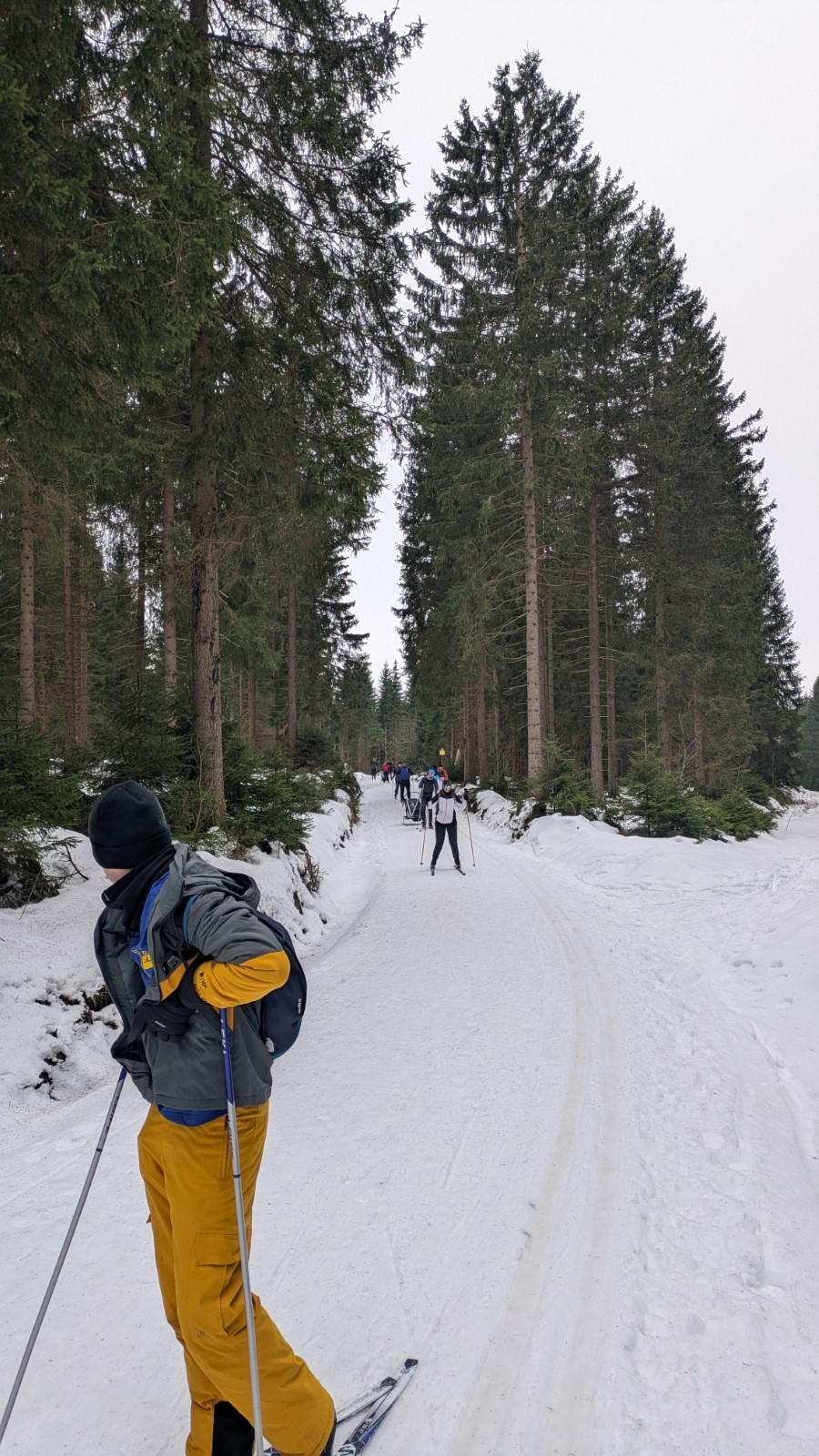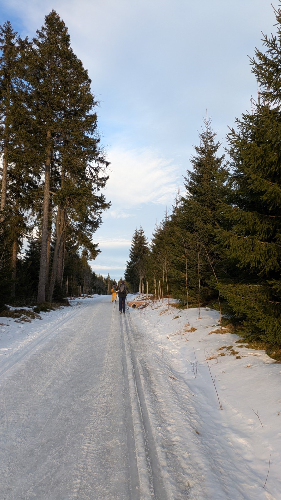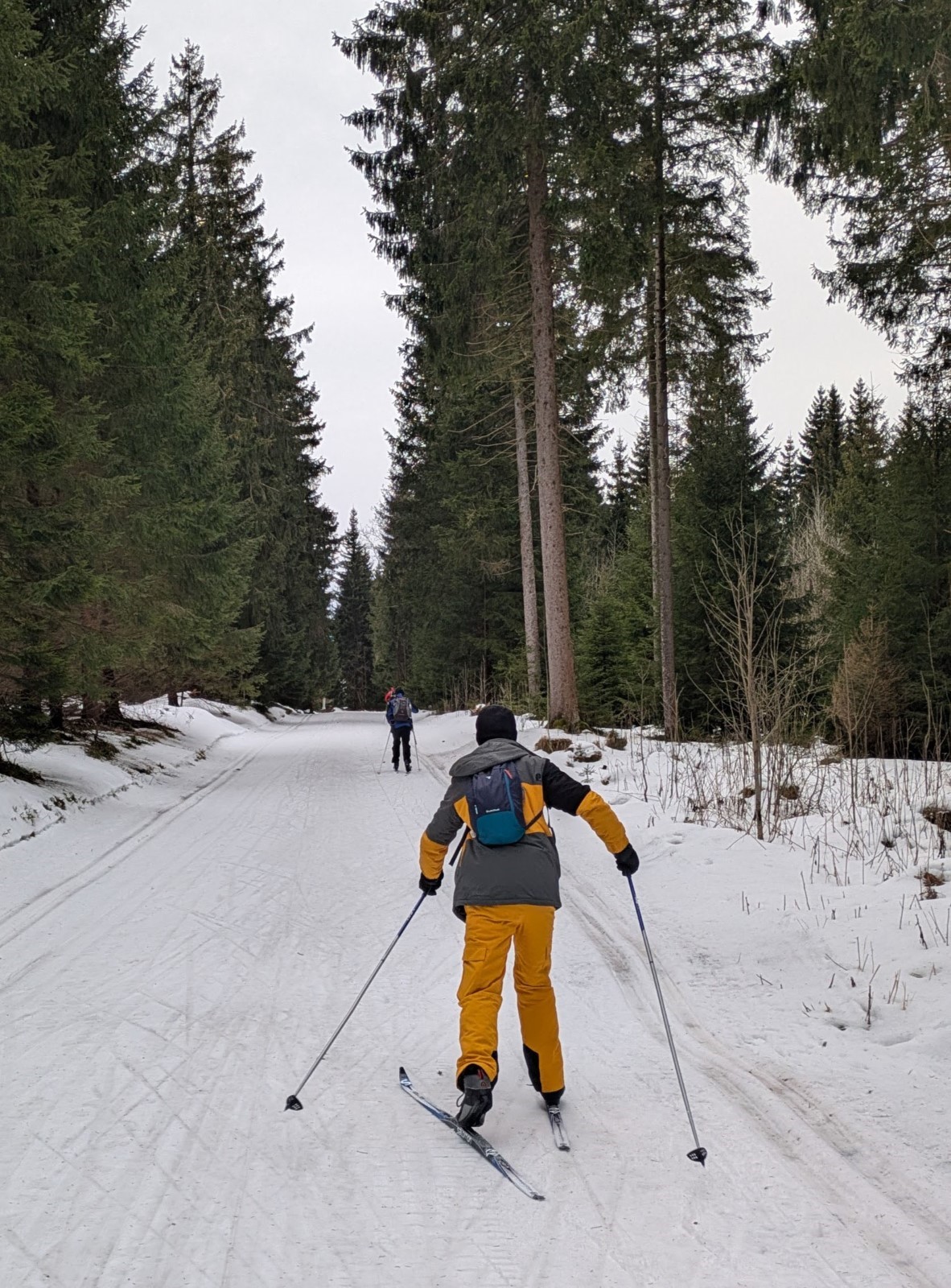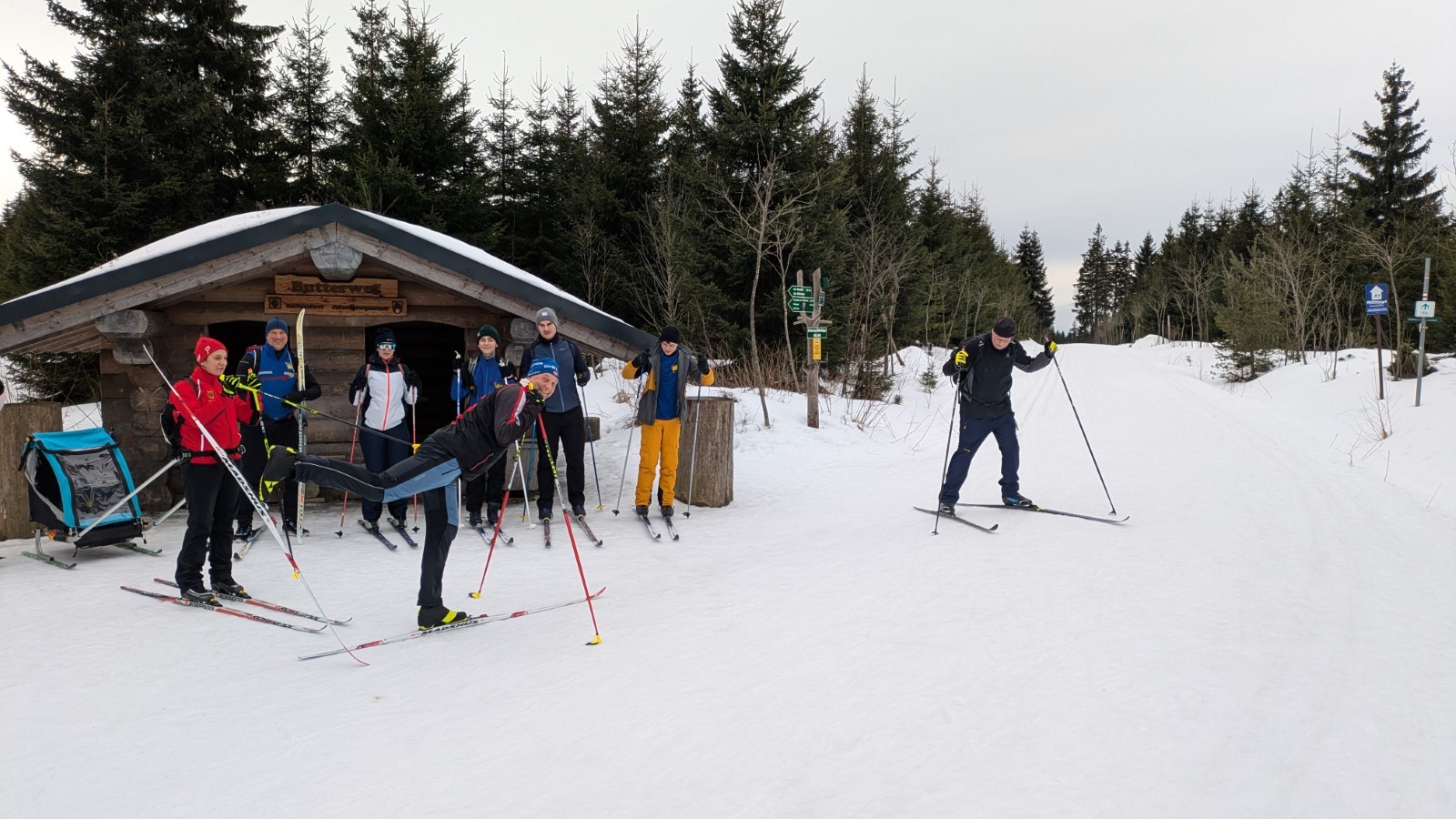 Vorwort: Wettermäßig war ziemliches Glück im Spiel. Bei zweistelligen Temperaturen zu Hause war noch beim Start am Loipenhaus unklar, ob der Schnee zum Skilanglauf reicht. Der Einstieg in die Loipe war jedesmal aufgrund Eisglätte eine Herausforderung, besonders für Ungeübte. Nach amtlicher Bergauf-Rutschpartie lief es besser und besser. Wenn man dann passagenweise den Hochwald hinter sich lassen konnte, kam sogar noch echtes Langlauf-Feeling auf. Die Tour wurde durch Klaus Winter, Riho Berlin, hervorragend angeleitet und ausgerüstet. Es folgt der Bericht teilnehmender Nachwuchsreporter.