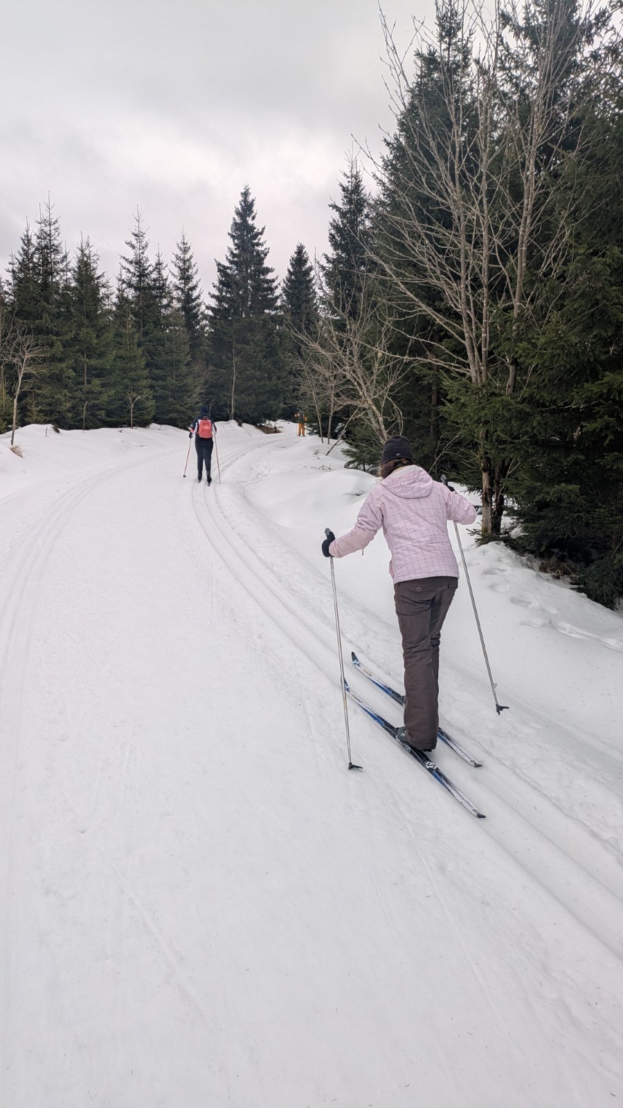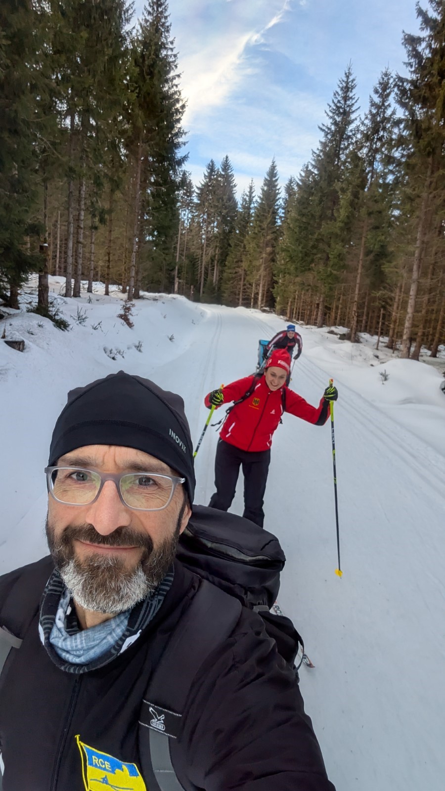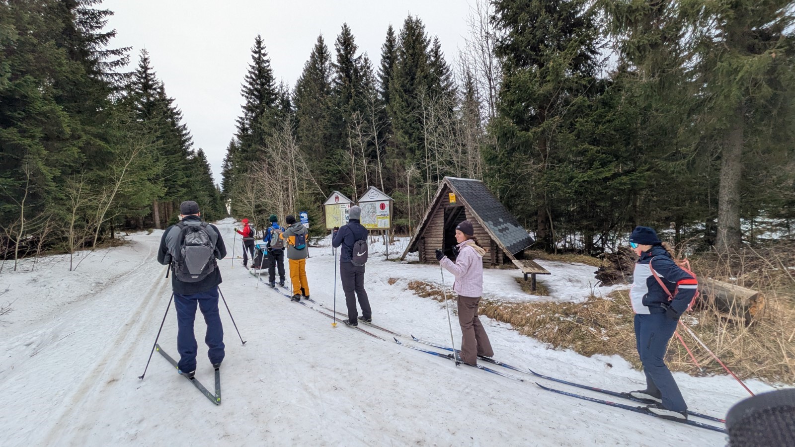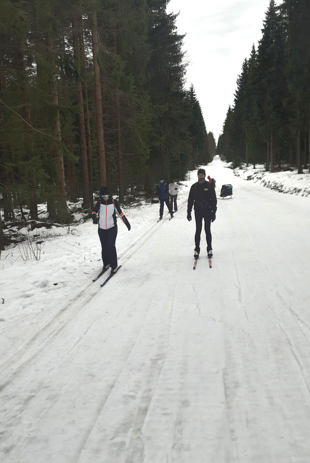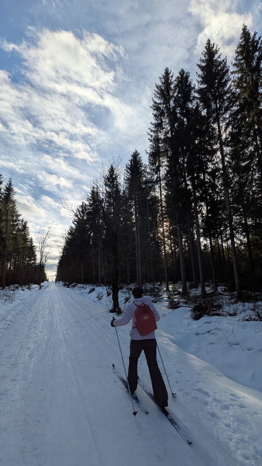 Vorwort: Wettermäßig war ziemliches Glück im Spiel. Bei zweistelligen Temperaturen zu Hause war noch beim Start am Loipenhaus unklar, ob der Schnee zum Skilanglauf reicht. Der Einstieg in die Loipe war jedesmal aufgrund Eisglätte eine Herausforderung, besonders für Ungeübte. Nach amtlicher Bergauf-Rutschpartie lief es besser und besser. Wenn man dann passagenweise den Hochwald hinter sich lassen konnte, kam sogar noch echtes Langlauf-Feeling auf. Die Tour wurde durch Klaus Winter, Riho Berlin, hervorragend angeleitet und ausgerüstet. Es folgt der Bericht teilnehmender Nachwuchsreporter.
