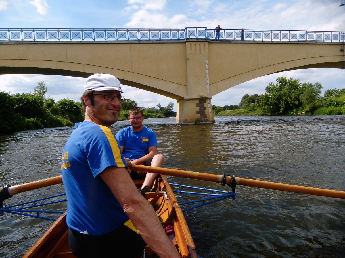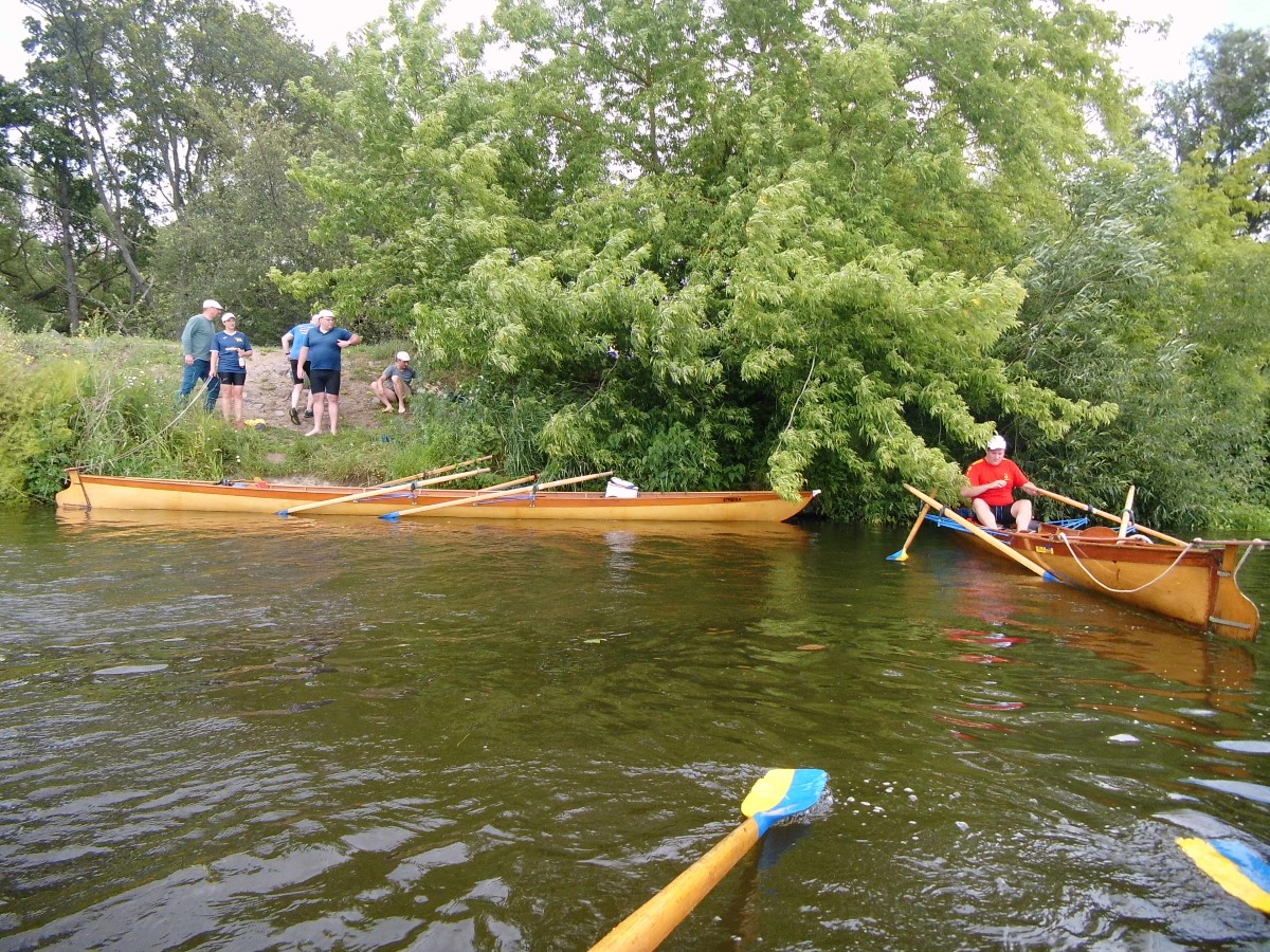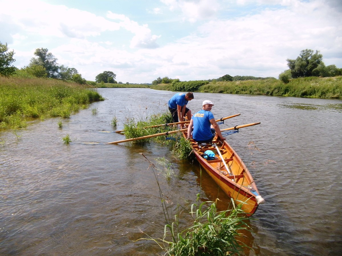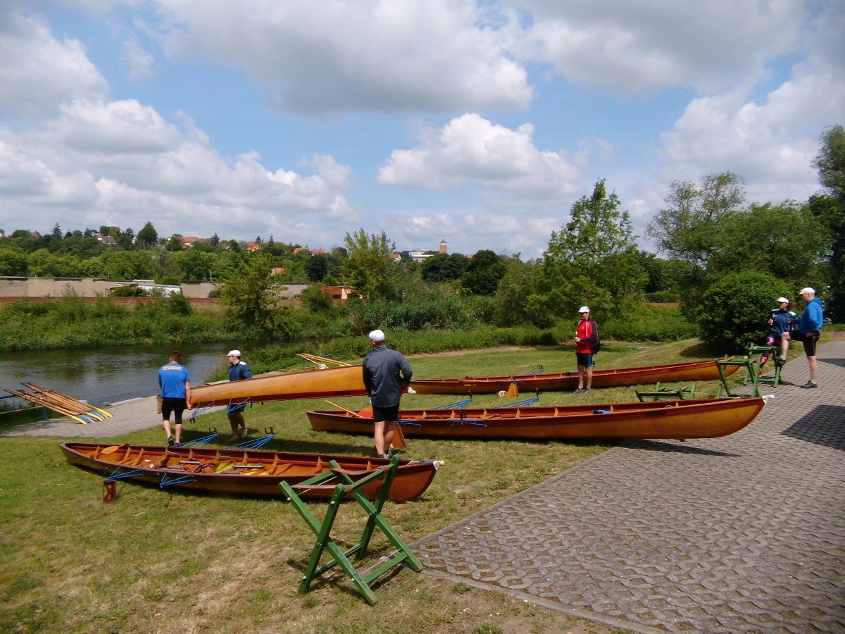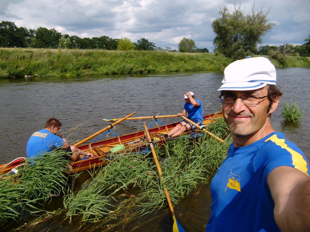 Vier bestens befüllte Gig-Doppelzweier mit Steuermann, ein 2-Mann-Landdienst und ein bisschen Optimismus. - Mehr brauchte es nicht, um anstatt der „Großen" regulären Wanderfahrt eine kleine aber feine Fahrt über den heimischen Mühlgraben auf die Mulde hinaus zu improvisieren. Der Muldepegel gab ebenfalls sein bestes, Dank wohl dosierter Regengaben im Vorfeld. Dennoch war Obacht angesagt. Nach vielfältig platziertem Großgehölz in den ersten 7 Kilometern Fahrrinne warteten standardmäßig die kiesigen Untiefen der Mulde.