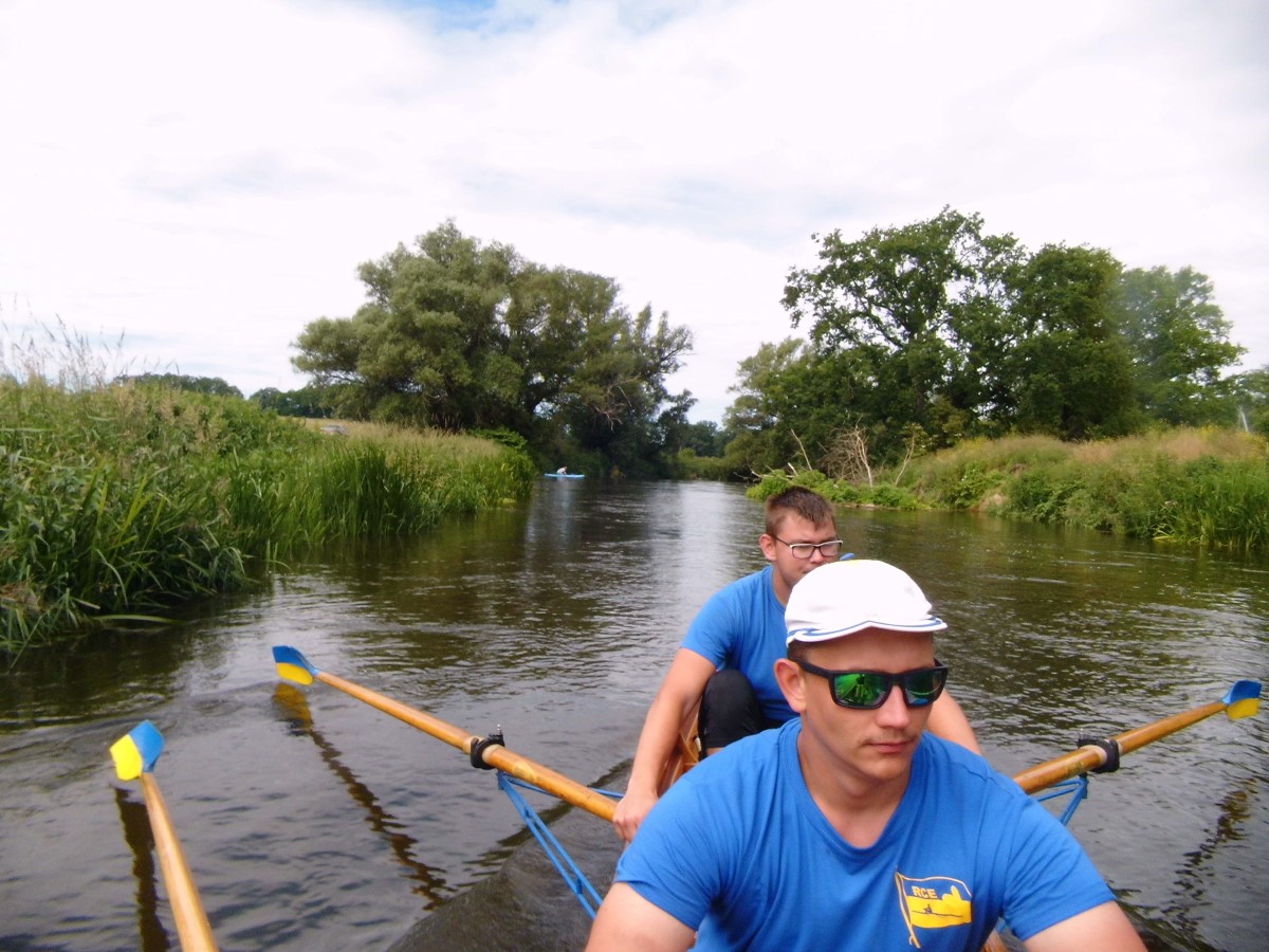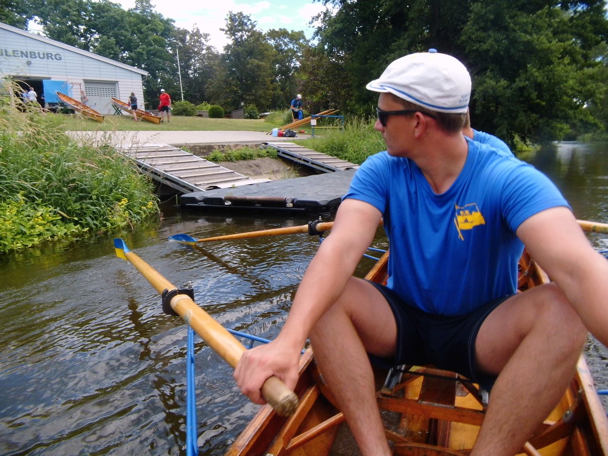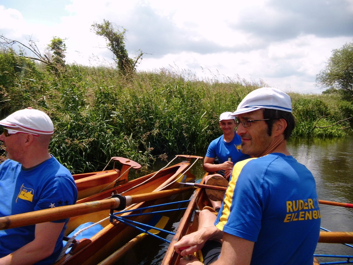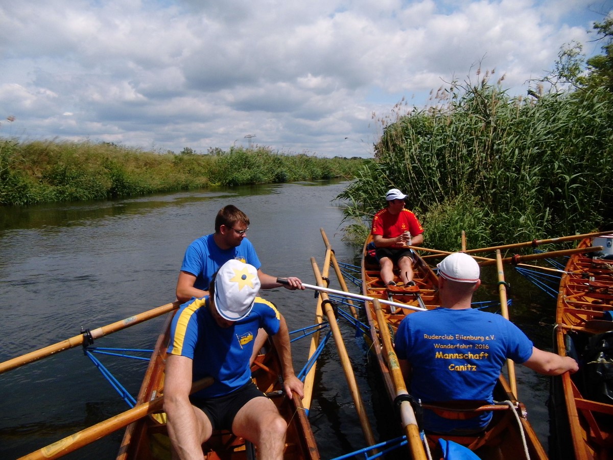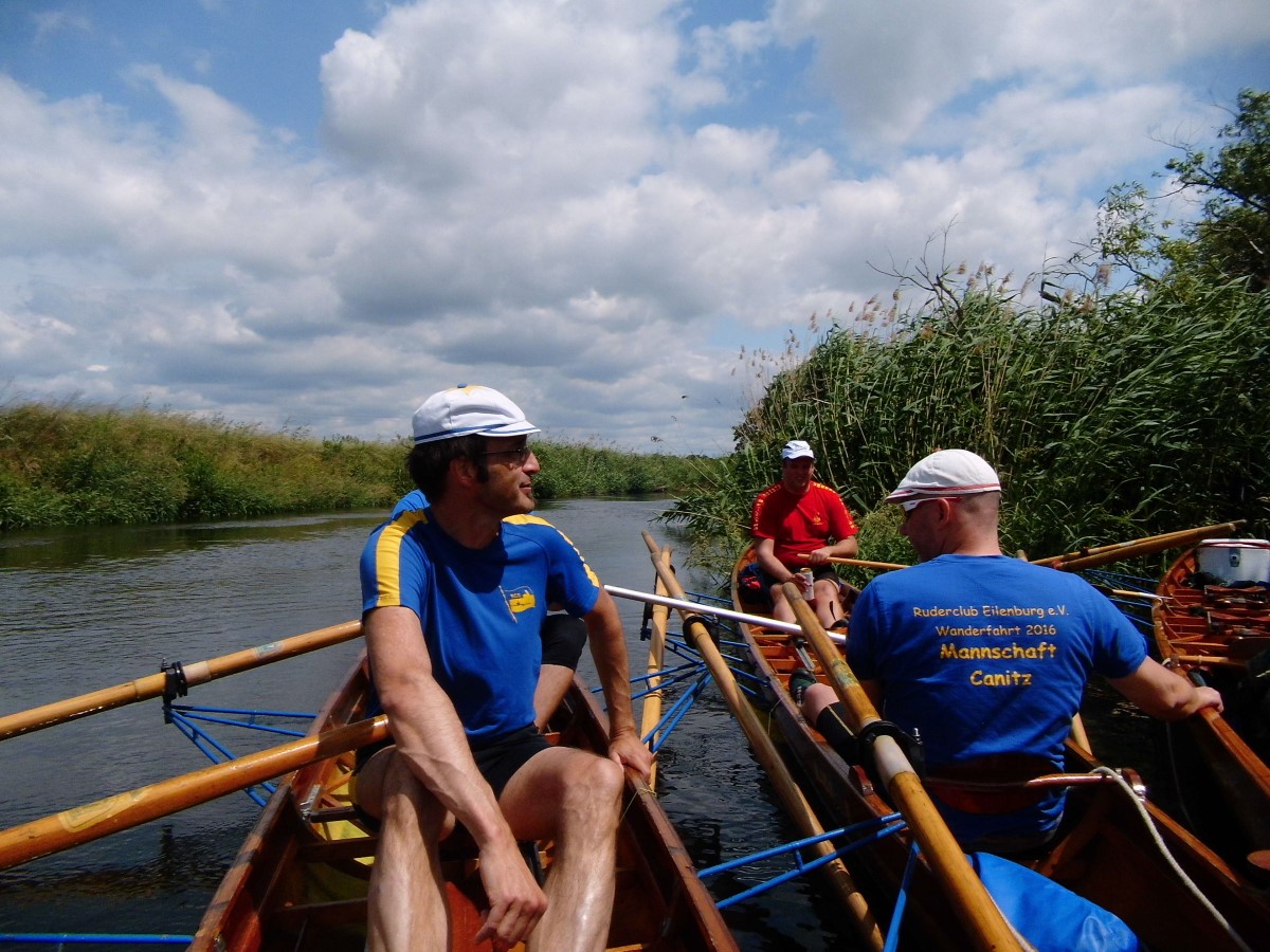 Vier bestens befüllte Gig-Doppelzweier mit Steuermann, ein 2-Mann-Landdienst und ein bisschen Optimismus. - Mehr brauchte es nicht, um anstatt der „Großen" regulären Wanderfahrt eine kleine aber feine Fahrt über den heimischen Mühlgraben auf die Mulde hinaus zu improvisieren. Der Muldepegel gab ebenfalls sein bestes, Dank wohl dosierter Regengaben im Vorfeld. Dennoch war Obacht angesagt. Nach vielfältig platziertem Großgehölz in den ersten 7 Kilometern Fahrrinne warteten standardmäßig die kiesigen Untiefen der Mulde.