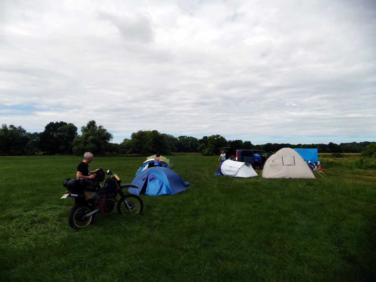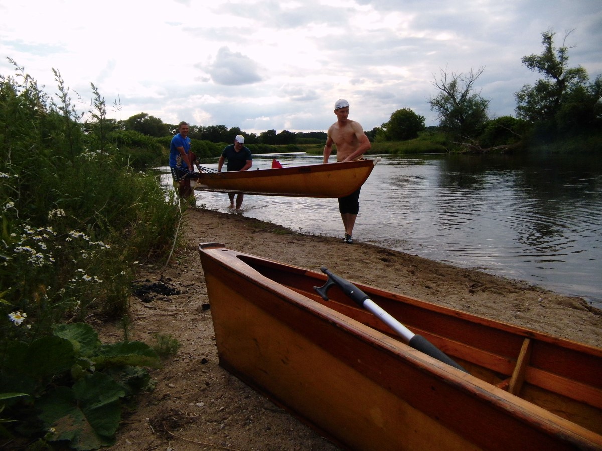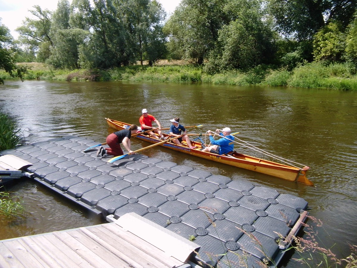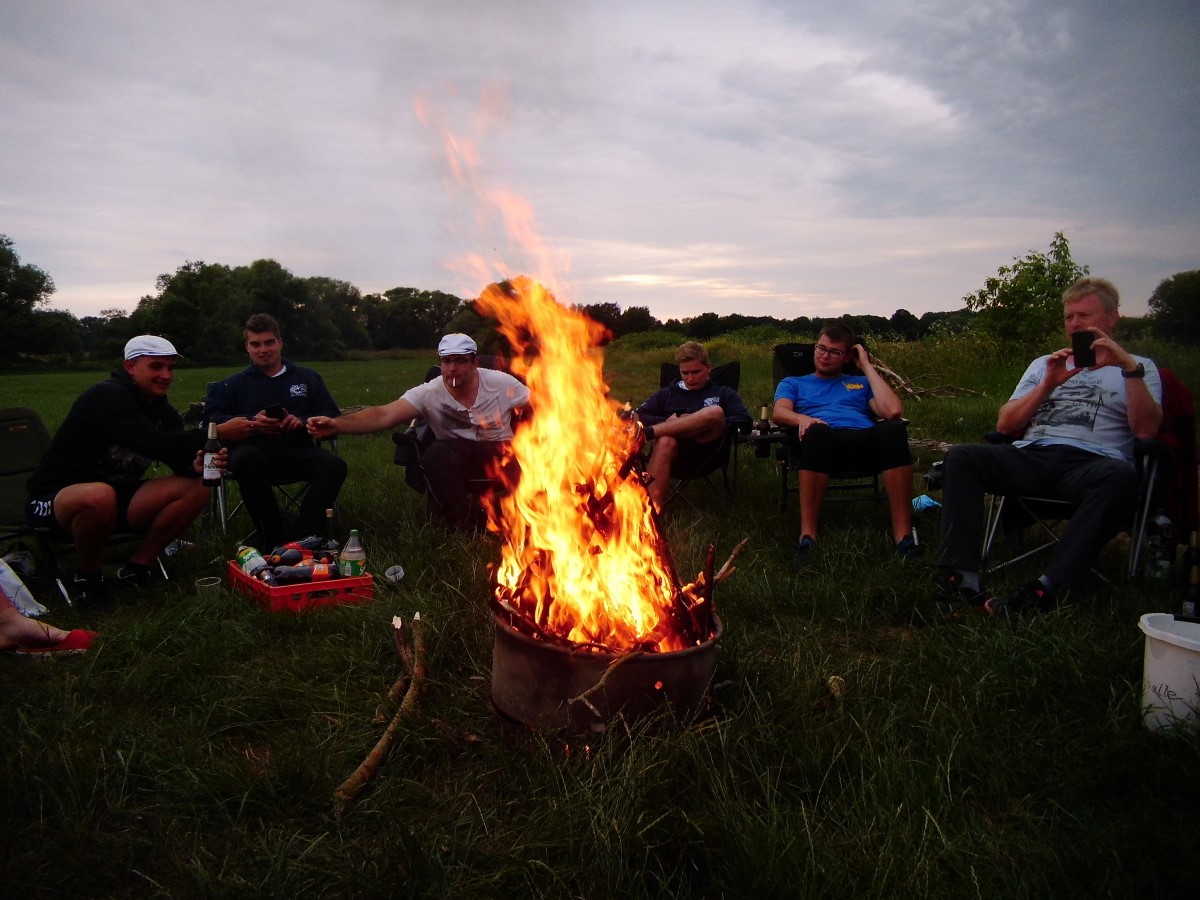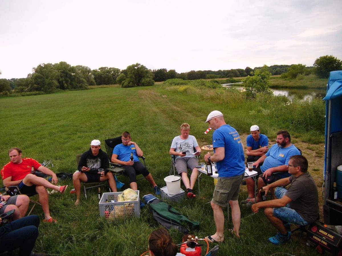 Zum Warmup wurde am Freitagabend am Bootshaus gegrillt und entsprechende Geselligkeit bis zur Morgendämmerung gepflegt. Am späten Samstagvormittag kamen dann endlich die Boote aufs Wasser. Ohne Eile und mit den gebotenen Boxenstops erreichte man komplikationslos den Bobritzer Damm, wo nochmals ausgedehnt pausiert wurde. Die Mannschaft der „Schwalbe" hatte geplant, den vorgesehenen Landeplatz zwischen Groitzsch und Püchau vorerst zu passieren und zumindest bis zur Brücke in Canitz zu fahren. Dieses wurde dank kräftigem Schiebewind gegen die mitunter ordentliche Strömung ohne weiteres umgesetzt. Man erreichte nach der Umkehr dennoch als erstes Boot das Lager. Hier duftete es schon lecker aus zweierlei Dutch-Ofen-Kesseln nach "Johnnys Kanada-Töpfchen" und Käsekuchen. Veikko und Peter hatten ganze Arbeit geleistet, um die entbehrungsreiche Anfahrt zu kompensieren. Nach und nach trudelten alle Besatzungen mehr oder weniger versehrt am Zielpunkt ein. Das gute alte Panzertape... Aus traditioneller Verbundenheit stießen noch einige Landratten mit unterschiedlicher Motorisierung zur Truppe hinzu. Bei Lagerfeuer und Mucke wurde eine der kürzesten Nächte des Jahres angemessen verbracht.