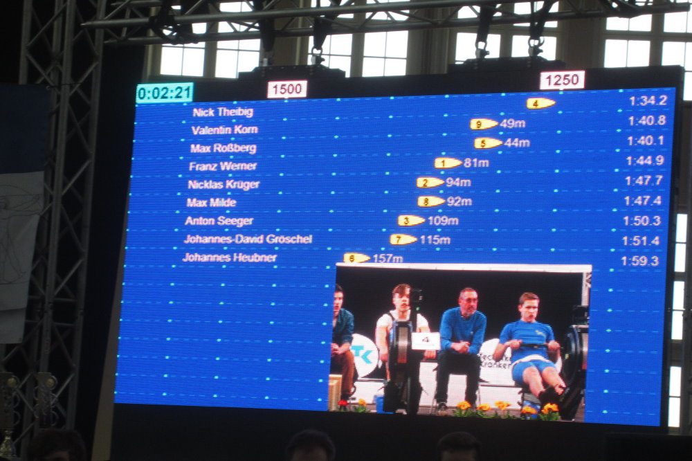 Am 21.2.2015 fand in Leipzig in der Ernst Grube Halle die 1. Mitteldeutsche Ergometermeisterschaft statt. An dieser Saisoneröffnung nahmen etwa 340 Sportler teil, vorwiegend aus Sachsen, aber auch Ruderer aus Thüringen und Sachsen -Anhalt stellten sich dem Wettkampf. Der RCE war mit 5 Sportler/innen vertreten. Die Zielstellung lautete „ persönliche Bestzeit“. Alle Sportler sind schon Junioren und haben somit auch viele Gegner, die wesentlich höhere Trainingsumfänge bewältigen. Als Erste startete Annemarie Fromm, die mit einer Zeit von 8:02 min einen hervorragenden vierten Platz erkämpfte. Schnellster RCE Ruderer über die 2000m war Valentin Korn mit 7:19 und einem 9. Platz. In der gleichen Altersklasse unterbot auch Niclas Gans mit 7:50 min und einem 15. Platz seine persönliche Bestzeit. Malte Jung im Leichtgewicht startend und Tony Palm in AK 17/18 begannen sehr schnell und hielten sich lange im vorderen Drittel. Leider reichten die Kräfte dann am Schluß nicht mehr . Beide erzielten ein achtbares Ergebnis. Malte wurde 6. in 7:47min und Tony erreichte seine Bestzeit von 7:33min. Toll, dass sich diese 5 Sportler der Herausforderung stellten und hier auch Wettkampfhärte bewiesen.